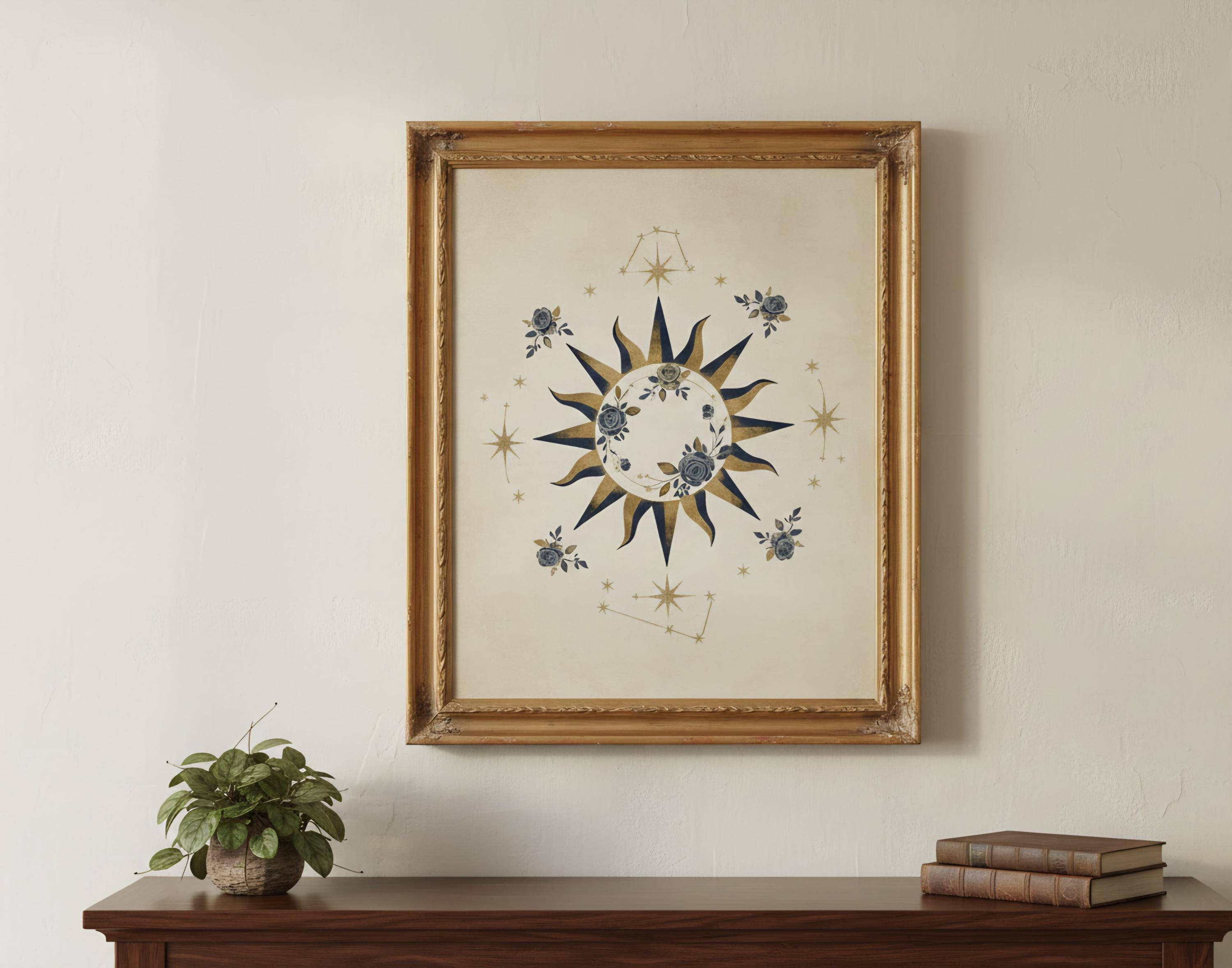 This breathtaking celestial sun rose illustration masterfully blends cosmic power with delicate floral elegance, featuring a bold navy and gold sunburst framed by vintage grey roses. What makes this piece unique is the intricate inclusion of celestial constellations and shimmering stars that surround the central floral wreath, creating a mysterious and scholarly Dark Academia aesthetic. Perfectly suited for gothic wedding invitations, mystical branding, or sophisticated junk journals, this high-quality graphic brings a timeless, ethereal beauty to your creative projects that feels both ancient and enchanting.