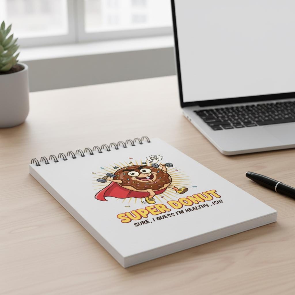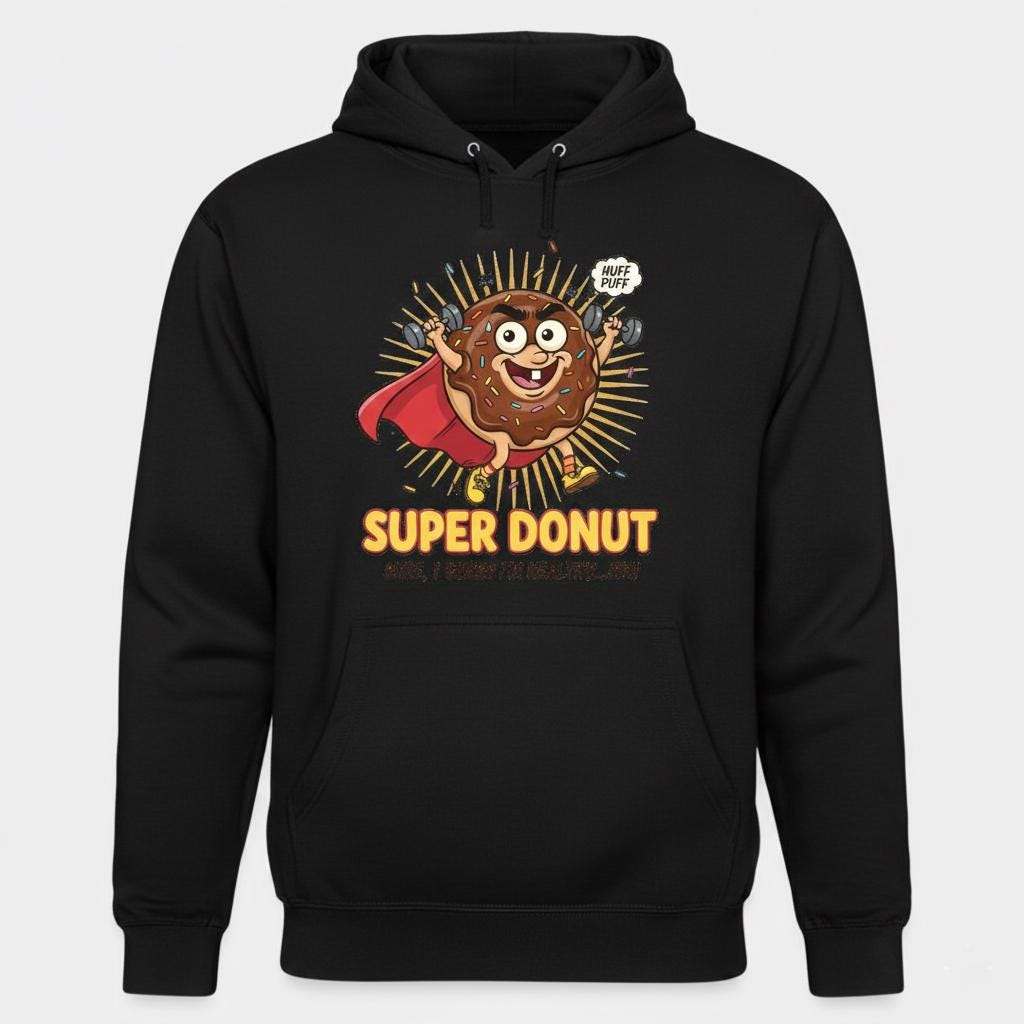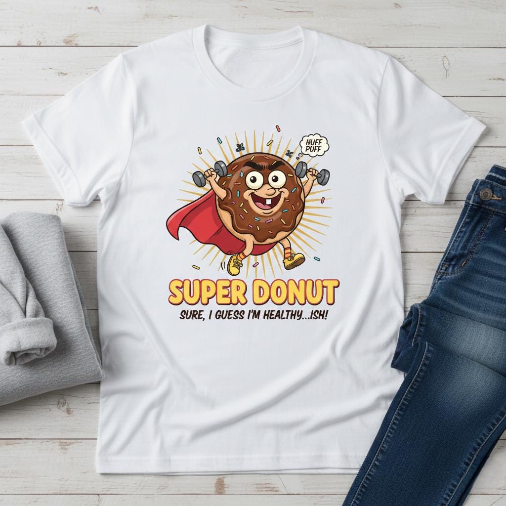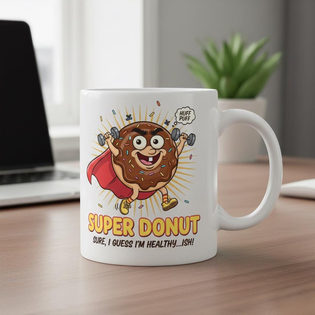 This hilarious "Super Donut" illustration perfectly captures the struggle of staying fit while loving sweets, making it a must-have for fitness enthusiasts with a sense of humor. What makes this piece special is its relatable "Healthy...ish" theme, featuring a determined chocolate donut lifting dumbbells in a superhero cape. The high-energy pop art style, combined with vibrant colors and funny details like the "Huff Puff" speech bubble, creates a motivating yet tongue-in-cheek atmosphere. It’s the ideal decor for home gyms, kitchens, or as a funny gift for your favorite gym buddy who knows that balance is everything.
