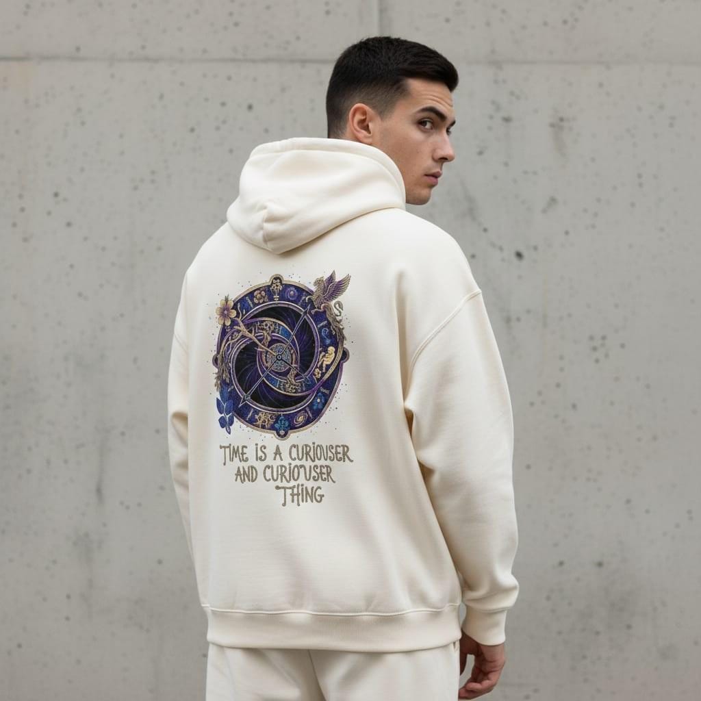 This design captures the whimsical and mysterious essence of time through an intricate celestial clock and the iconic 'Curiouser and Curiouser' philosophy. Featuring mythical creatures, cosmic elements, and vintage-style floral details, it merges fantasy storytelling with fine art. It’s the perfect piece for dreamers, stargazers, and those who find magic in the unexplained layers of existence