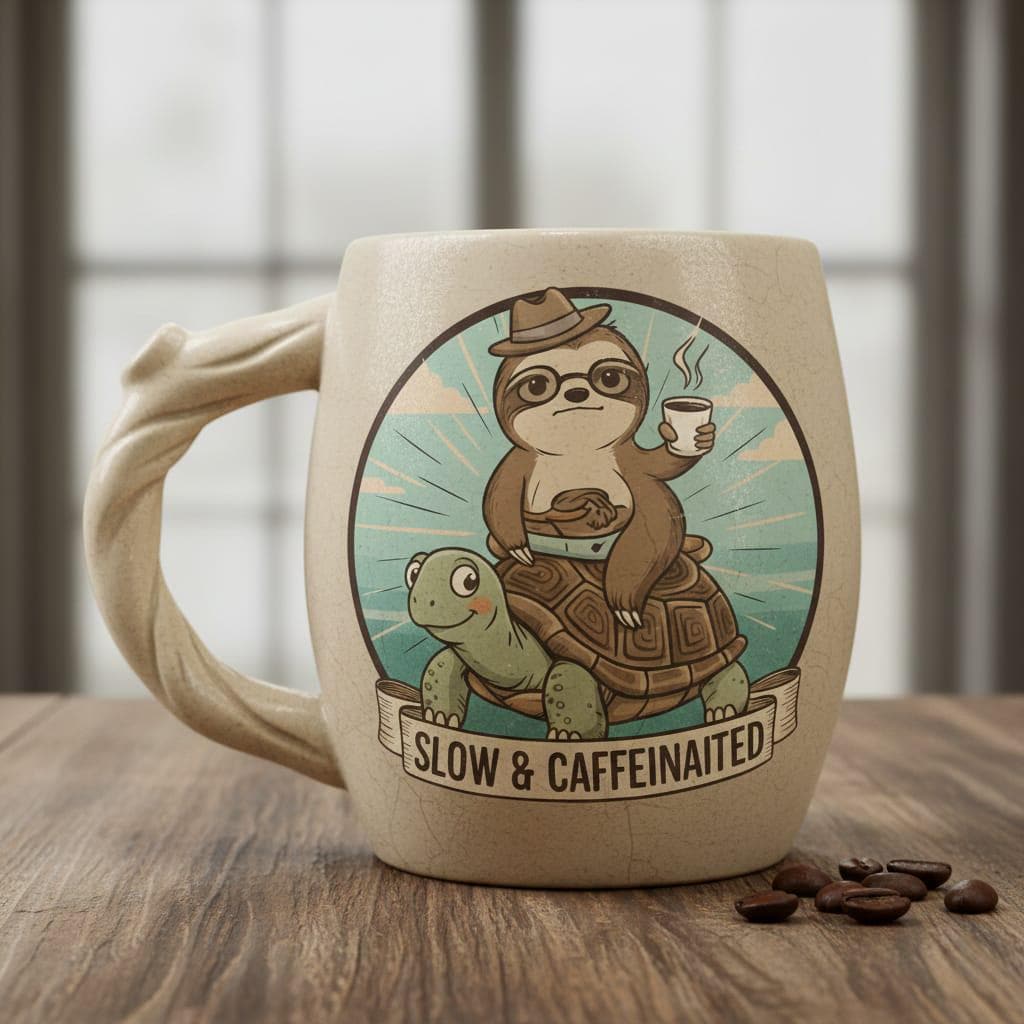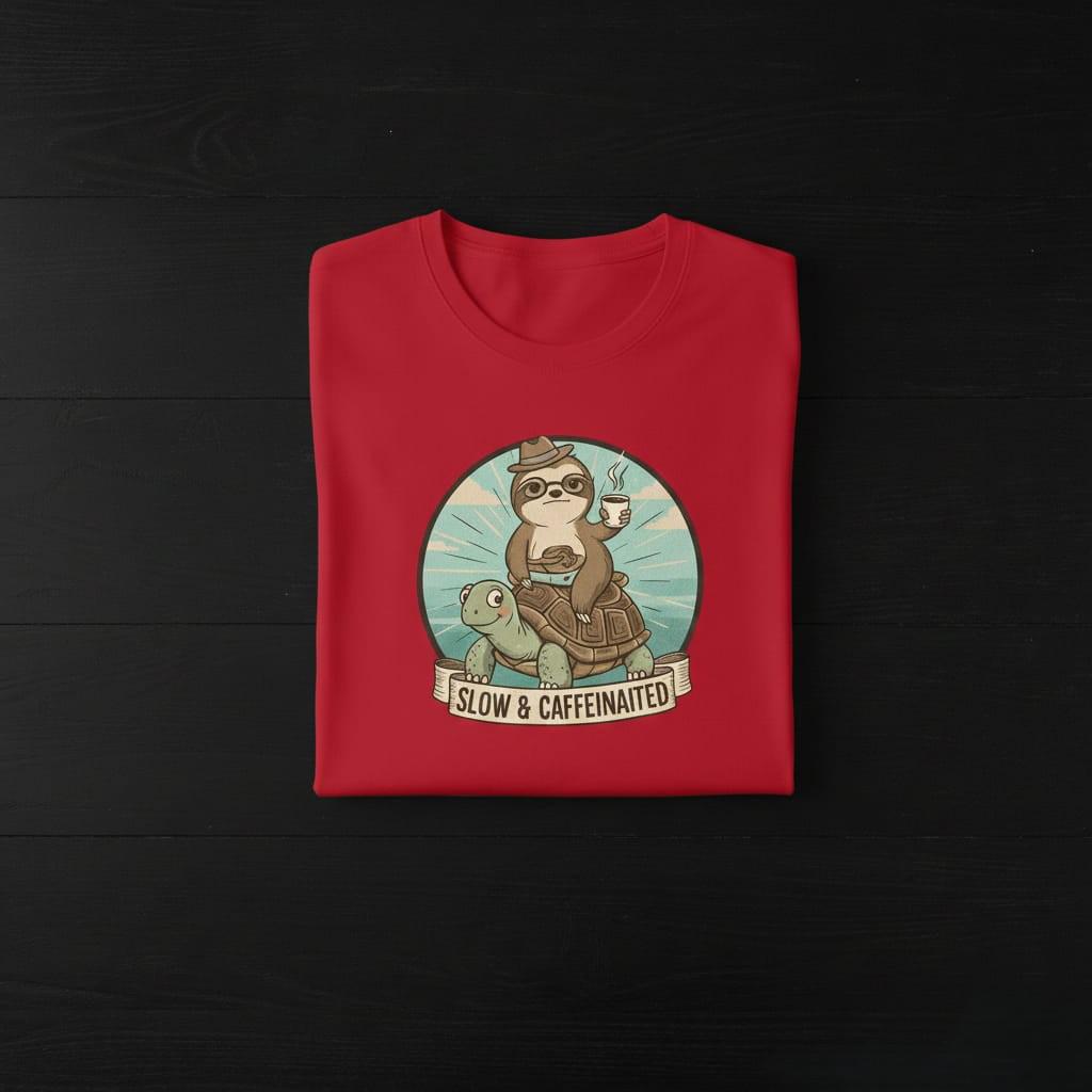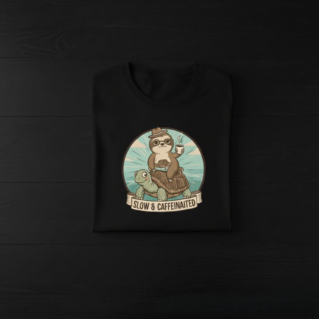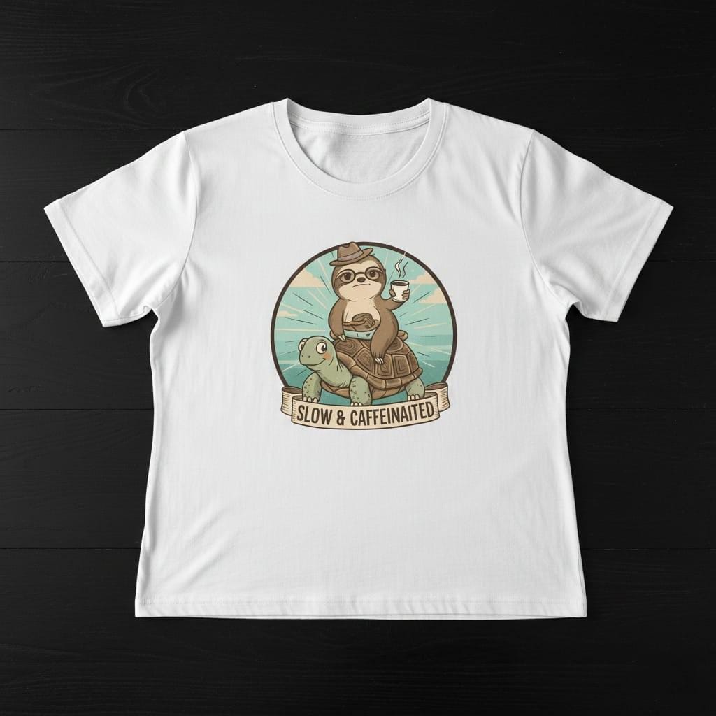 Embrace your morning pace with our 'Slow & Caffeinated' graphic tee. This hilarious and charming design features a coffee-loving sloth hitching a ride on a friendly turtle, capturing the ultimate 'not a morning person' vibe. With its vintage storybook aesthetic and witty slogan, it’s a perfect conversation starter for office days, weekend brunches, or cozy coffee shop visits. A wonderful gift for sloth lovers, caffeine addicts, and anyone who believes life is a marathon, not a sprint