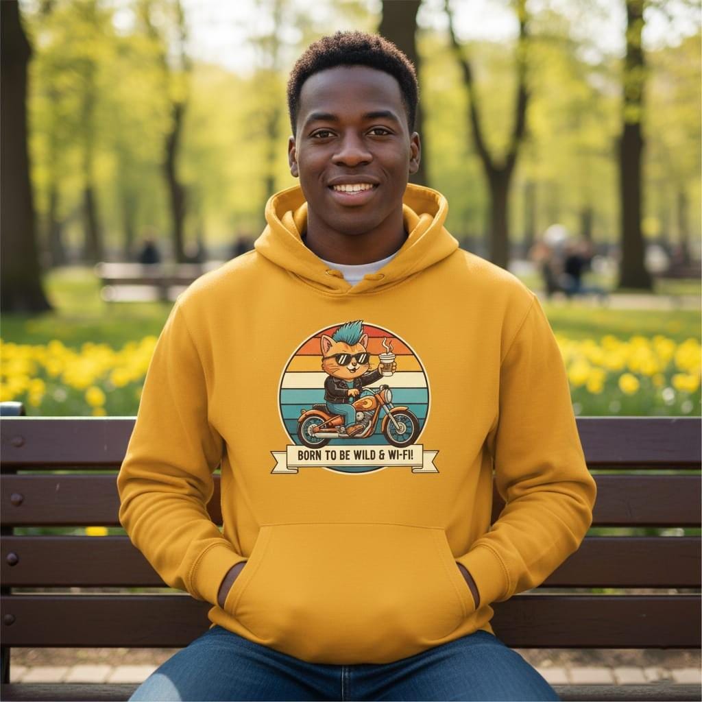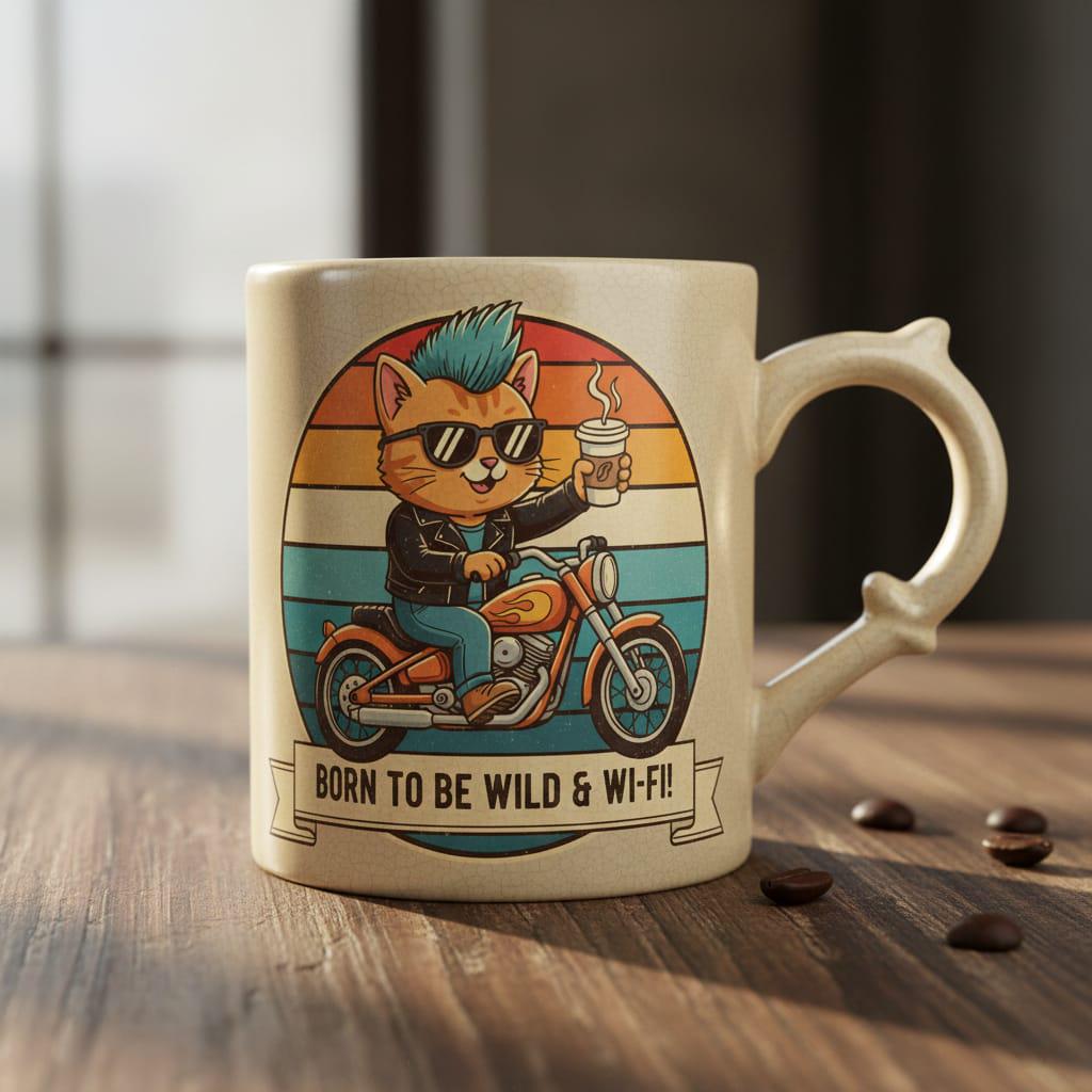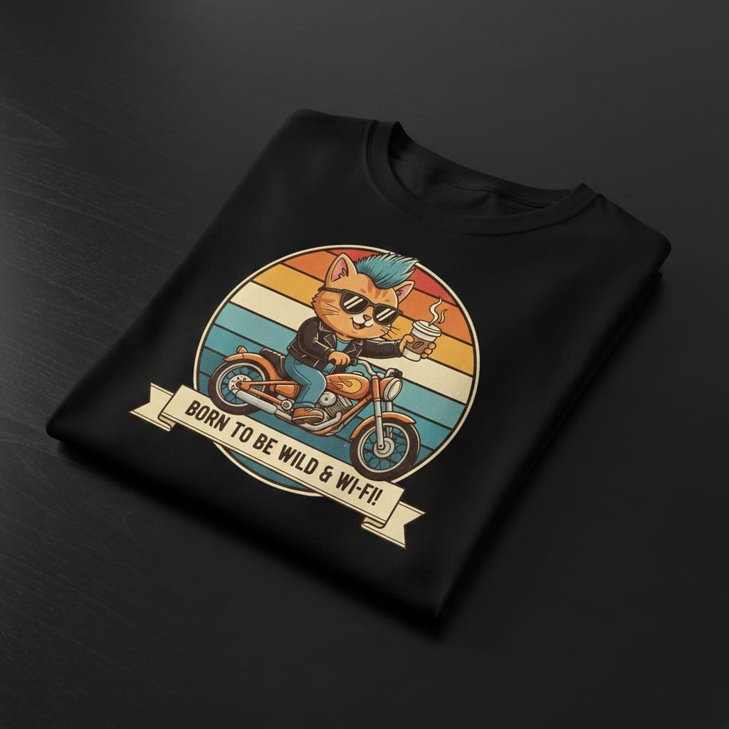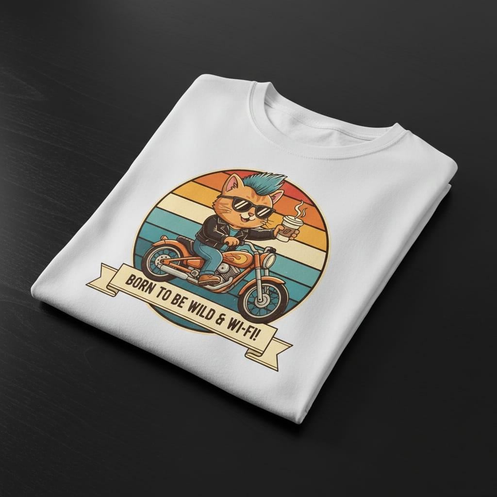 Live life on the edge—but keep the connection strong with our 'Born to be Wild & Wi-Fi!' tee. This vibrant design features a cool punk rock cat with a blue mohawk, cruising on a classic motorcycle while holding his favorite cup of coffee. Set against a retro sunset backdrop, it perfectly blends the rebellious spirit of a biker with the modern necessity of high-speed internet. An ideal gift for tech enthusiasts, digital nomads, and cat lovers who have a wild side and a caffeine addiction