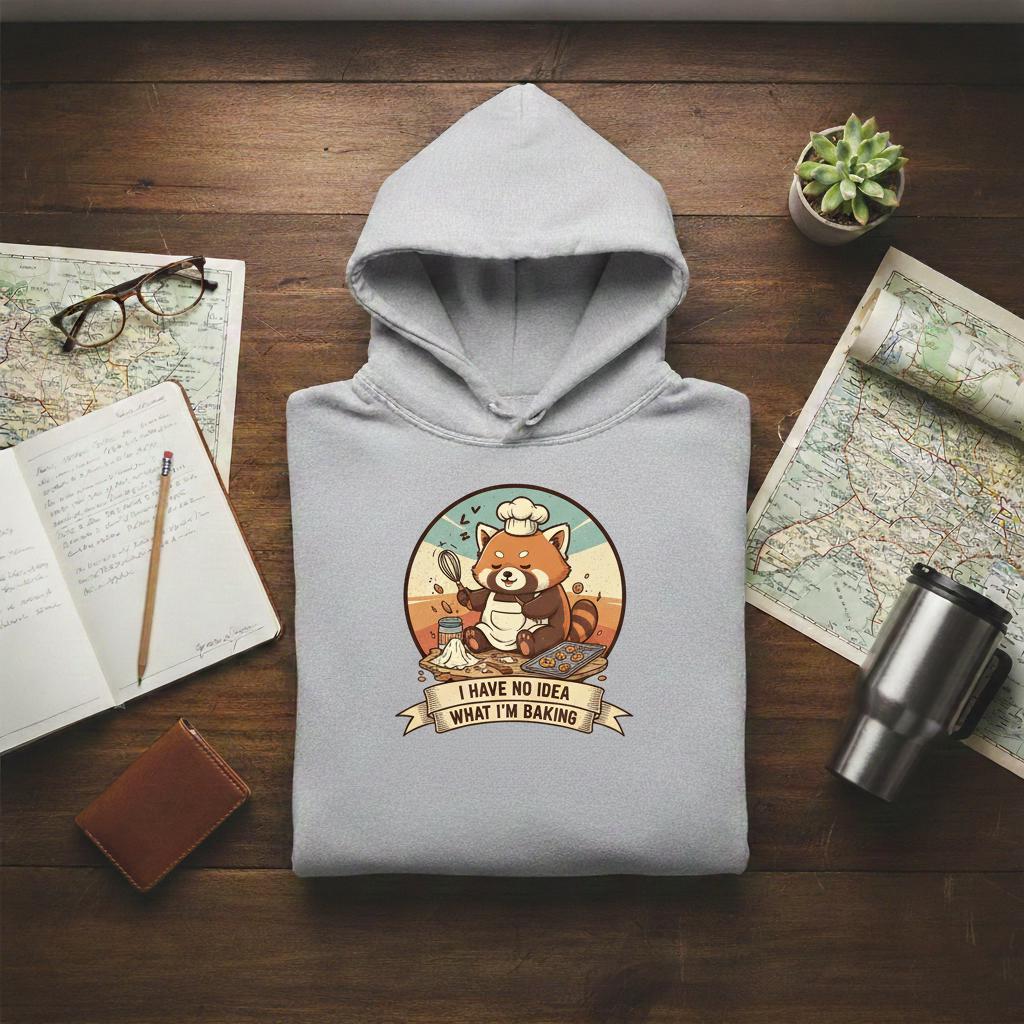 This design is special because it captures the perfectly relatable chaos of baking with a cute twist—a sleepy red panda chef in an apron holding a whisk, surrounded by flour, ingredients, and a cookie tray, paired with the hilarious quote “I HAVE NO IDEA WHAT I’M BAKING”; the warm retro badge style and clean outline make it ideal for aprons, kitchen towels, mugs, stickers, t-shirts, and gift projects, delivered as a high-resolution digital download (digital item only; colors may vary slightly by screen and printer).