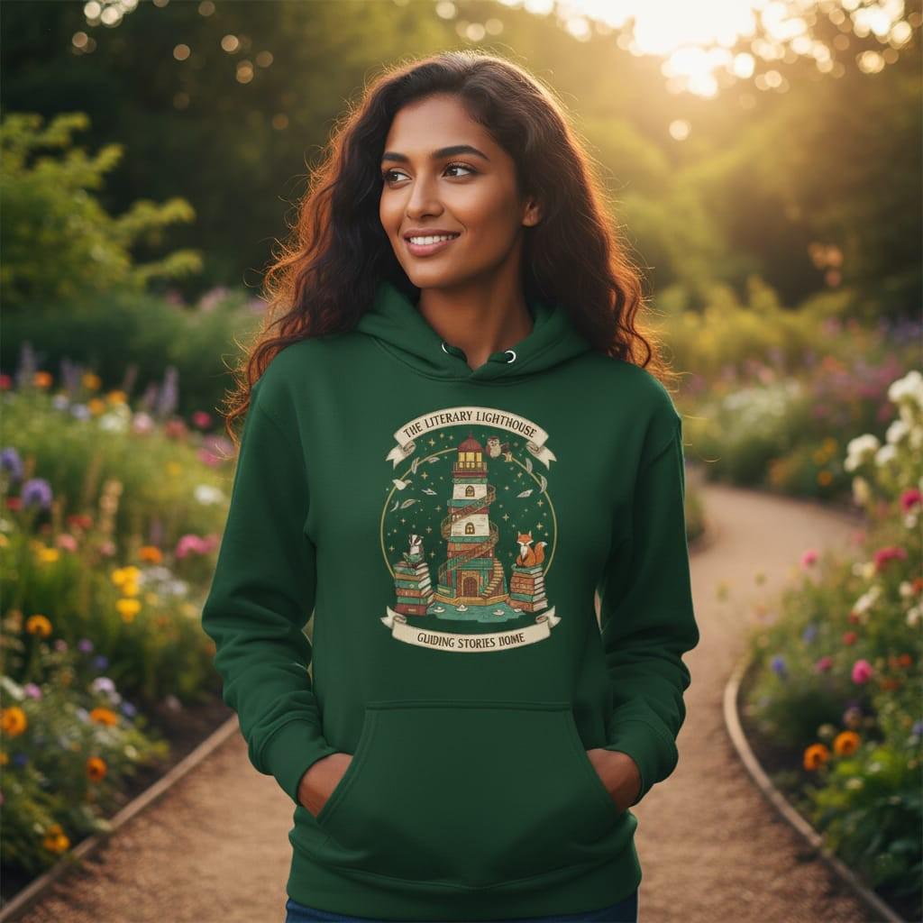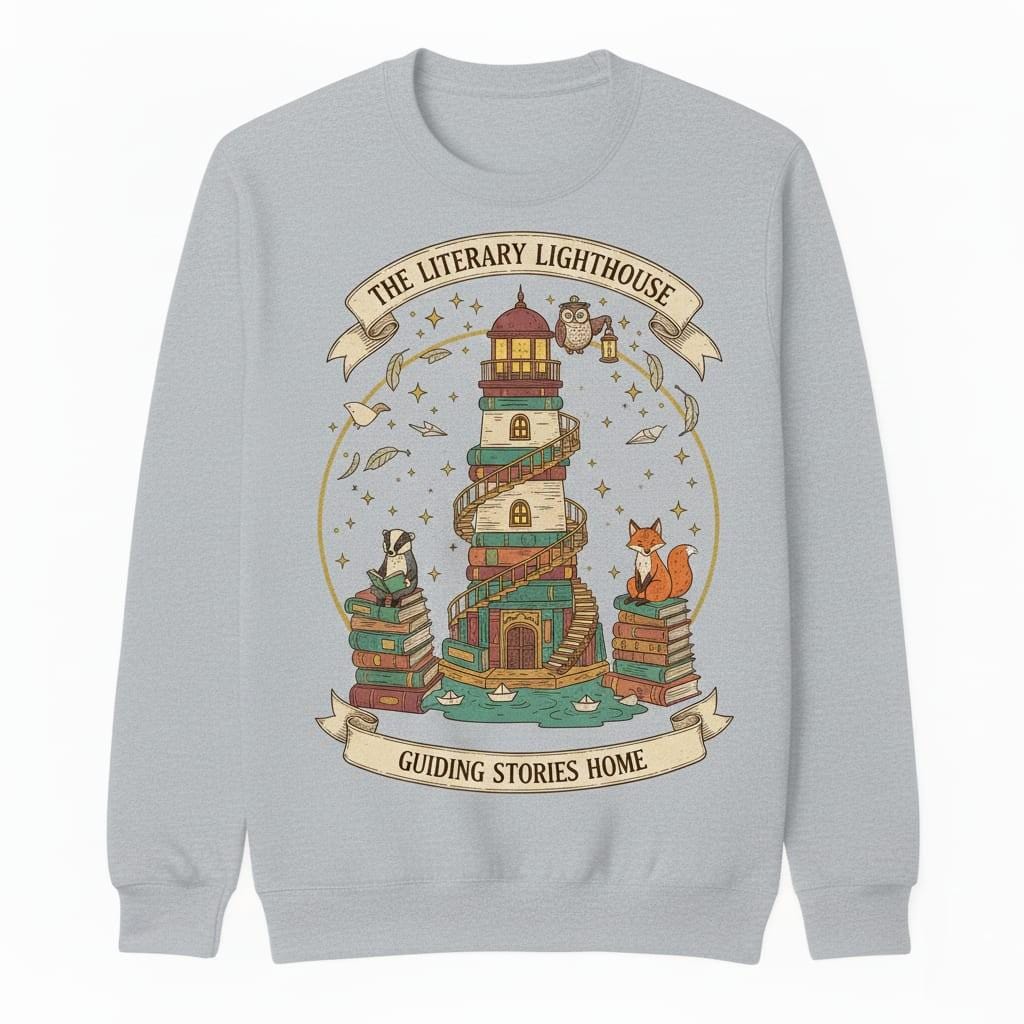 This design is special because it feels like a cozy storybook scene—an illustrated book-built lighthouse surrounded by stars, floating pages, and charming woodland friends, framed with the phrases “THE LITERARY LIGHTHOUSE” and “GUIDING STORIES HOME” for a magical, meaningful finish; it’s perfect for book lovers, librarians, reading clubs, classroom decor, stickers, and cozy t-shirt or tote bag projects, delivered as a high-resolution digital download (digital item only; colors may vary slightly by screen and printer).
