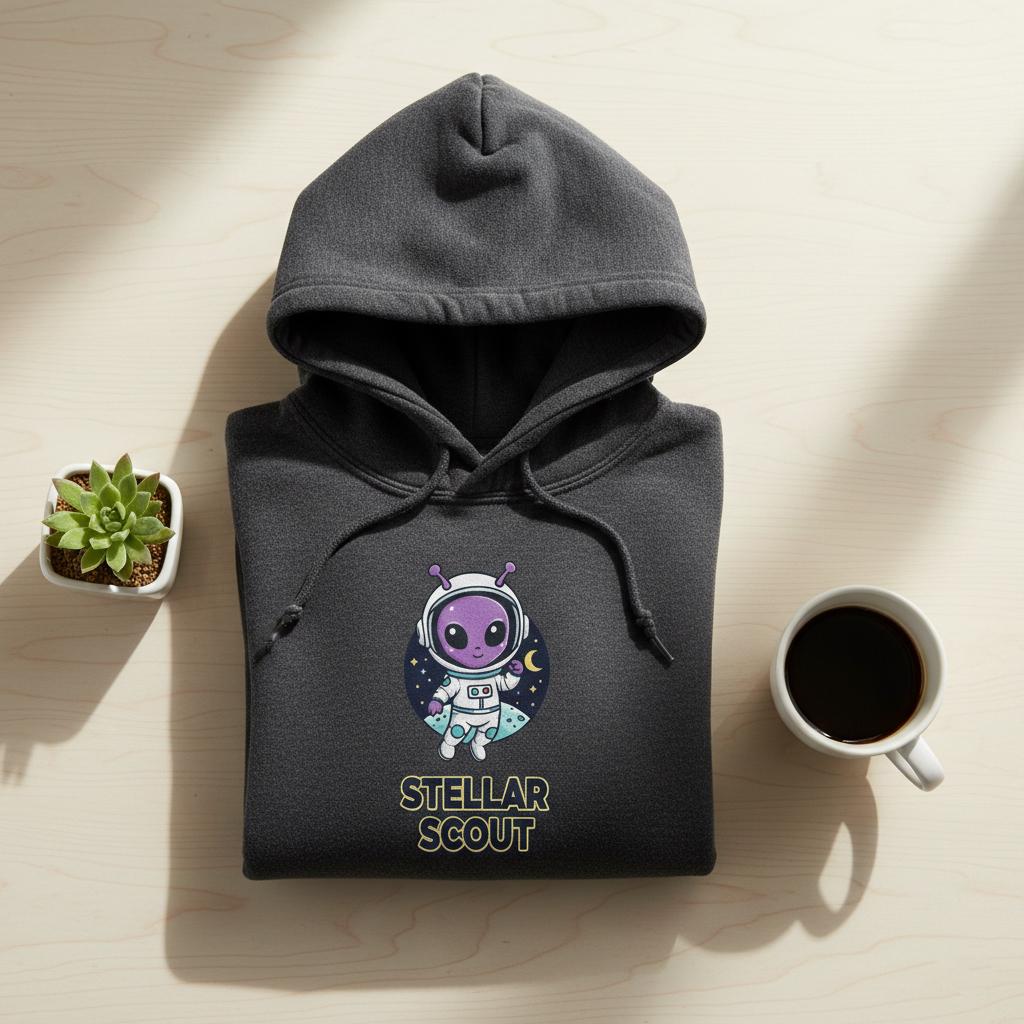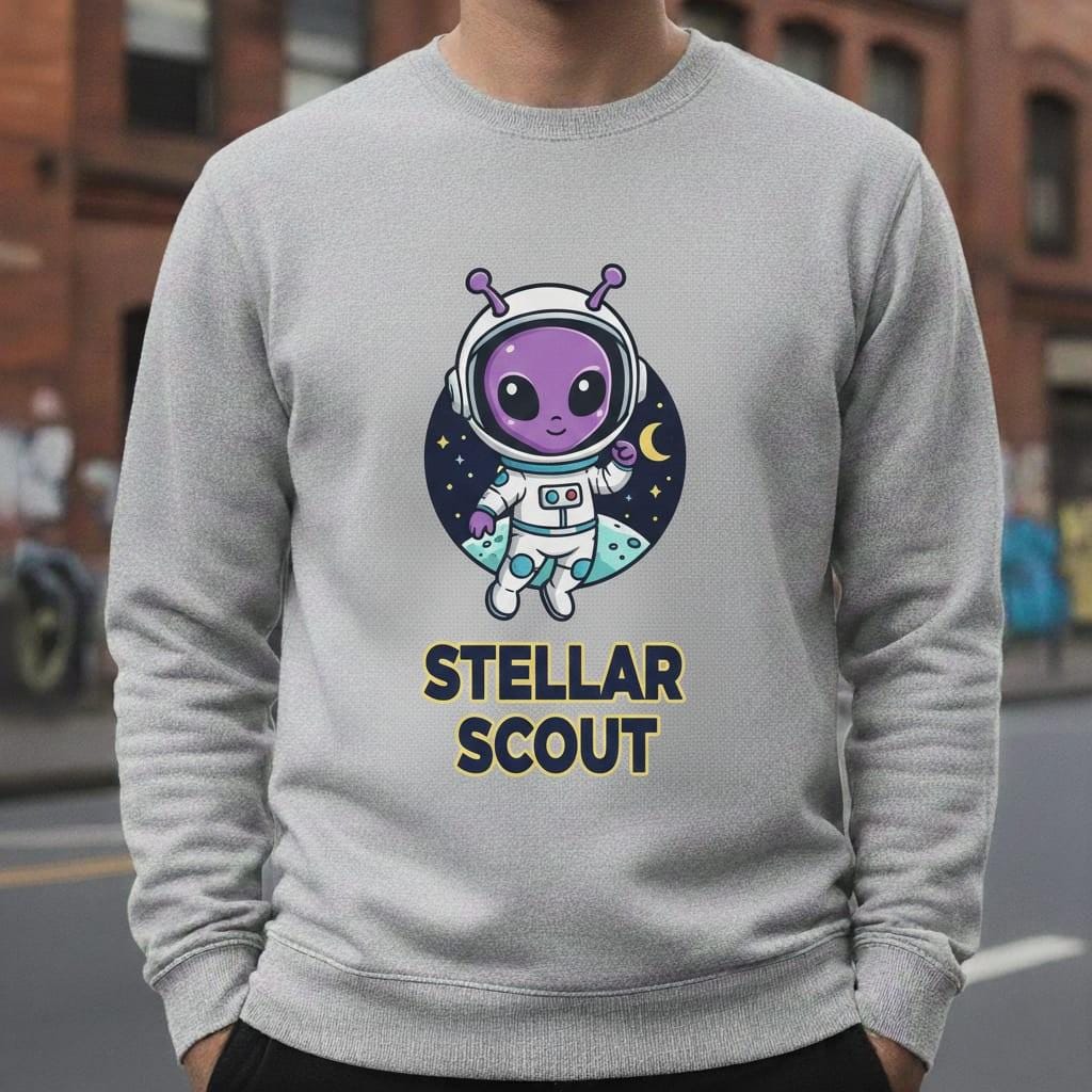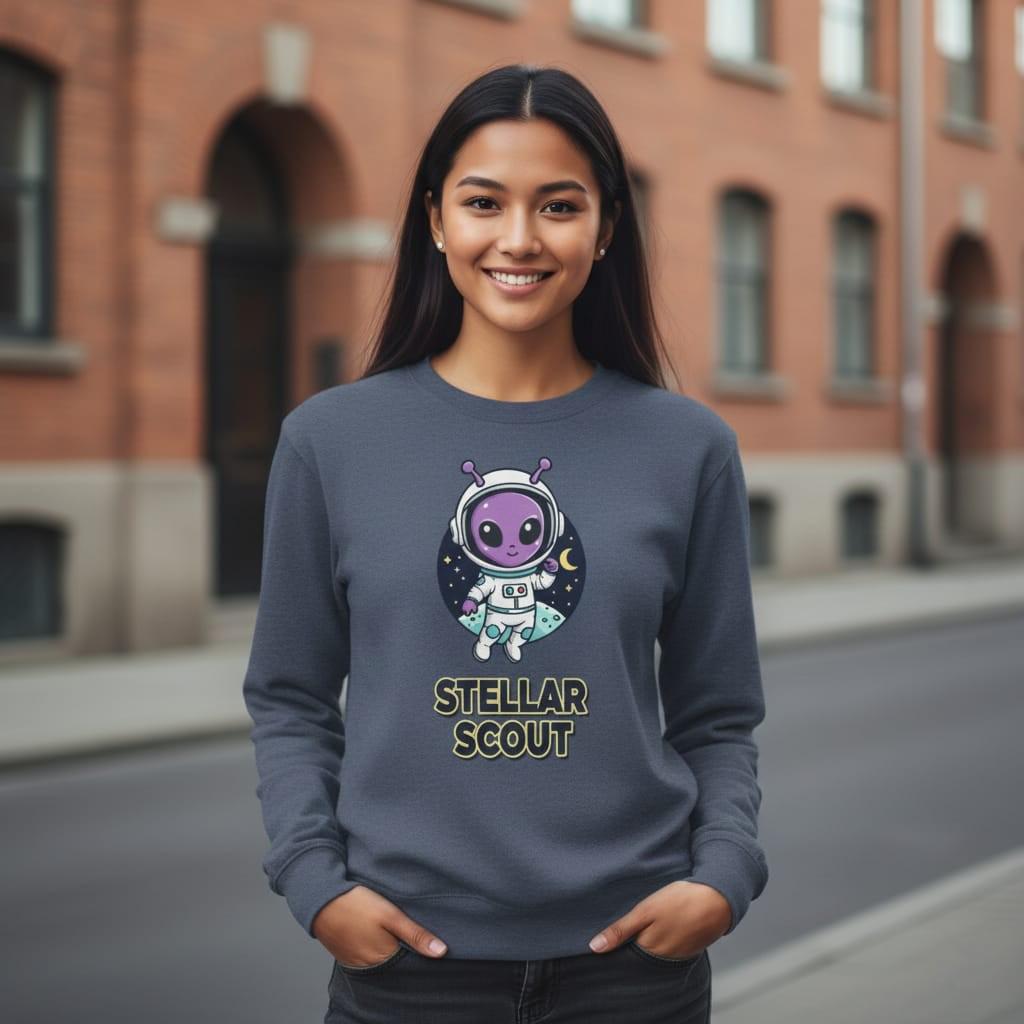 This design is special because it turns space exploration into an adorable character moment—a cute purple alien astronaut with little antennae floats in front of a starry night circle with a crescent moon, paired with bold badge-style text “STELLAR SCOUT” for a clean, high-contrast look that prints beautifully on stickers, t-shirts, notebooks, kids room decor, and space-lover gifts; it’s delivered as a high-resolution digital download (digital item only; colors may vary slightly by screen and printer).
