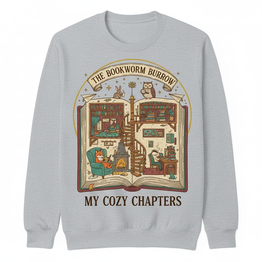 This design is special because it turns an open book into a tiny cozy world—a detailed book-burrow home with bookshelves, a spiral staircase, warm fireplace vibes, and charming woodland readers, topped with the banner “THE BOOKWORM BURROW” and the phrase “MY COZY CHAPTERS” for a perfect bookish statement; it’s ideal for readers, bookworms, librarians, teachers, book clubs, cottagecore fans, stickers, tees, totes, and cozy gifts, delivered as a high-resolution digital download (digital item only; colors may vary slightly by screen and printer).