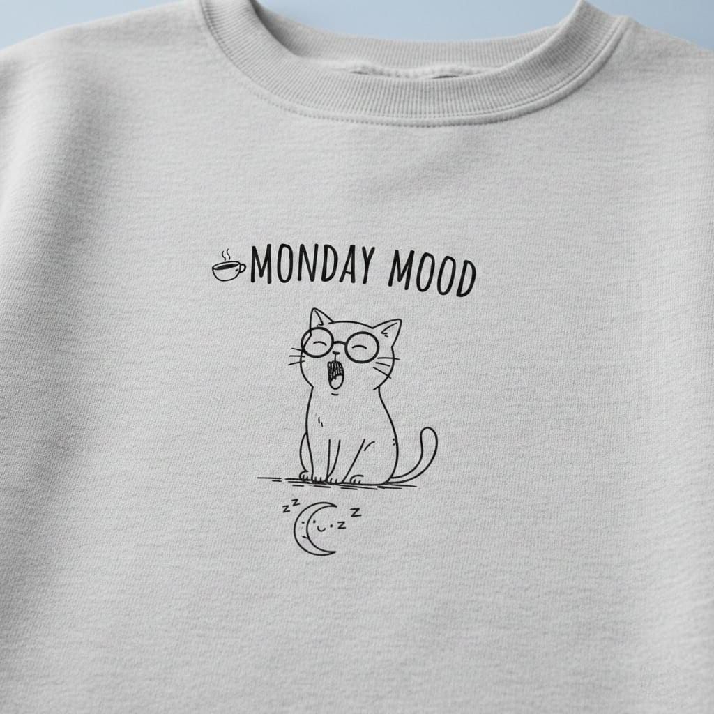 This design is special because it captures the universal Monday struggle in a clean, minimalist way—a yawning sleepy cat in glasses under the phrase “MONDAY MOOD”, with a tiny coffee cup and a dozing moon icon to nail that “need caffeine, still half-asleep” vibe; the simple white outline style prints crisp on shirts and stickers and works great for cat lovers, office humor, students, coworkers, and coffee fans, delivered as a high-resolution digital download (digital item only; colors may vary slightly by screen and printer).