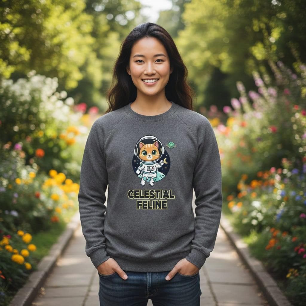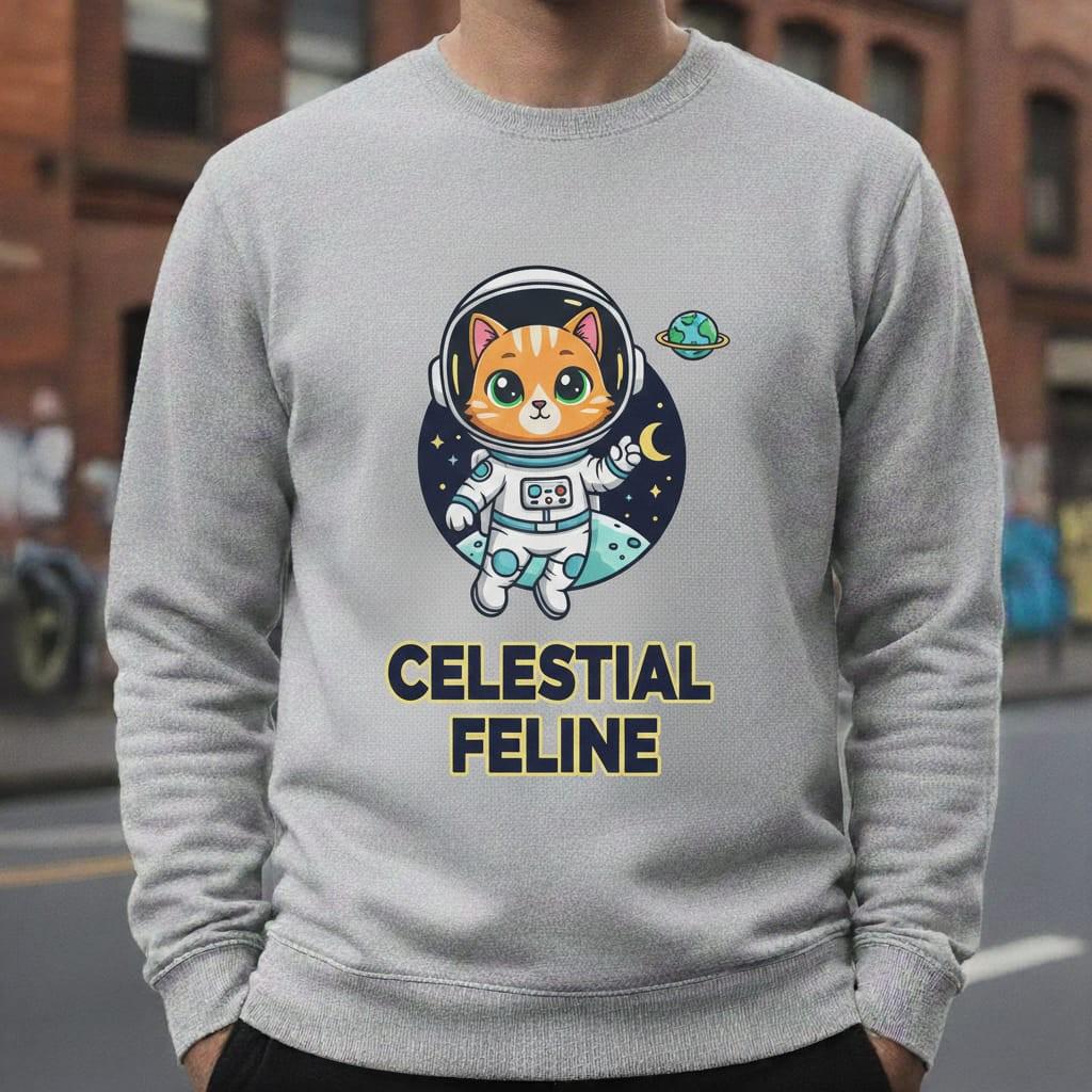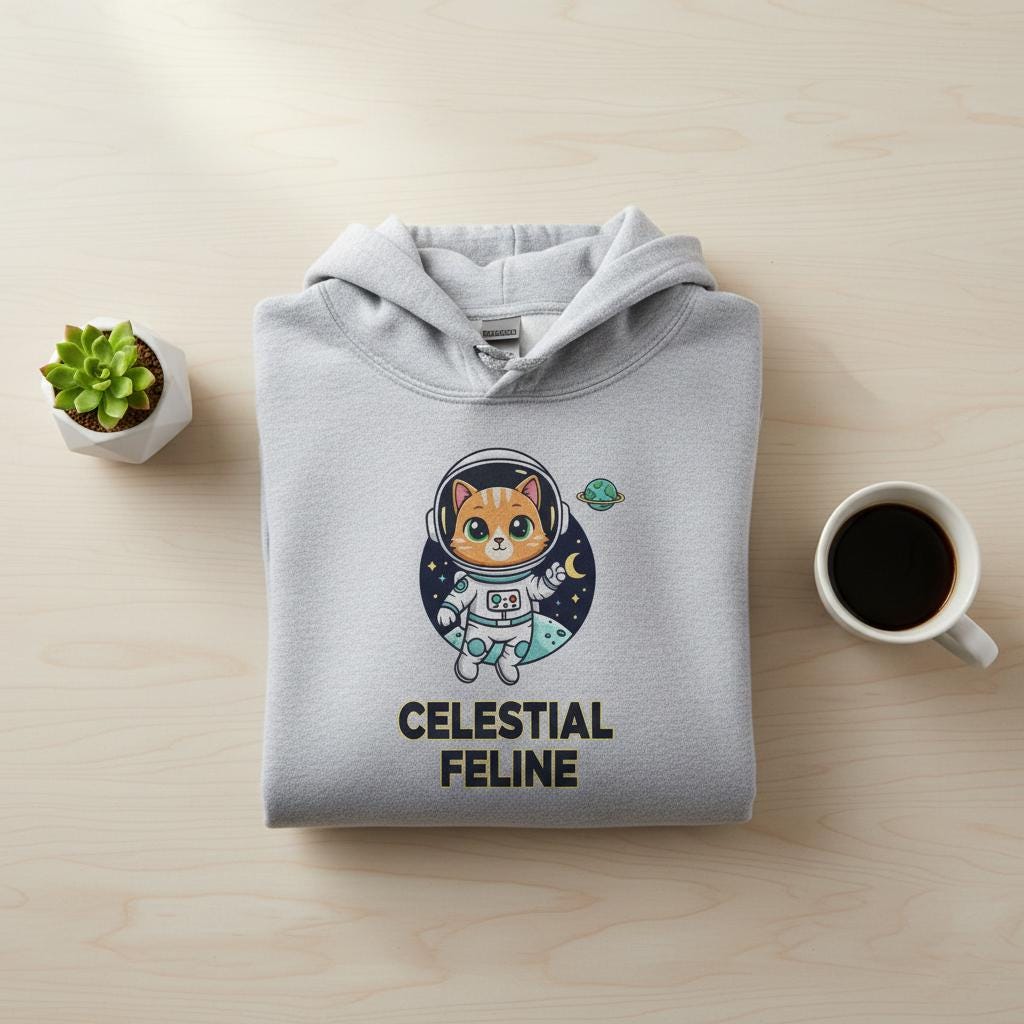 This design is special because it combines instant-cutness with a clean, print-friendly badge layout—a wide-eyed orange tabby cat astronaut floating in front of a starry night circle with a crescent moon and a tiny ringed planet, finished with bold text “CELESTIAL FELINE” for strong readability; it’s perfect for cat lovers, space fans, stickers, t-shirts, notebooks, kids gifts, and geeky decor, delivered as a high-resolution digital download (digital item only; colors may vary slightly by screen and printer).