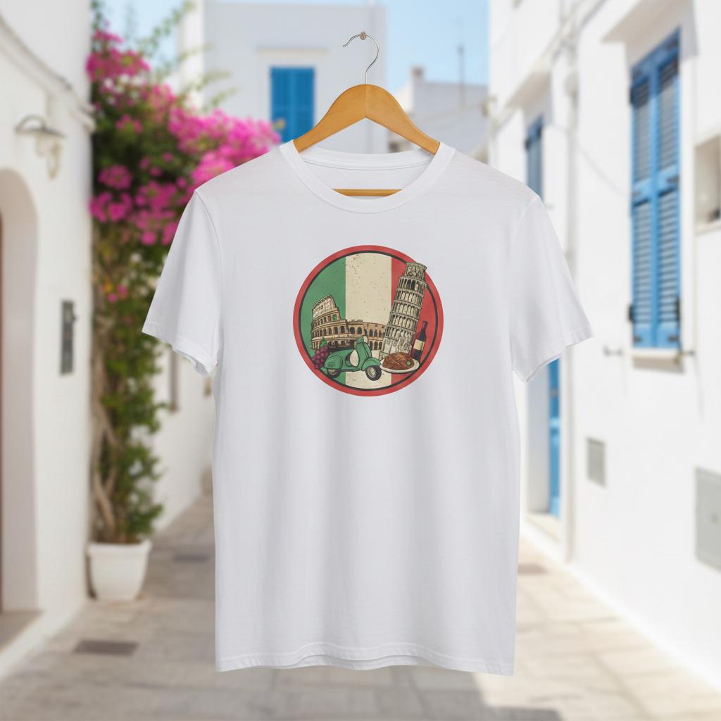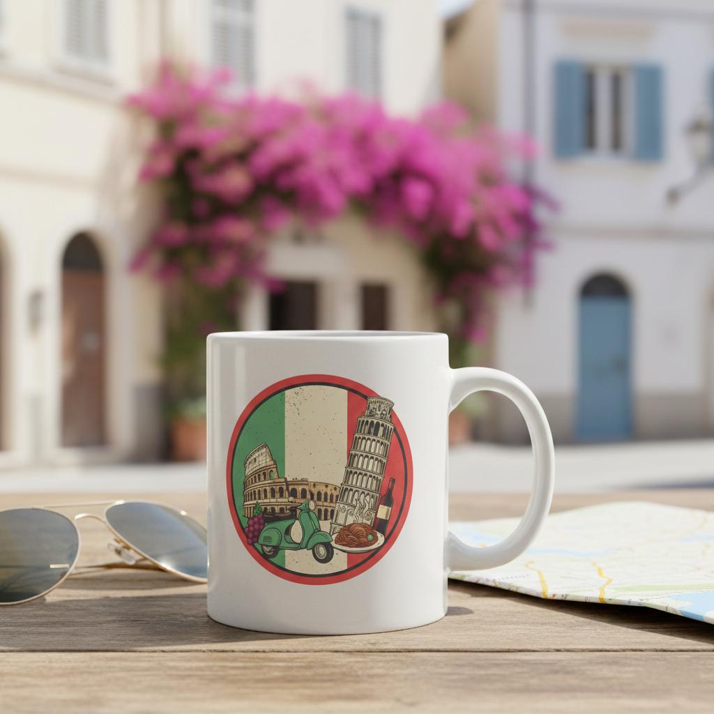 This design is special because it bundles Italy’s most beloved icons into one charming vintage badge: the Italian tricolor backdrop with the Colosseum, Leaning Tower of Pisa, a classic Vespa-style scooter, plus delicious nods to la dolce vita—wine, pasta, and grapes—all finished with a subtle distressed texture for an authentic souvenir feel; it’s perfect for Italy trip memories, foodie gifts, travel lovers, scrapbookers, stickers, tees, mugs, and decals, delivered as a high-resolution digital download (digital item only; colors may vary slightly by screen and printer).