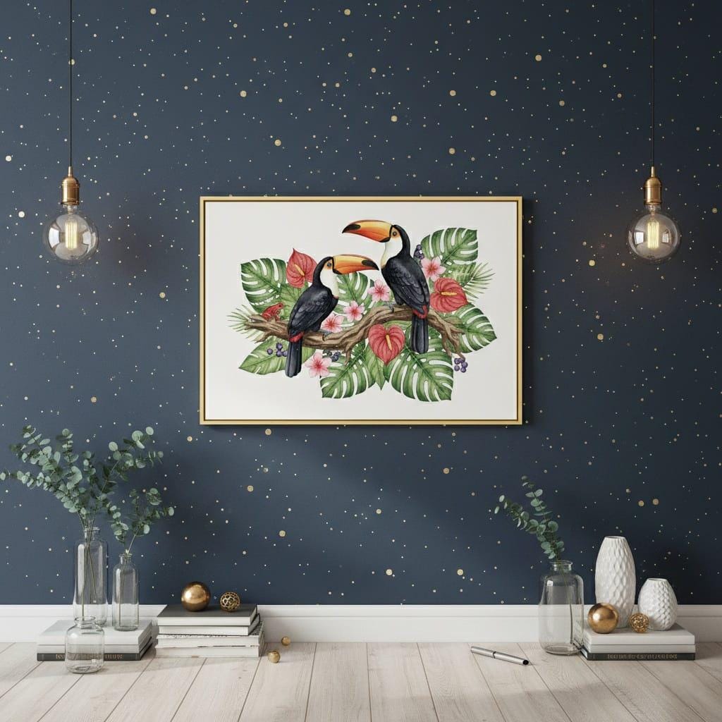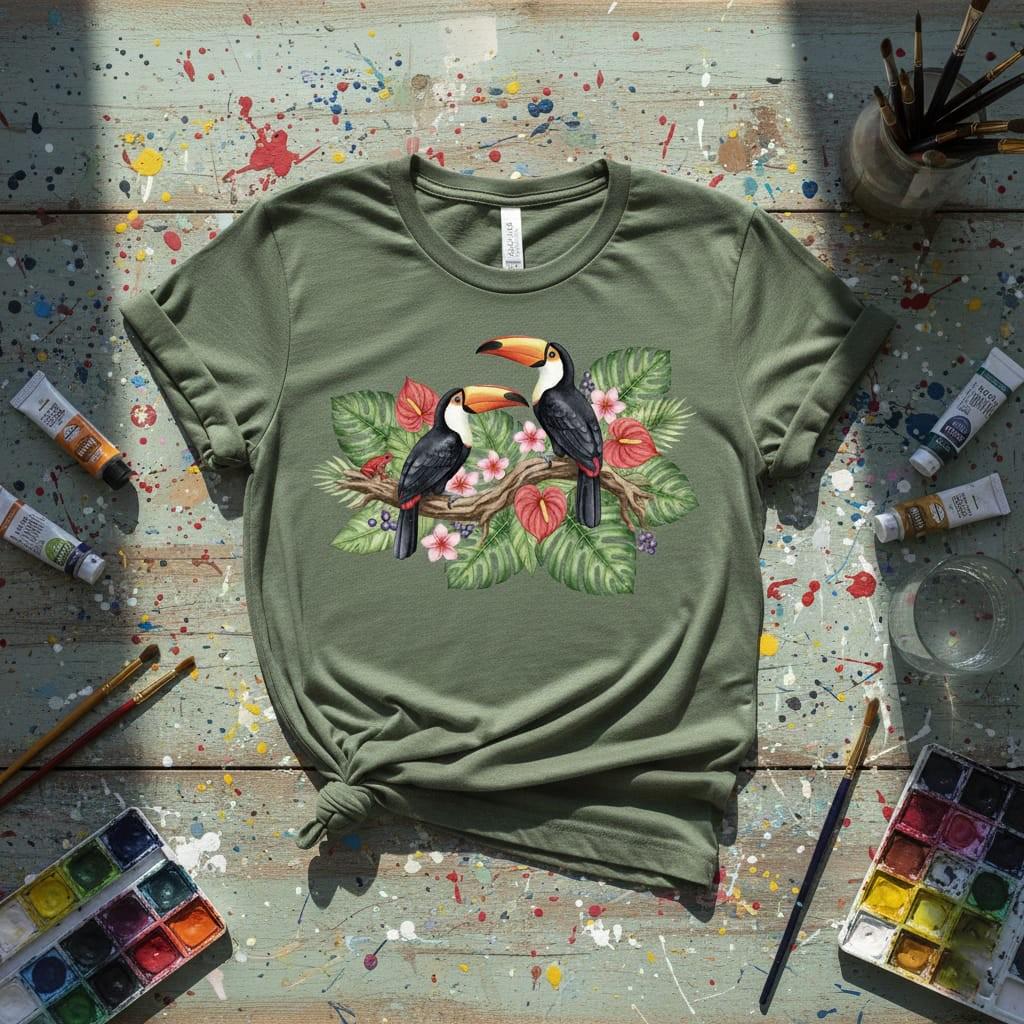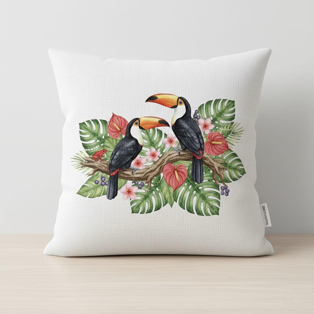 This design is special because it blends elegant watercolor detail with a lush tropical composition: two vibrant toucans perched on a branch, framed by monstera leaves, palm fronds, pink plumeria blooms, and bold anthurium flowers for a rich rainforest feel; the soft shading and vivid color palette make it ideal for sublimation and printing on shirts, tote bags, mugs, pillows, wall art, stickers, and summer or tropical-themed gifts, delivered as a high-resolution PNG digital download (digital item only; colors may vary slightly by screen and printer).