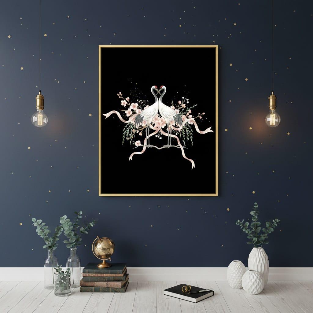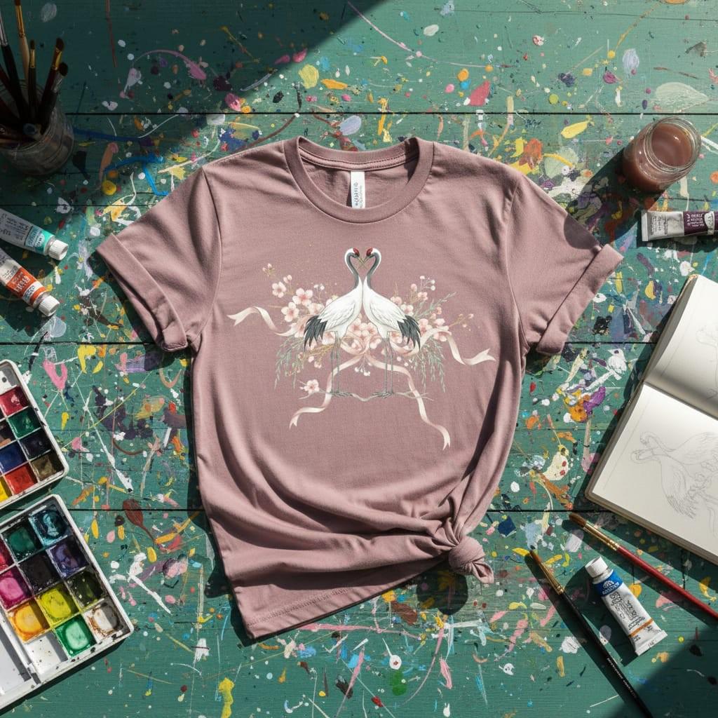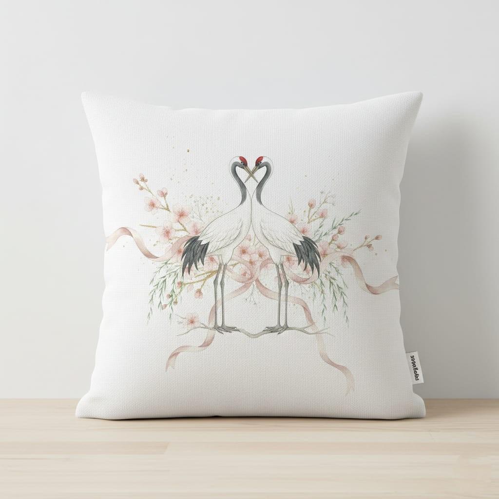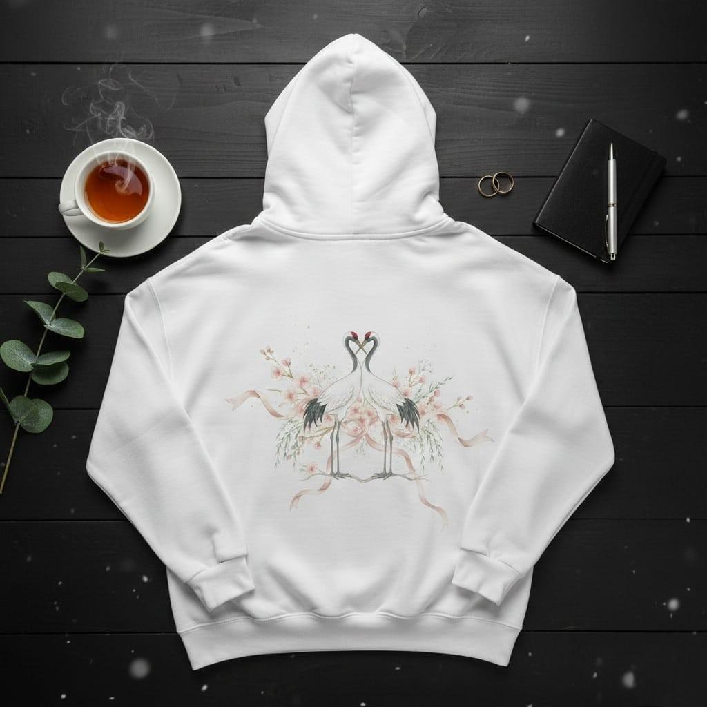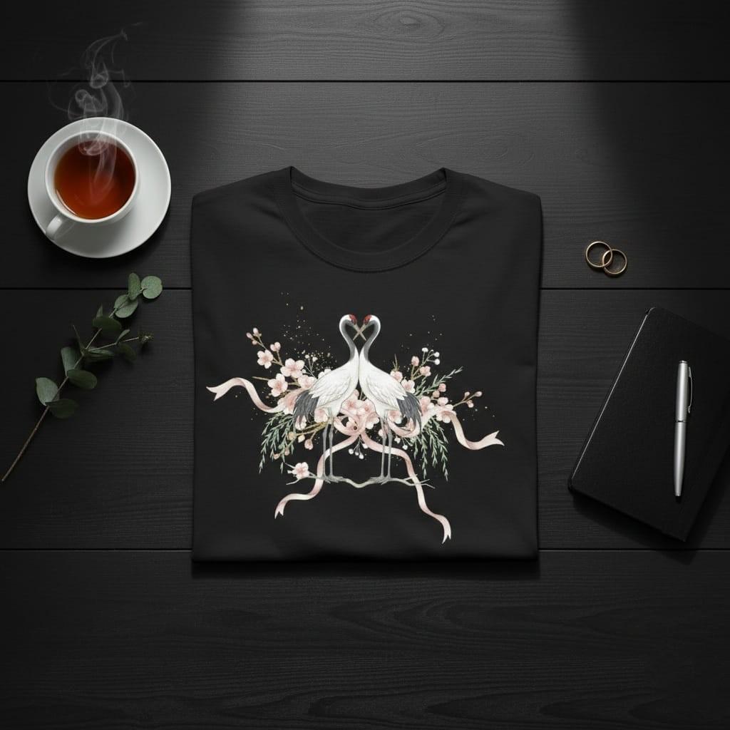 This design is special because it symbolizes love and unity with a refined watercolor composition: two elegant white cranes forming a heart with their necks, surrounded by soft blush blossoms, airy greenery, flowing satin-like ribbons, and delicate gold splatter accents for a timeless romantic feel; the clean detailing and gentle palette make it perfect for sublimation and printing on wedding decor, shirts, tote bags, mugs, invitations, stickers, and anniversary or bridal gifts, delivered as a high-resolution PNG digital download (digital item only; colors may vary slightly by screen and printer).