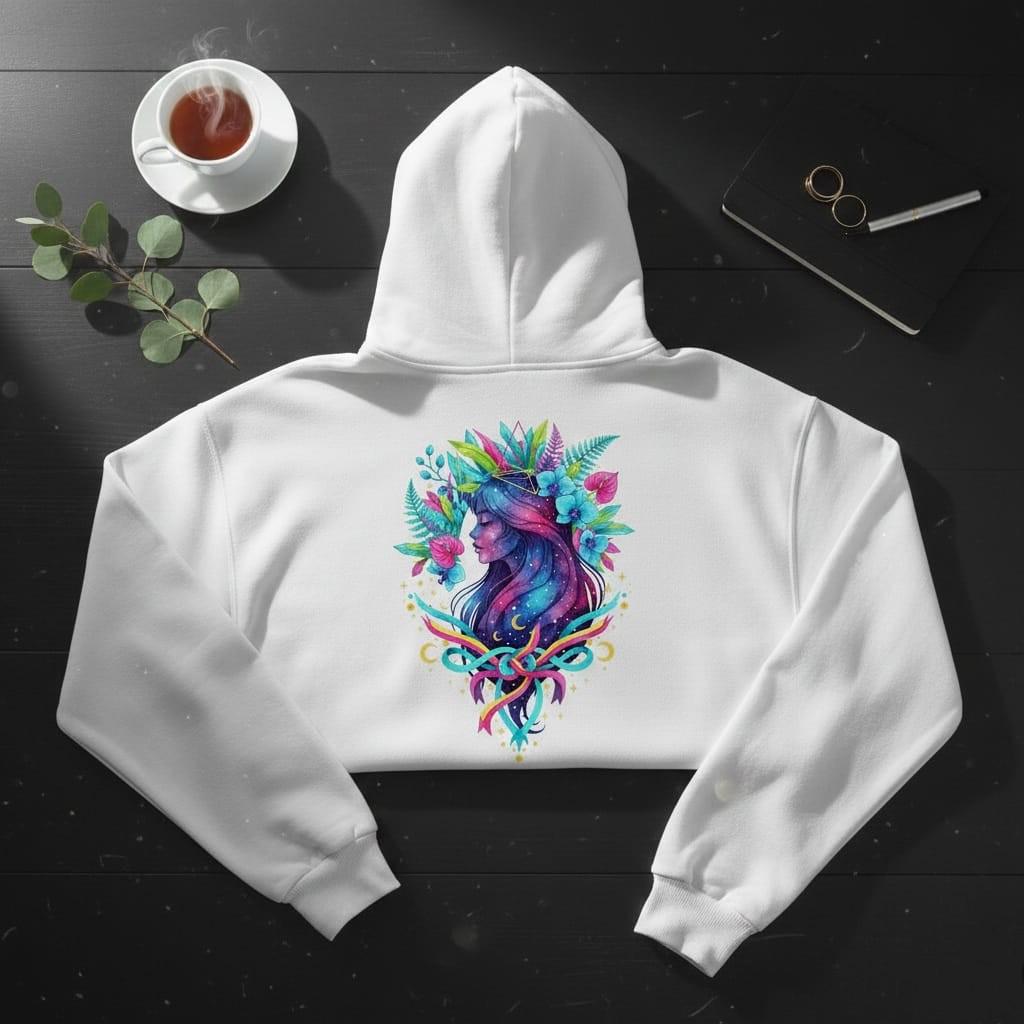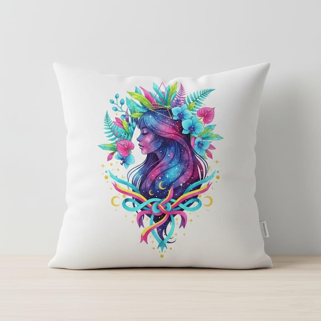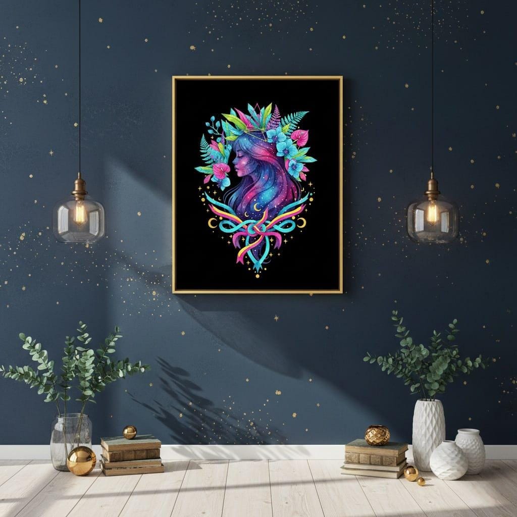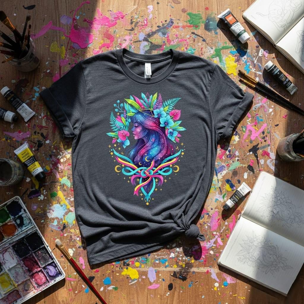 This design is special because it blends cosmic fantasy with bold tropical color: a serene woman’s profile filled with a galaxy night sky, sprinkled with stars and crescent moons, crowned by vibrant neon leaves and orchids, and finished with a striking ribbon bow for a modern boho statement; the high-contrast palette (teal, magenta, lime, gold) pops beautifully on dark and light backgrounds, making it perfect for sublimation on shirts, hoodies, tote bags, tumblers, stickers, journals, and gift projects, delivered as a high-resolution PNG digital download (digital item only; colors may vary slightly by screen and printer).