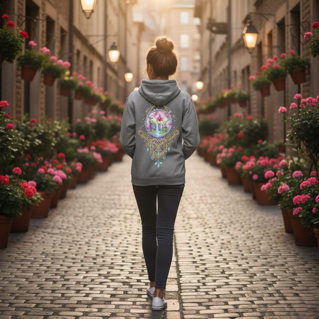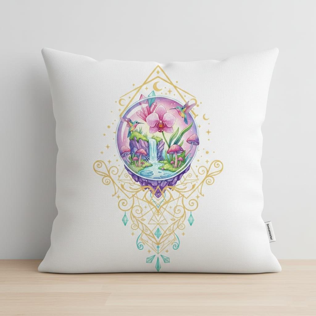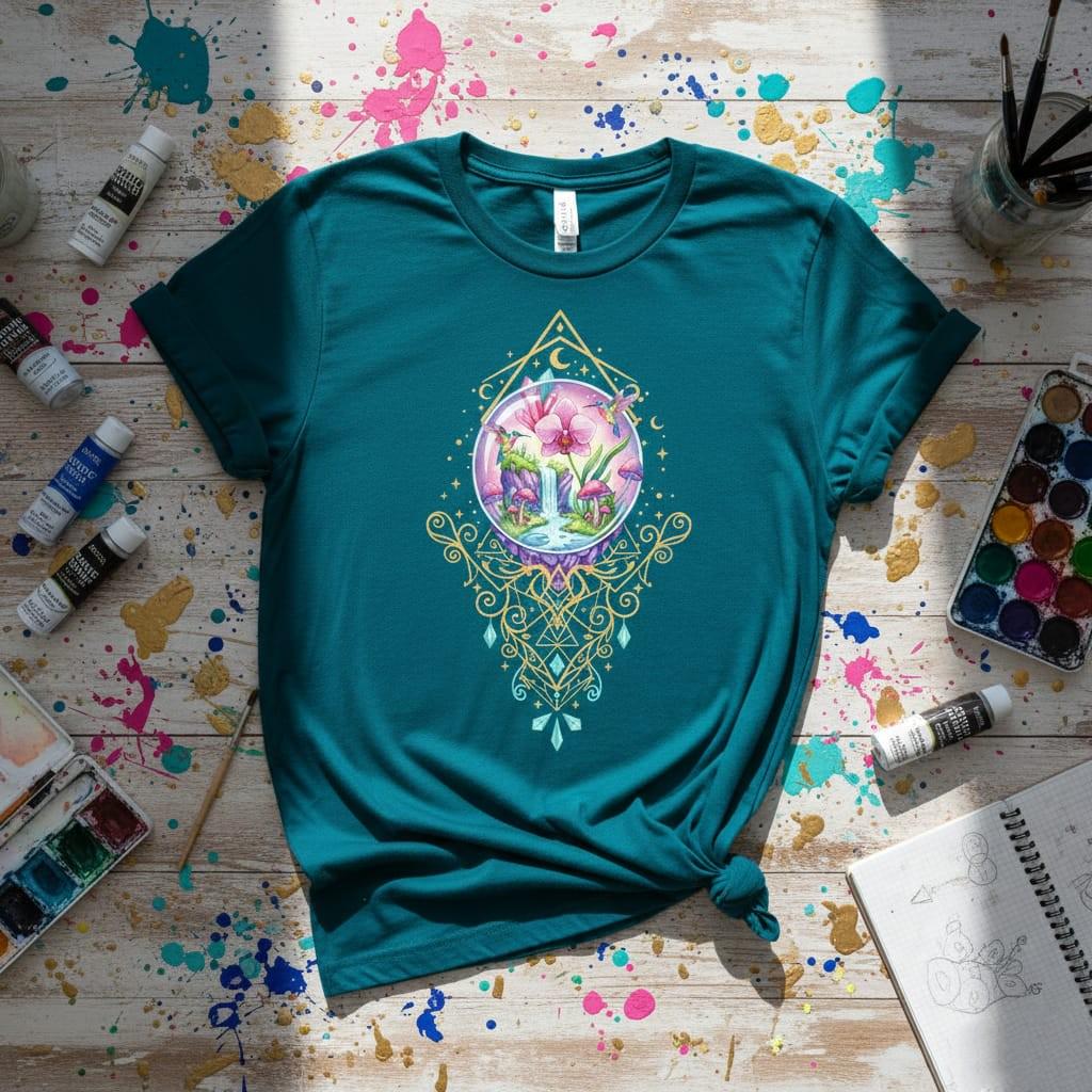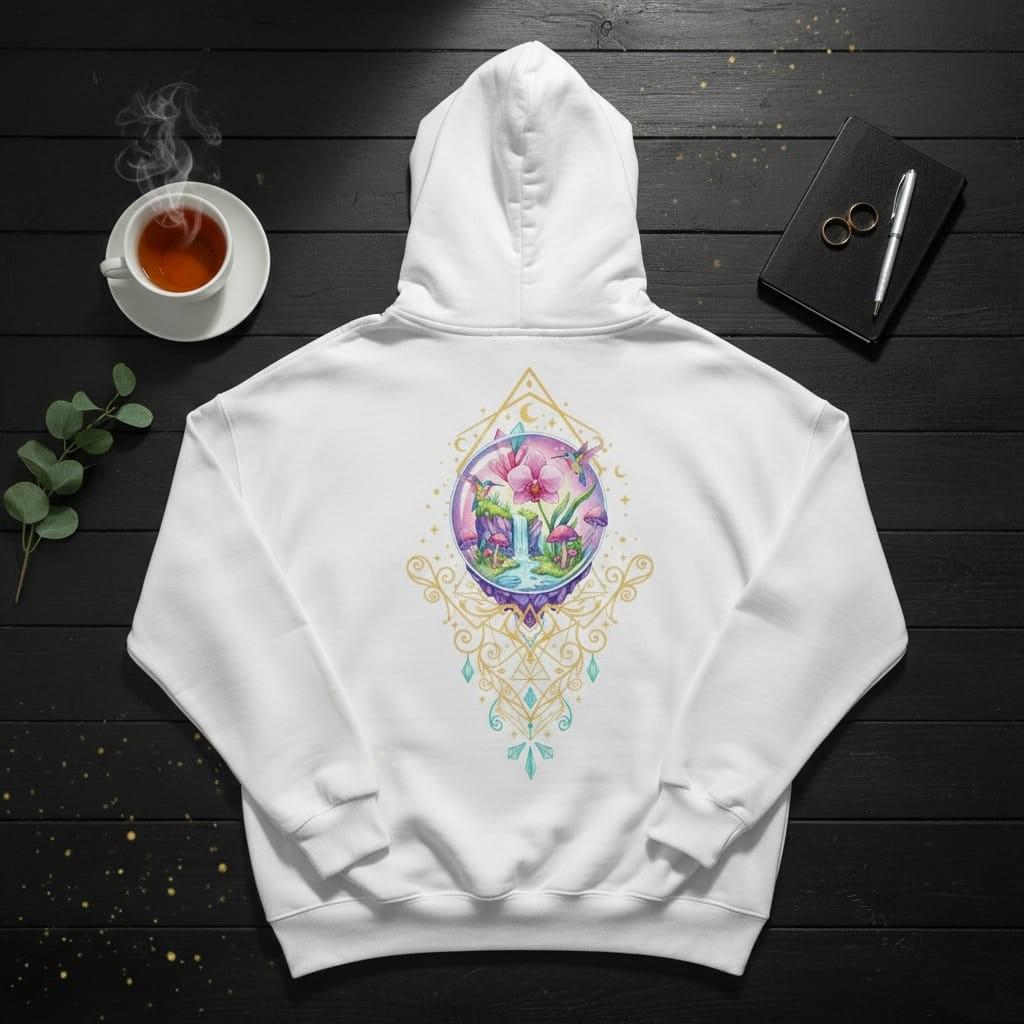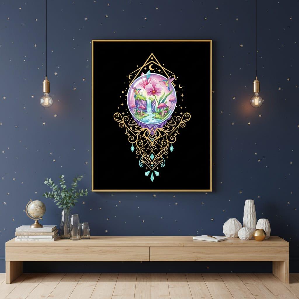 This design is special because it merges a dreamy fantasy terrarium with ornate celestial detailing: a glowing crystal ball reveals a mini waterfall garden with a pink orchid, whimsical mushrooms, and two vibrant hummingbirds, all framed by intricate gold sacred-geometry filigree, crescent moons, stars, and dangling aqua crystal charms for a luxe mystical look; the centered composition and vivid pastel-to-jewel tones make it ideal for sublimation on shirts, hoodies, tote bags, tumblers, stickers, journals, and witchy/celestial gift projects, delivered as a high-resolution PNG digital download (digital item only; colors may vary slightly by screen and printer).