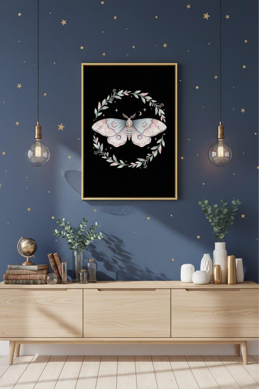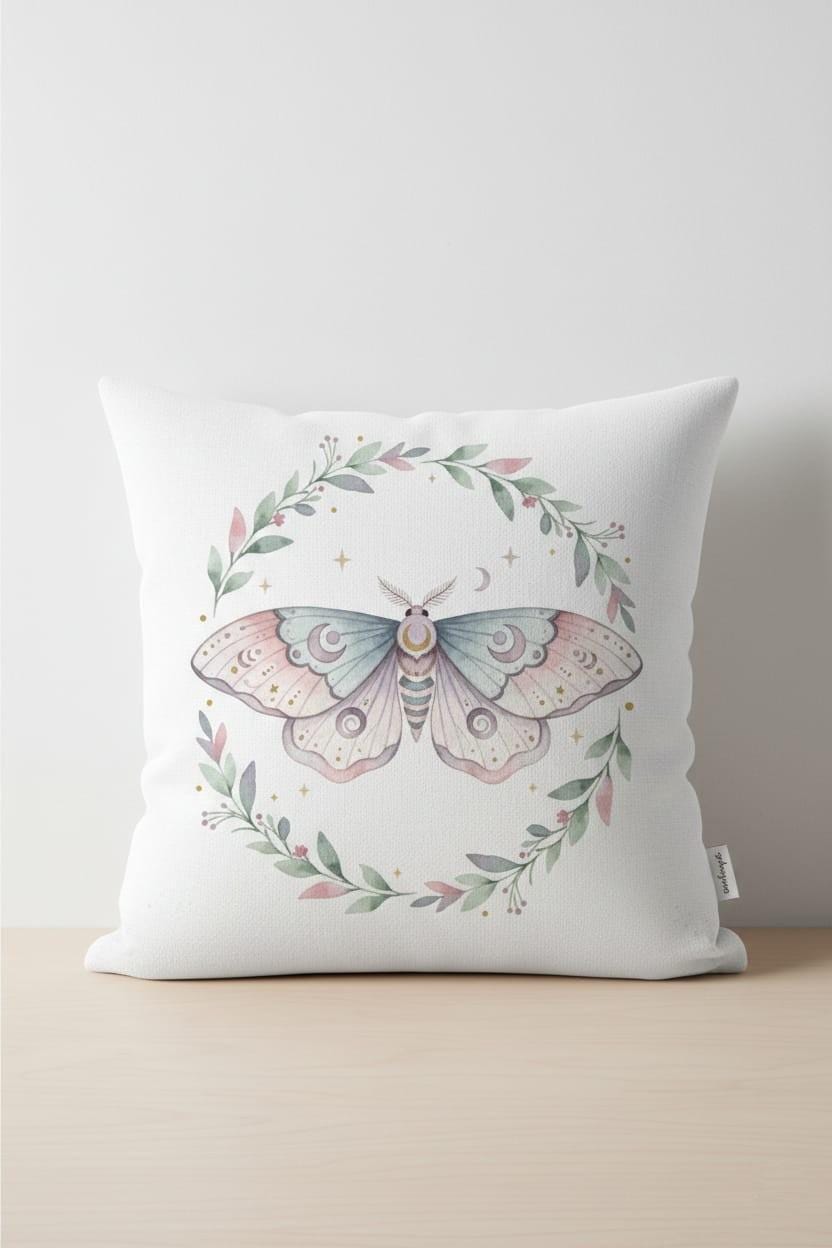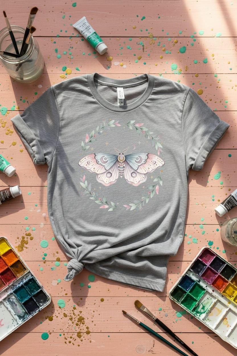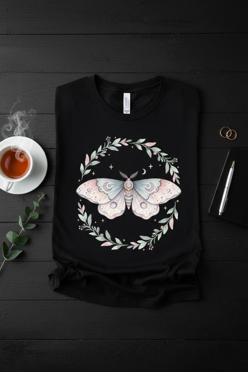 This design is special because it feels soft, dreamy, and magical all at once: a delicate pastel luna moth with crescent-moon motifs and tiny starry details, framed by a gentle botanical wreath in blush and sage tones for an elegant cottagecore–celestial vibe; the airy watercolor style and balanced composition make it perfect for sublimation on shirts, tote bags, sweatshirts, stickers, journals, wedding/bridal party gifts, and nature- or witchy-themed projects, delivered as a high-resolution PNG digital download (digital item only; colors may vary slightly by screen and printer).