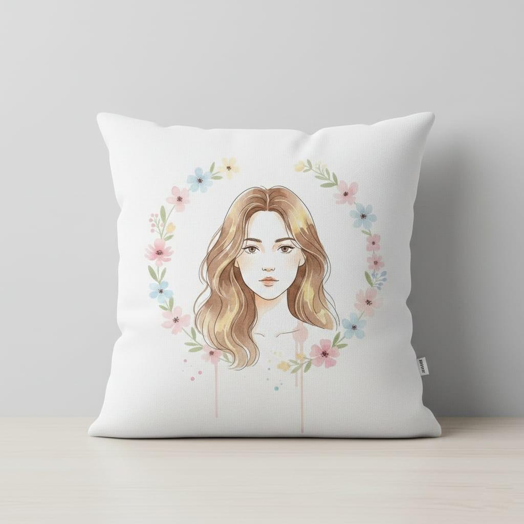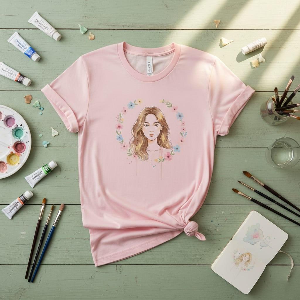 This design is special because it captures a soft, elegant spring vibe in a clean modern portrait: a watercolor blonde girl with gentle highlights is framed by a pastel flower wreath (pink, blue, and cream blooms) with tiny greenery, while subtle splatter dots and drip details add an artsy, hand-painted finish; the centered composition makes it easy to print beautifully for sublimation on tees, sweatshirts, tote bags, stickers, planners, greeting cards, and feminine gift items, delivered as a high-resolution PNG digital download (digital item only; colors may vary slightly by screen and printer).