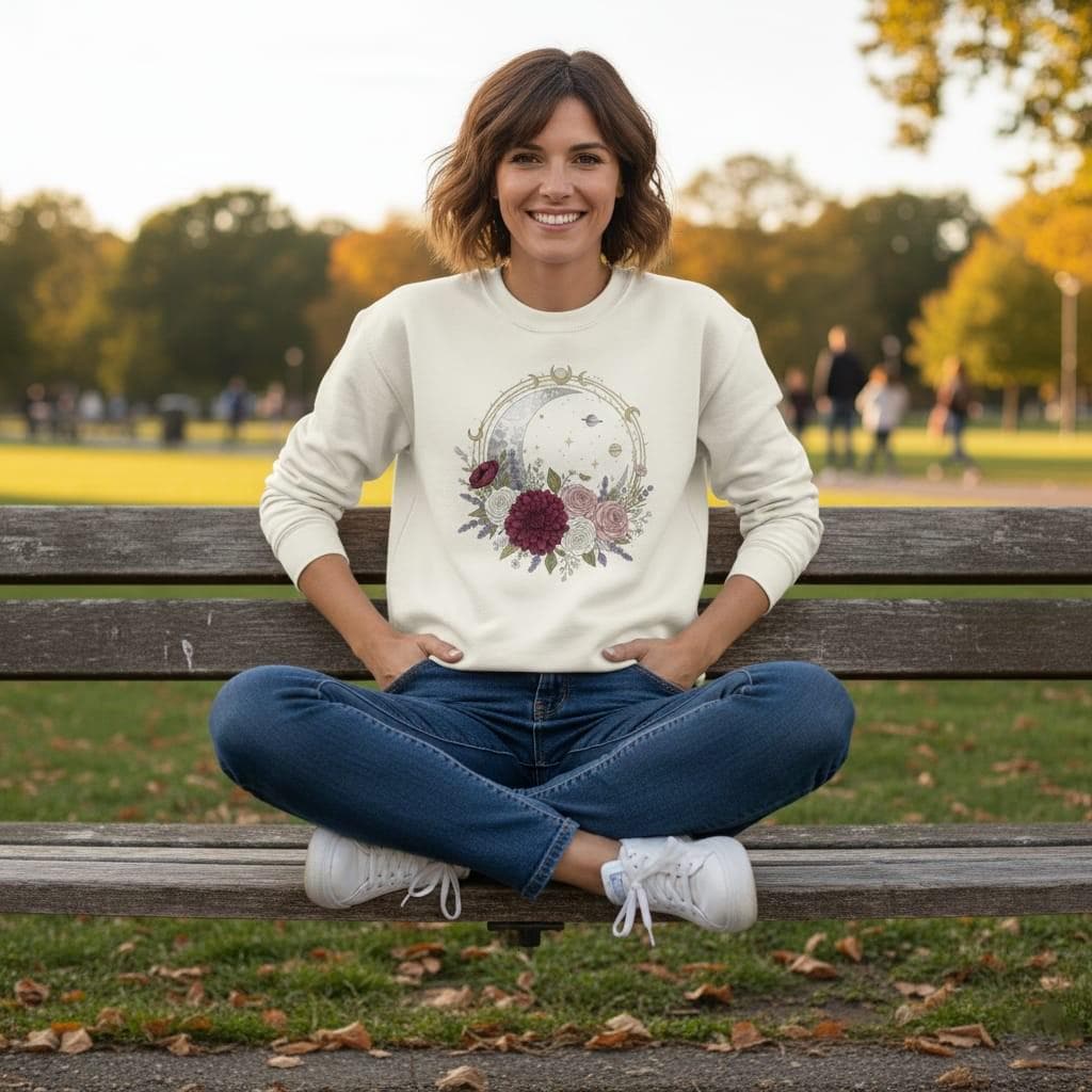 This design is special because it pairs a bold celestial focal point with elegant moody florals: a luminous crescent moon and starry night sky sit inside a delicate golden moon-phase wreath, accented with tiny planets and sparkles, while burgundy dahlia, blush and ivory roses, and lavender sprigs create a romantic gothic-boho composition—perfect for sublimation on t-shirts, hoodies, tote bags, mugs, stickers, journals, wall art, and witchy celestial gifts; delivered as a high-resolution PNG digital download (digital item only; colors may vary slightly by screen and printer).