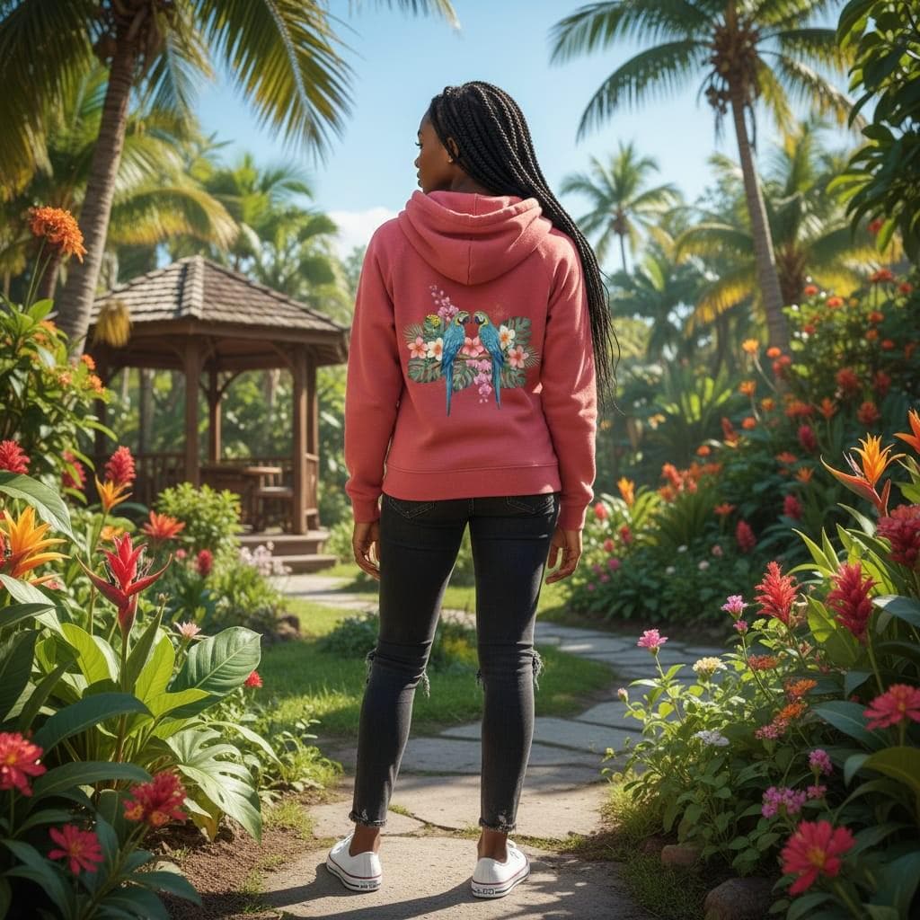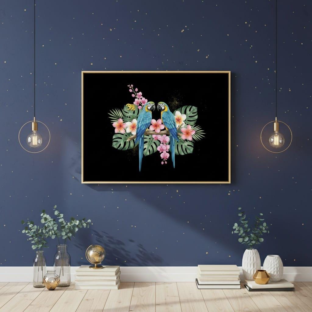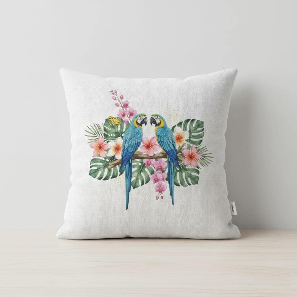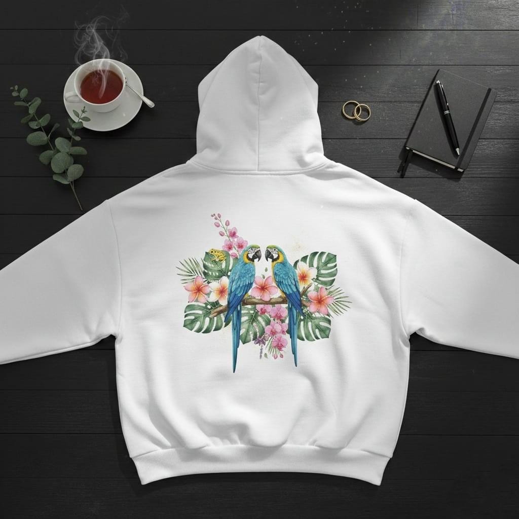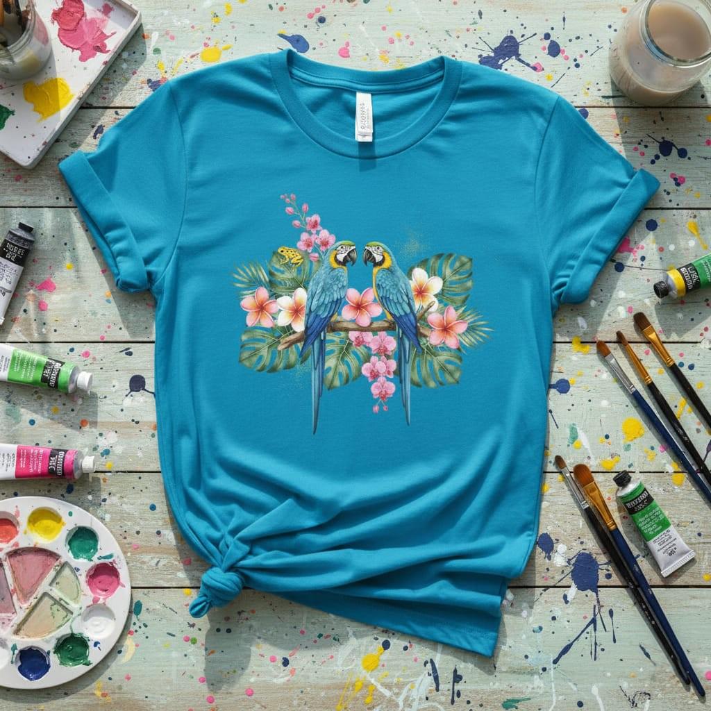 This design is special because it features a striking tropical scene with rich, realistic watercolor detail: two blue-and-gold macaw parrots face each other on a branch, surrounded by lush monstera and palm leaves, soft plumeria blooms, and cascading pink orchids, with subtle paint-splatter accents for an artistic finish; the symmetrical composition makes a bold statement for sublimation on t-shirts, hoodies, tote bags, pillows, wall prints, tumblers, and tropical-themed gifts—delivered as a high-resolution PNG digital download (digital item only; colors may vary slightly by screen and printer).