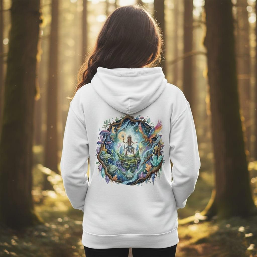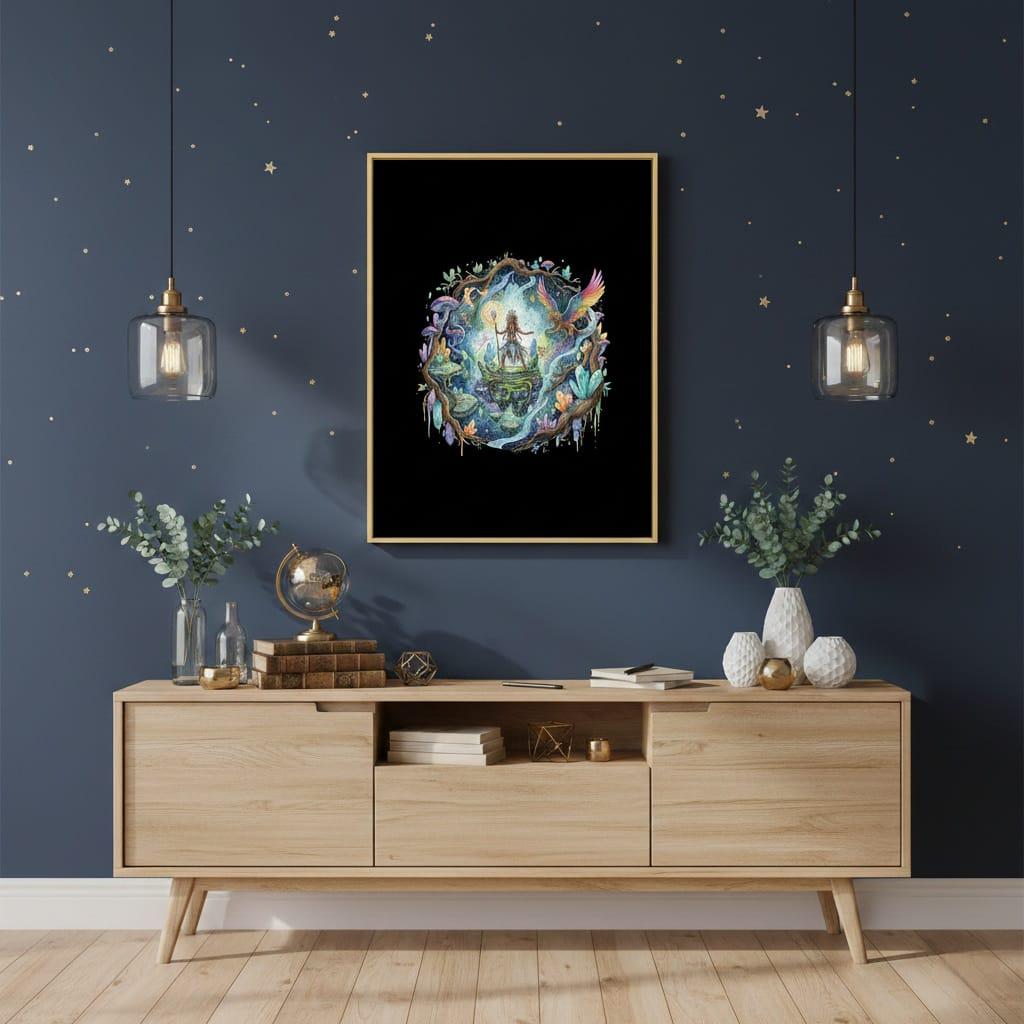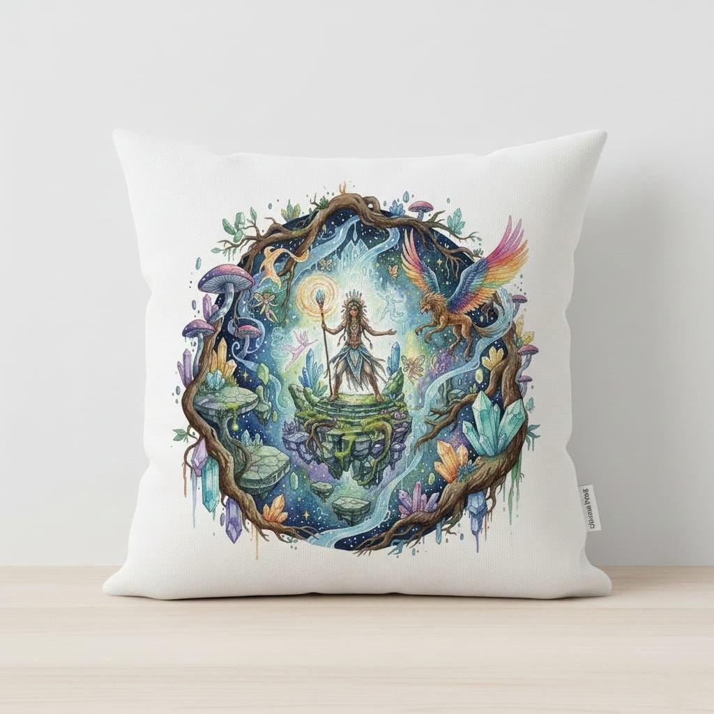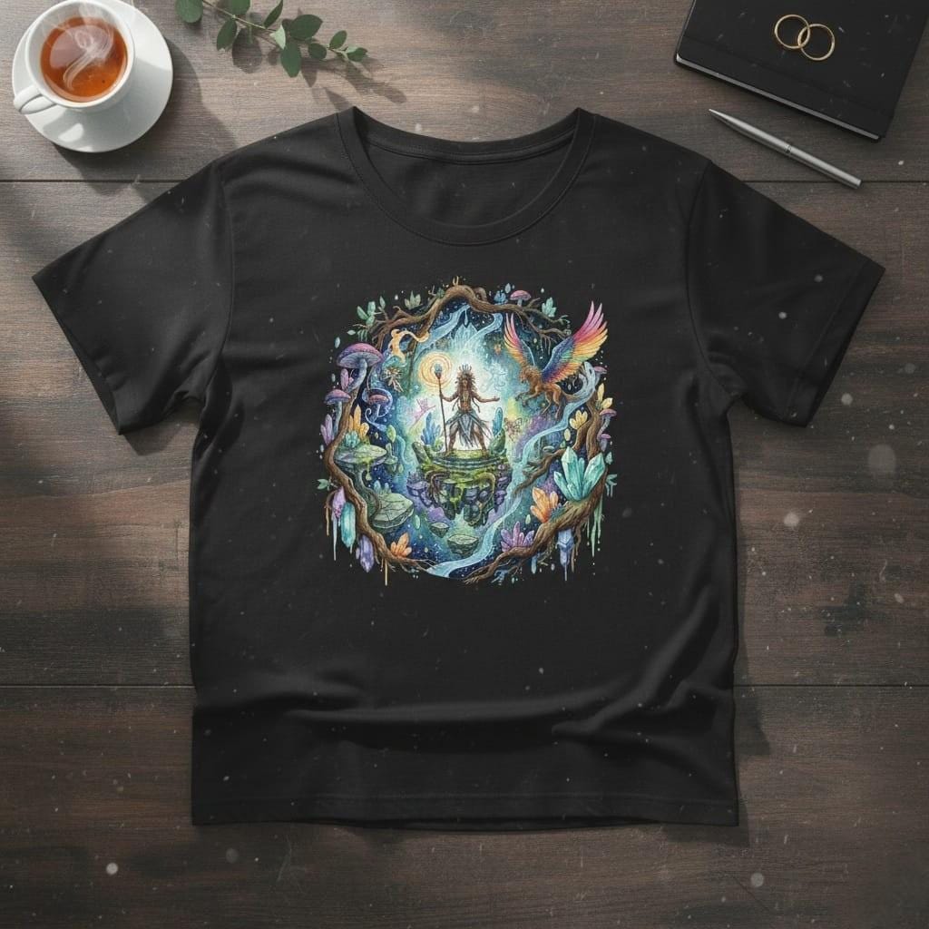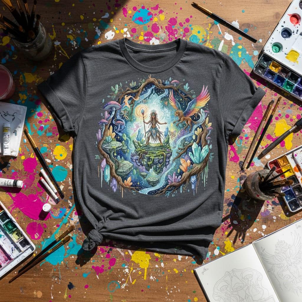 This design is special because it captures an enchanting fantasy realm in rich, hand-painted watercolor detail: a powerful mystic shaman stands on floating stone platforms, holding a glowing staff inside a cosmic portal framed by ancient roots, shimmering crystals, luminous mushrooms, tiny fairy spirits, and a rainbow-winged griffin soaring through swirling magic—creating a bold, storybook centerpiece for sublimation on t-shirts, hoodies, tote bags, stickers, posters, journals, tumblers, and fantasy-themed gifts; delivered as a high-resolution PNG digital download (digital item only; colors may vary slightly by screen and printer).