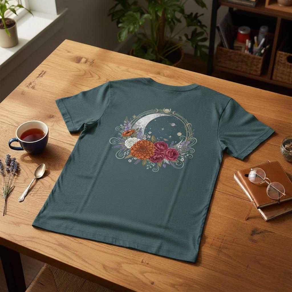 This design is special because it combines a dreamy celestial night scene with rich vintage florals: a glowing moon frames a deep starry sky with tiny constellations and planets, surrounded by an elegant golden wreath and ornate swirls, while layered roses, lavender, and bold blossoms create a romantic, gothic-boho centerpiece—perfect for sublimation on t-shirts, hoodies, tote bags, mugs, stickers, journals, wall art, and magical gifts; delivered as a high-resolution PNG digital download (digital item only; colors may vary slightly by screen and printer).