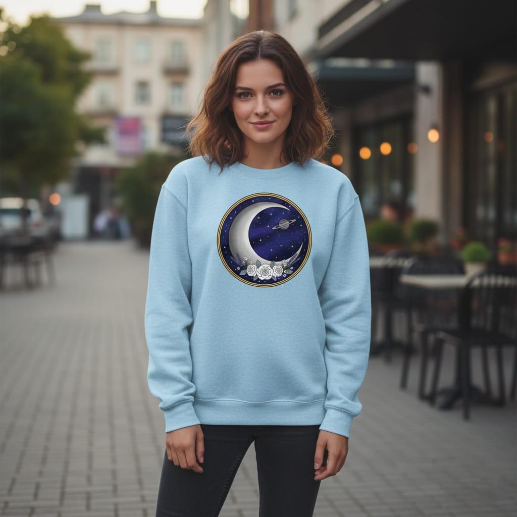 This design is special because it has a bold, clean “celestial badge” look that prints beautifully: a bright silver crescent moon curves across a deep navy star field with golden sparkles and a Saturn accent, all framed by a crisp double gold ring, while white roses and lavender sprigs add a soft romantic touch—ideal for sublimation on t-shirts, hoodies, tote bags, mugs, stickers, journals, and elegant witchy/astronomy-themed gifts; delivered as a high-resolution PNG digital download (digital item only; colors may vary slightly by screen and printer).