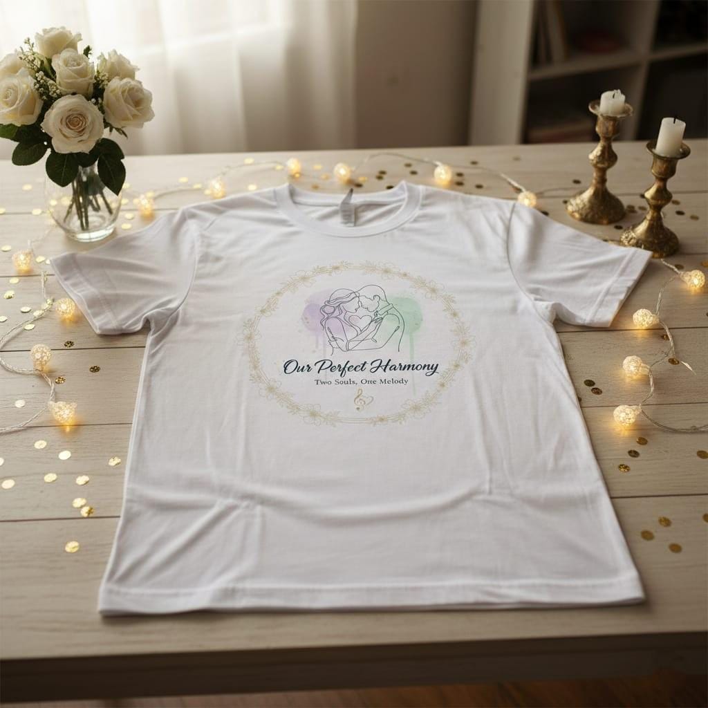 This heartfelt “Our Perfect Harmony – Two Souls, One Melody” design features an intimate couple line-art illustration over soft watercolor washes with delicate gold-style speckles, framed by an elegant floral wreath and a subtle music-note heart—making it a meaningful Valentine’s Day gift for couples (also ideal for anniversaries, engagements, wedding décor, cards, prints, stickers, T‑shirts, mugs, and keepsake signs); delivered as a high-resolution PNG digital download (digital product only; colors may vary slightly by screen and printer).