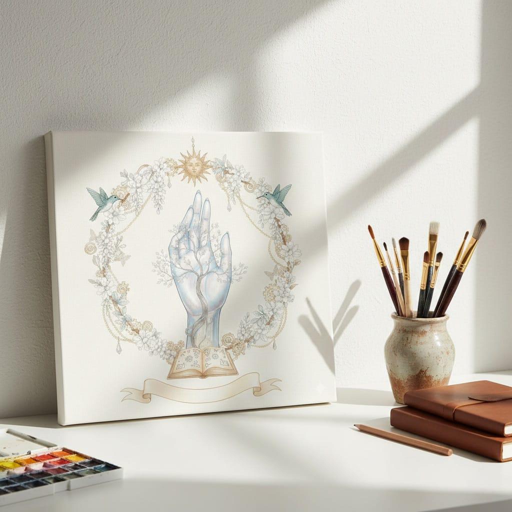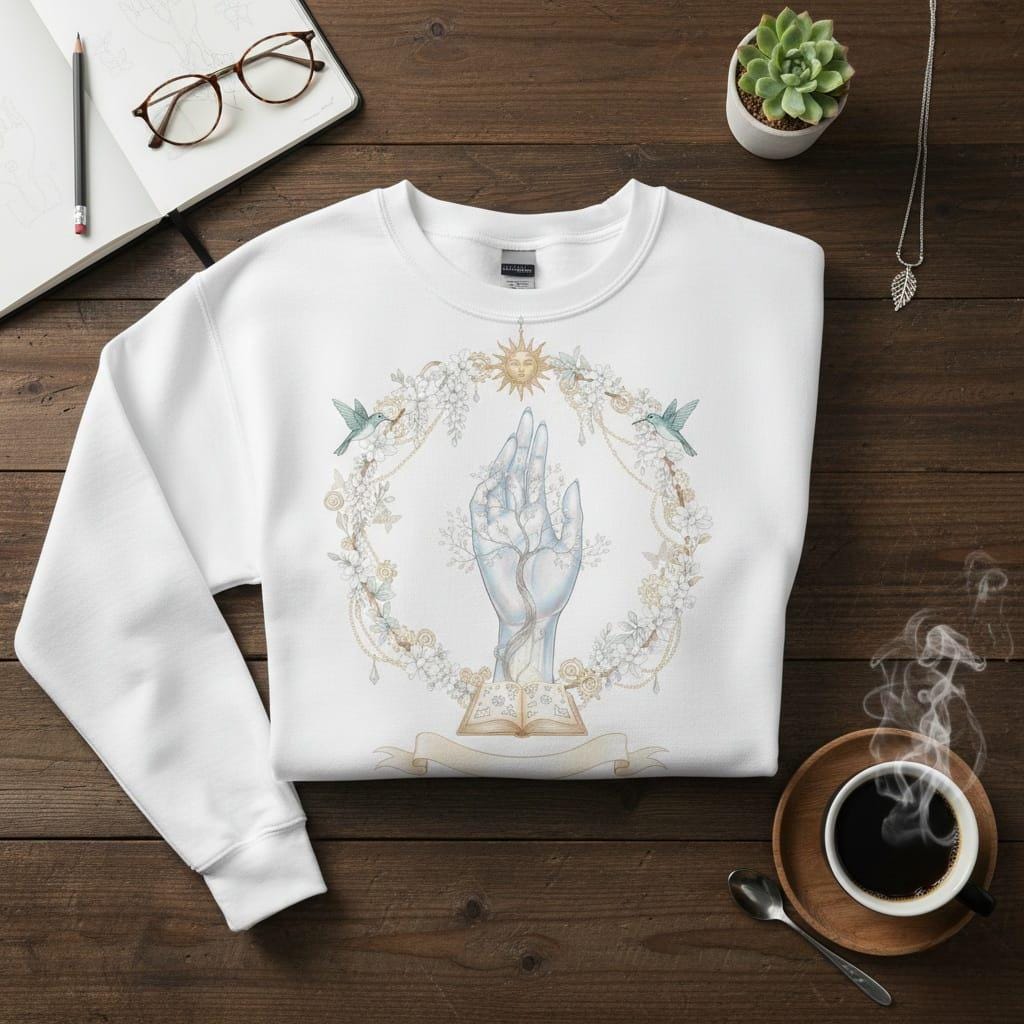 Awaken your creative spirit with this breathtaking circular fantasy illustration; featuring a translucent crystalline hand intertwined with a delicate silver tree of life rising from an ancient open spellbook; framed by a lush wreath of white blossoms, golden steampunk gears, and graceful hummingbirds, all watched over by a serene golden sun; this artwork beautifully blends the themes of nature, magic, and mechanical elegance; perfect for whimsical branding, magical journals, ethereal wedding stationery, and high-end stickers, this high-resolution PNG with a transparent background adds a touch of light and wonder to any digital or physical creation (digital product only; colors may vary slightly by screen and printer).