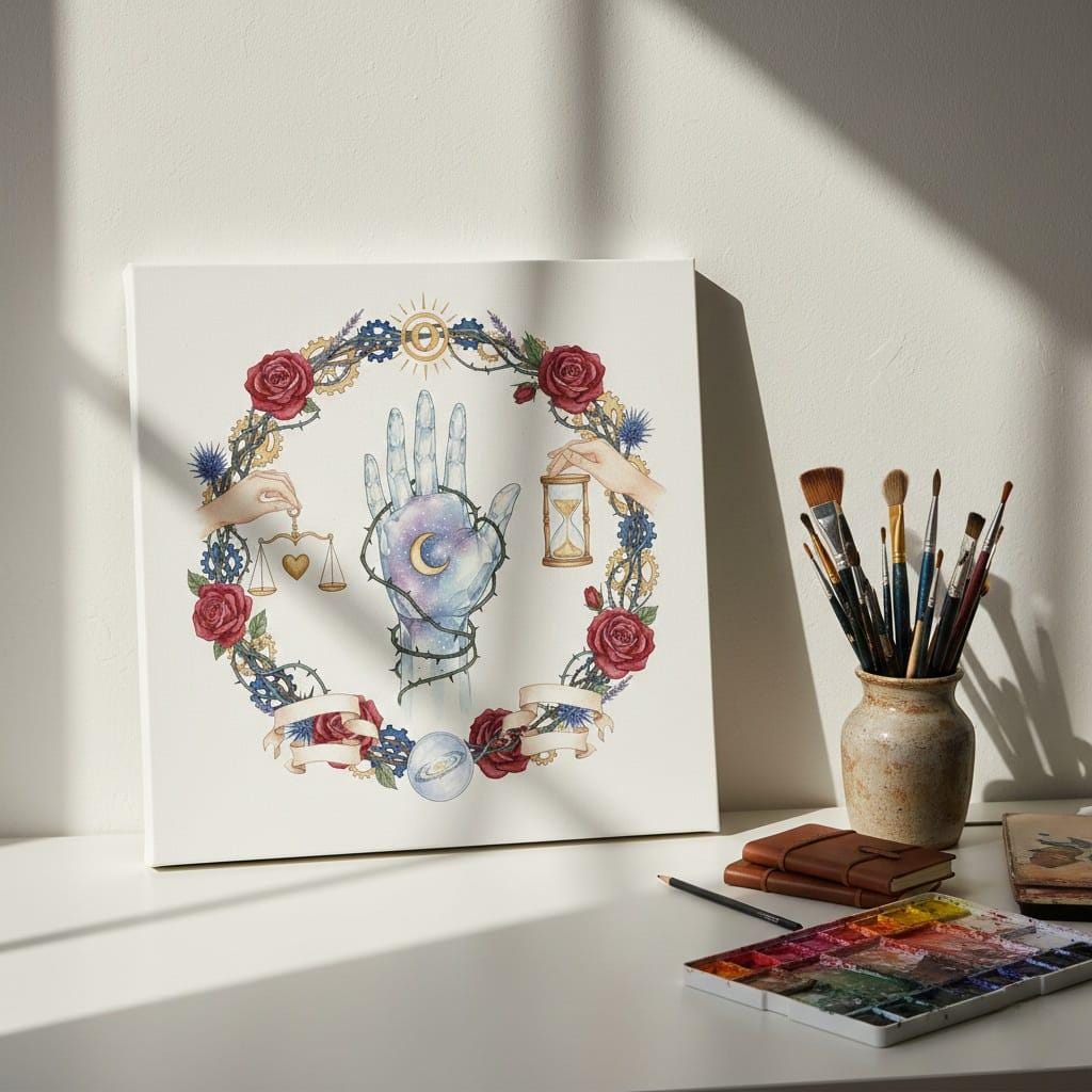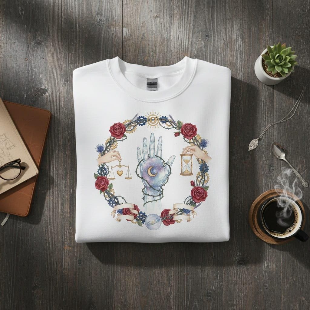Dive into the depths of esoteric wisdom with this intricate circular illustration; featuring a galaxy-textured crystal hand marked with a golden crescent moon and bound by protective thorny vines; flanked by mystical hands holding the scales of the heart and the hourglass of time, this piece represents the ultimate balance between destiny and choice; framed by a dramatic wreath of deep red roses, blue thistles, and intricate steampunk gears, it blends gothic romance with mechanical elegance; perfect for dark academia decor, tarot branding, occult stationery, and high-end digital stickers, this high-resolution PNG with a transparent background offers a powerful and mysterious aesthetic for your most ambitious creative projects (digital product only; colors may vary slightly by screen and printer).
