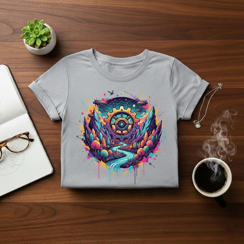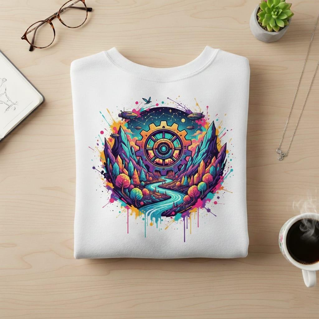This breathtaking illustration merges industrial steampunk elements with a surreal fantasy landscape, featuring a giant mechanical gear overlooking a crystal-lined river, majestic mountains, and futuristic flying vessels; rendered in a vibrant neon palette with artistic paint splatters and drip effects, this high-resolution PNG with a transparent background is perfect for gaming assets, unique stickers, bold apparel designs, and sci-fi themed digital art (digital product only; colors may vary slightly by screen and printer).
