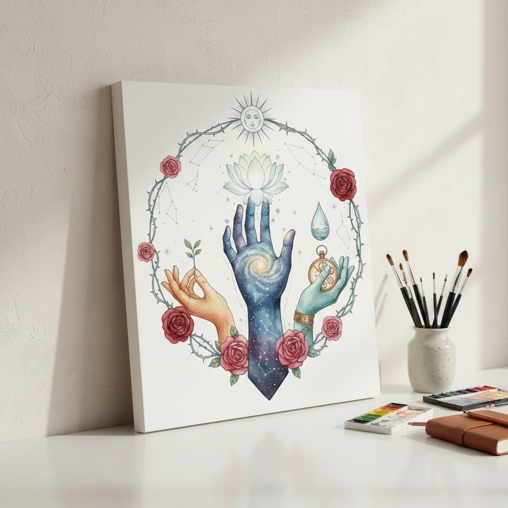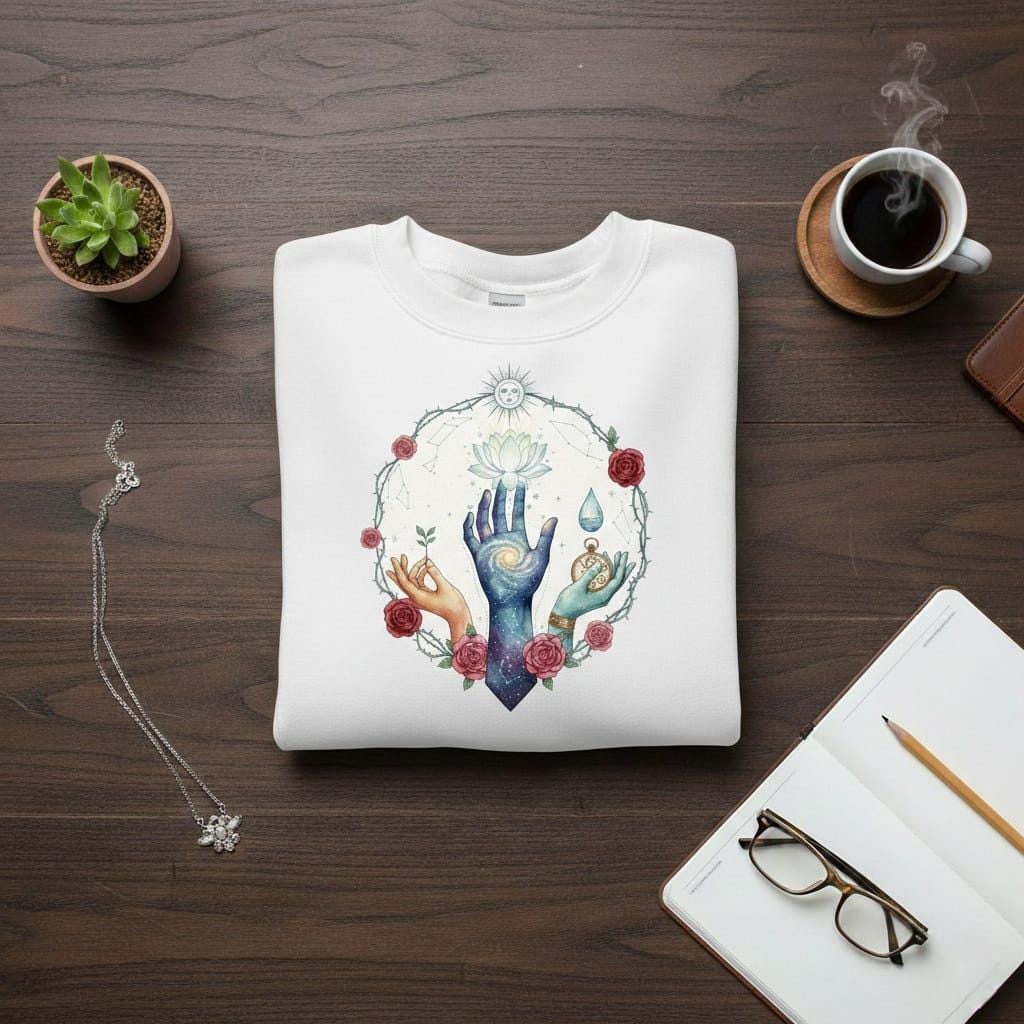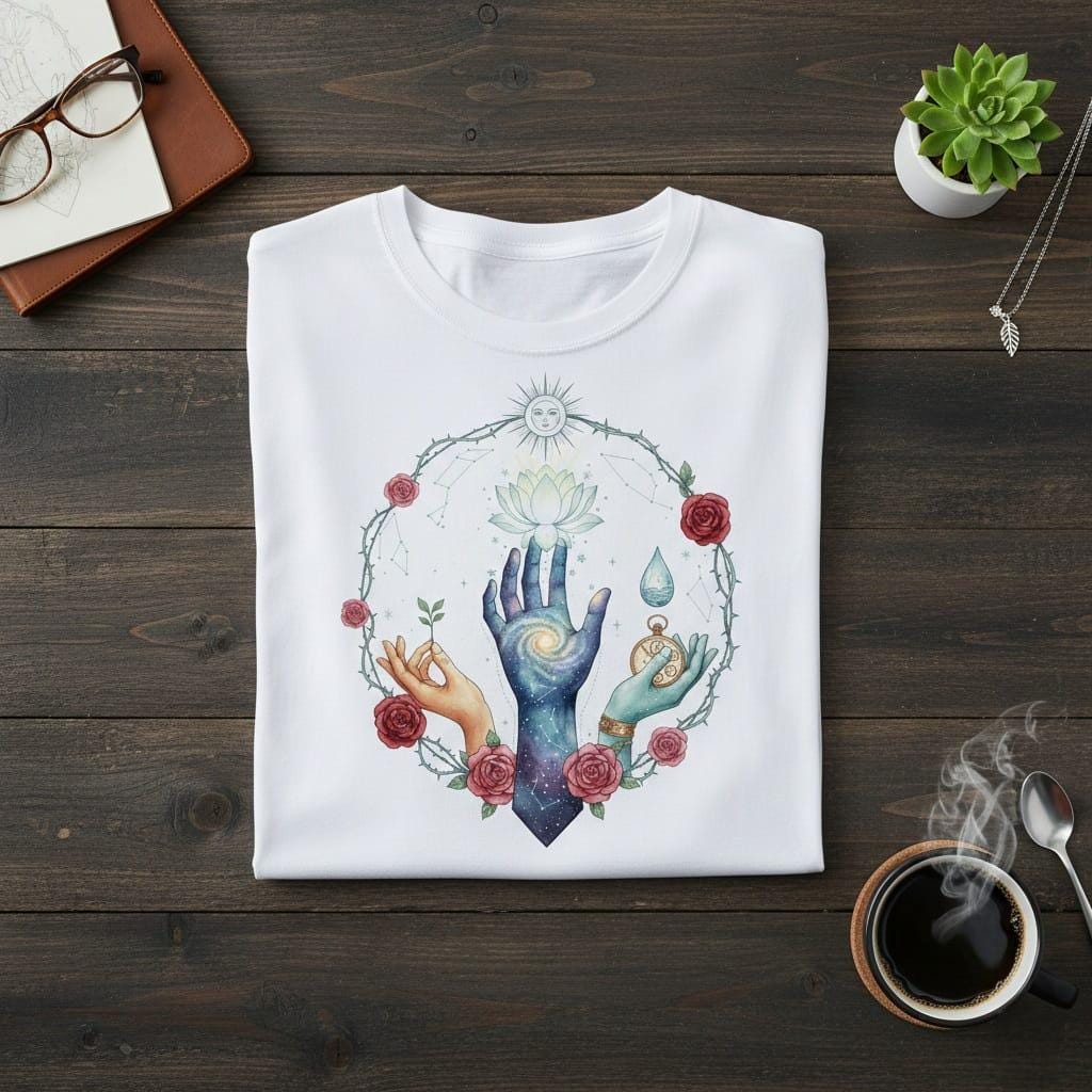 Explore the harmony of existence with this intricate esoteric illustration featuring three symbolic hands; a central galaxy-textured hand lifting a radiant lotus, a hand of nature nurturing a sprout, and a hand of time holding a vintage pocket watch; framed by a thorny vine of roses and celestial constellations under a watchful sun, this artwork masterfully blends cosmic, biological, and temporal themes; perfect for spiritual branding, tarot decks, mystical journals, and high-end apparel, this high-resolution PNG with a transparent background offers a profound and artistic touch to any creative endeavor (digital product only; colors may vary slightly by screen and printer).