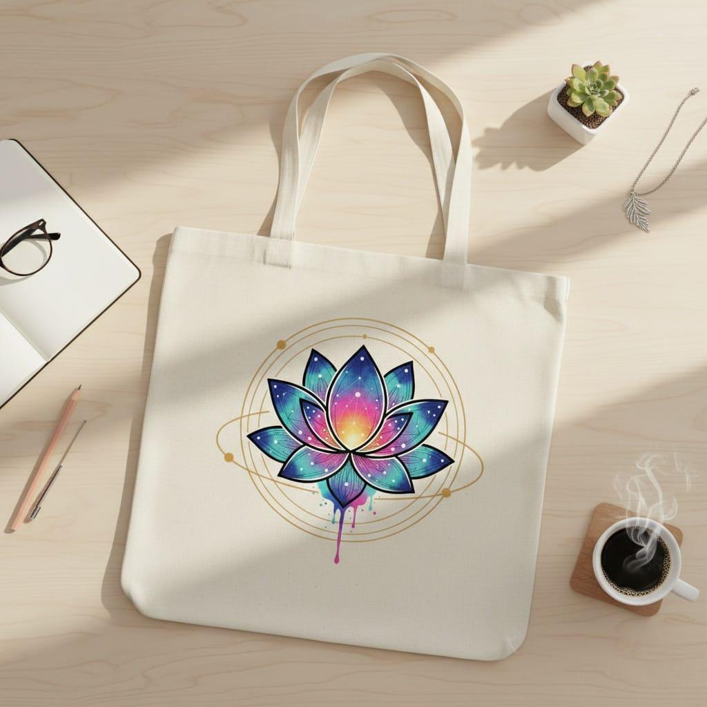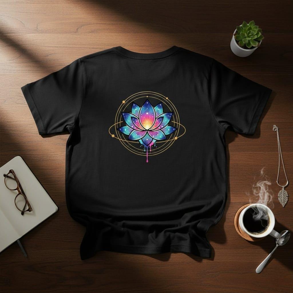 Discover the intersection of sacred geometry and the infinite universe with this stunning Cosmic Lotus illustration; featuring a vibrant watercolor flower infused with galaxy textures in teal, pink, and deep indigo; the design is elegantly framed by golden orbital rings and celestial dots, symbolizing the harmony between the soul and the cosmos; artistic paint drips add a modern, fluid energy to this mystical piece; this high-resolution PNG with a transparent background is an ideal choice for astrology branding, tarot card designs, premium tech accessories, and spiritual wall art; its bold colors and intricate golden details provide a sophisticated and professional look for any creative project (digital product only; colors may vary slightly by screen and printer).