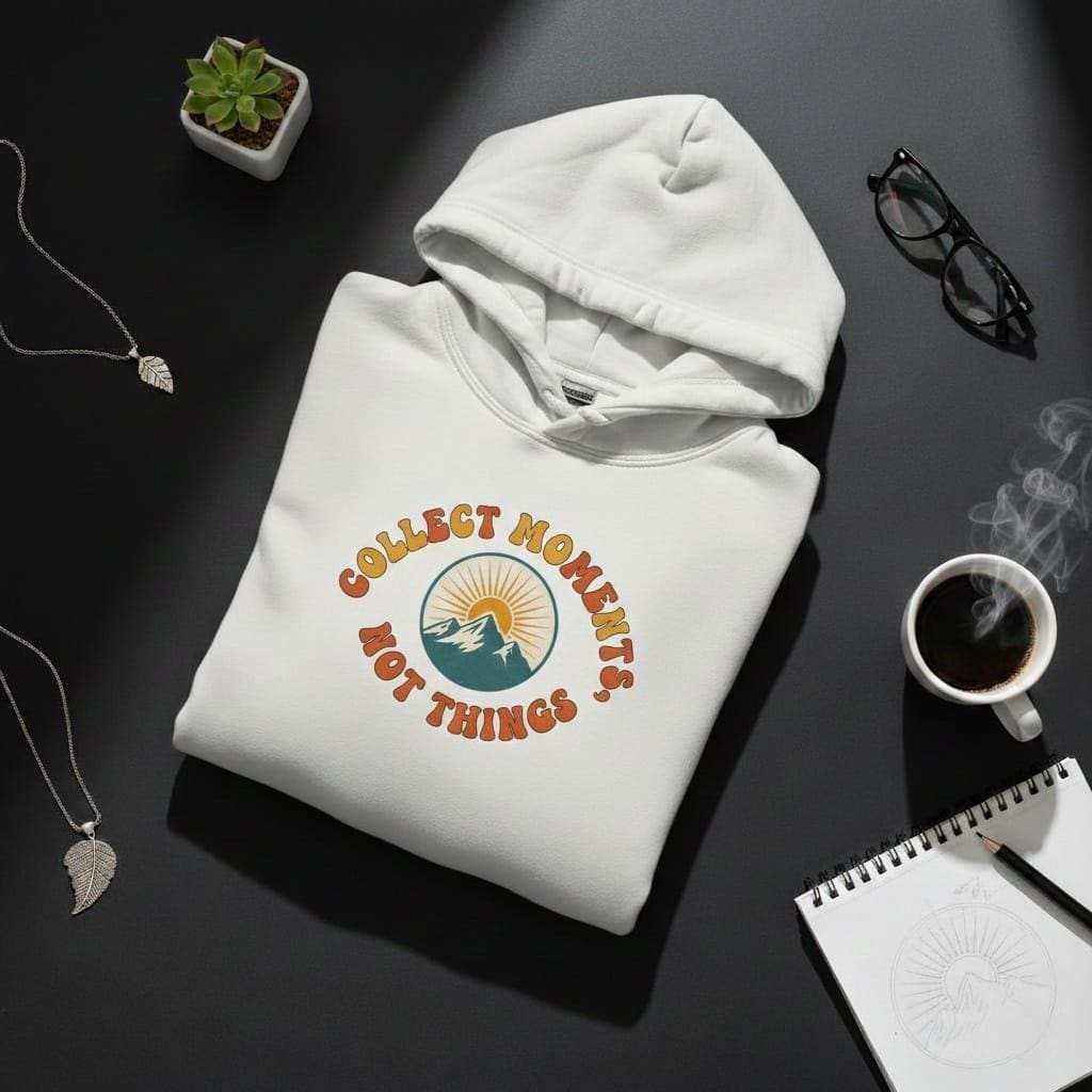 Embrace the spirit of wanderlust with this "Collect Moments, Not Things" retro digital illustration! Inspired by the iconic outdoor aesthetics of the 1970s, this design features a majestic mountain range silhouetted against a radiant rising sun, all enclosed in a classic circular badge; the warm, earthy color palette of sunset orange, golden yellow, and deep teal, combined with a subtle distressed "weathered" texture, gives it an authentic vintage feel; this high-resolution transparent PNG is the ultimate choice for creating custom hiking t-shirts, adventure-themed laptop stickers, rustic cabin wall art, and inspirational social media graphics; perfect for campers, hikers, and anyone who finds peace in the great outdoors; its clean typography and balanced composition make it stand out beautifully on both light and dark fabrics or backgrounds; bring a touch of nostalgic adventure to your DIY projects and remind everyone that the best things in life aren't "things" at all (digital product only; colors may vary slightly by screen and printer).