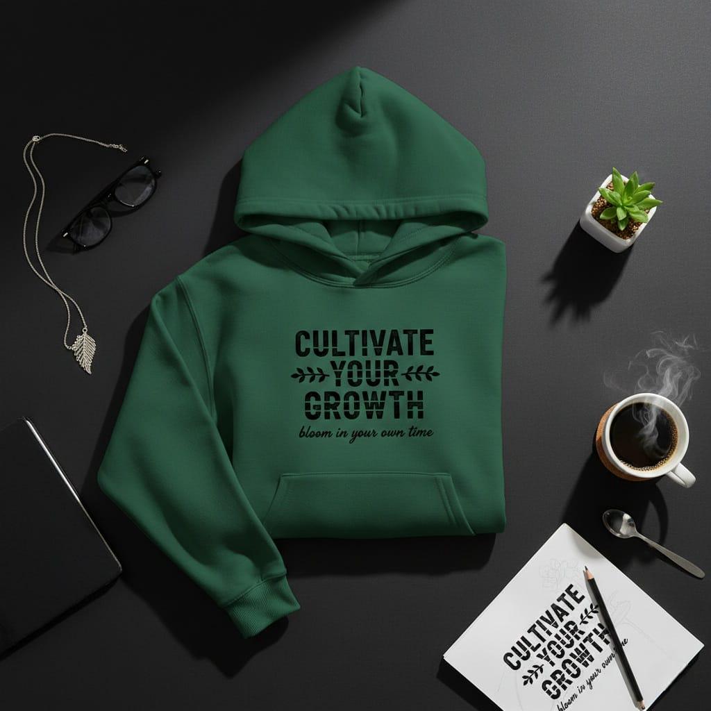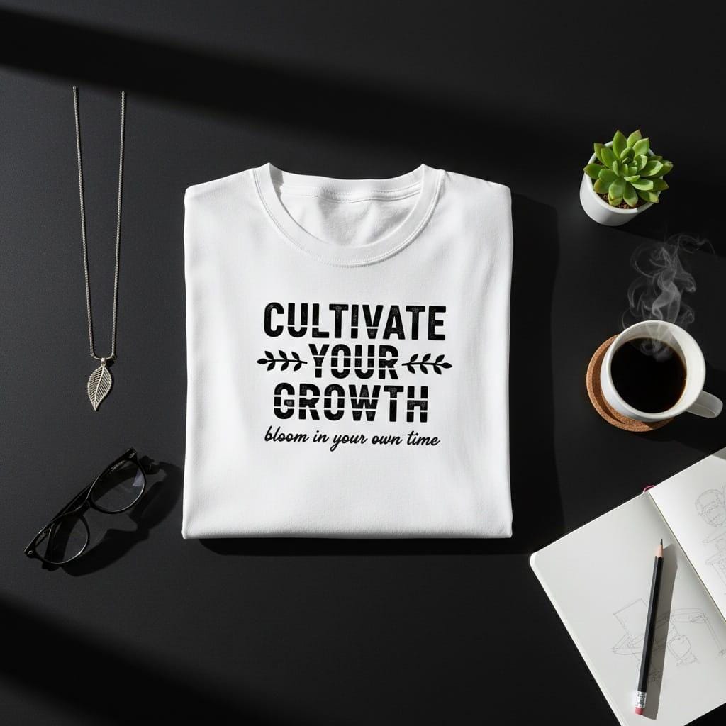 Nurture your soul and honor your unique pace with this "Cultivate Your Growth" digital illustration; a beautifully balanced minimalist design that blends botanical charm with powerful self-care wisdom; the artwork features the main mantra in a bold, distressed sans-serif font, where the horizontal stripes in "YOUR GROWTH" symbolize the steady, layered progress of a life well-lived; delicate leafy branches flank the center, grounding the design in nature and growth; beneath the solid structure, the phrase "bloom in your own time" flows in a graceful, handwritten script, serving as a compassionate reminder that nature never rushes, yet everything gets accomplished; this high-resolution transparent PNG is a perfect asset for creating premium wellness apparel, aesthetic water bottle stickers, motivational garden-themed decor, and serene digital planner covers; whether you're a plant lover, a mental health advocate, or someone embracing a season of transformation, this artwork serves as a visual sanctuary for your journey; its timeless black-and-white aesthetic and organic details make it a versatile addition to any creative project (digital product only; colors may vary slightly by screen and printer).