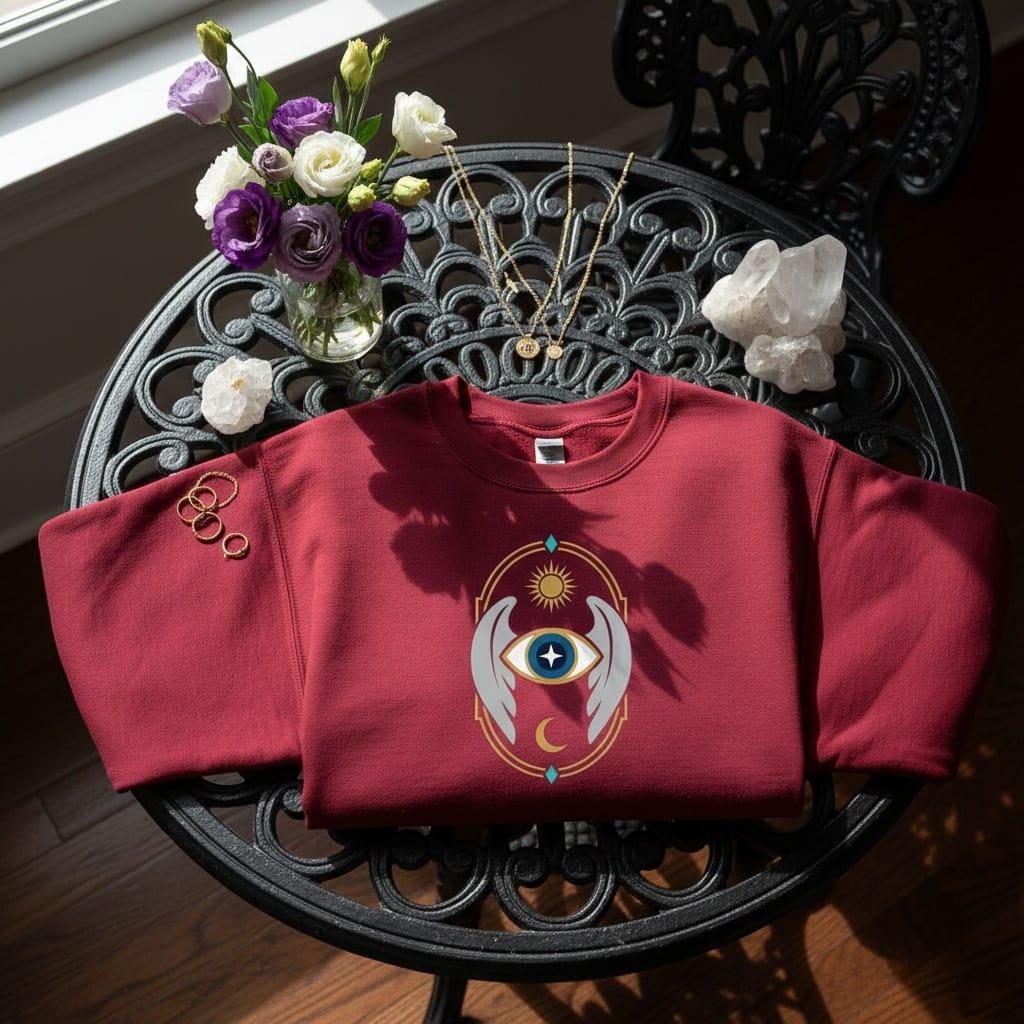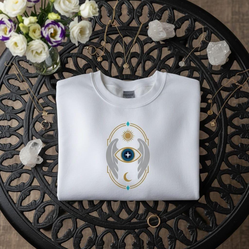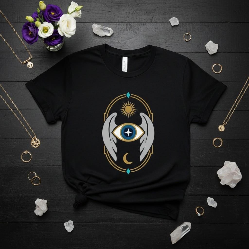 Embrace the perfect harmony of the universe with this elegant "Cosmic Balance" illustration; a masterfully crafted piece that unites the powerful symbols of the sun, moon, and the all-seeing eye; featuring a deep navy eye with a brilliant white star pupil, this design is cradled by ethereal silver wings that symbolize spiritual ascension; the composition is beautifully framed within a golden oval, crowned by a radiant sun for vitality and anchored by a serene crescent moon for intuition; delicate teal diamond accents at the poles add a touch of modern refinement to this ancient-inspired emblem; this high-end aesthetic is perfect for astrology branding, holistic wellness logos, and boho-chic home decor; the clean lines and sophisticated color palette of gold, silver, and navy make it an exceptional choice for high-quality sublimation on organic cotton t-shirts, meditation journals, celestial wall art, and digital planners; whether you are looking for a unique "Alchemy" inspired logo or a standout piece of sacred geometry art, this high-resolution transparent PNG provides endless versatility for both personal and commercial crafting; its symmetrical and peaceful composition ensures it remains a timeless favorite for professional business cards, sophisticated scrapbooking, and gallery-worthy prints; perfect for adding a touch of divine wisdom and ethereal elegance to your digital or physical products (digital product only; colors may vary slightly by screen and printer).