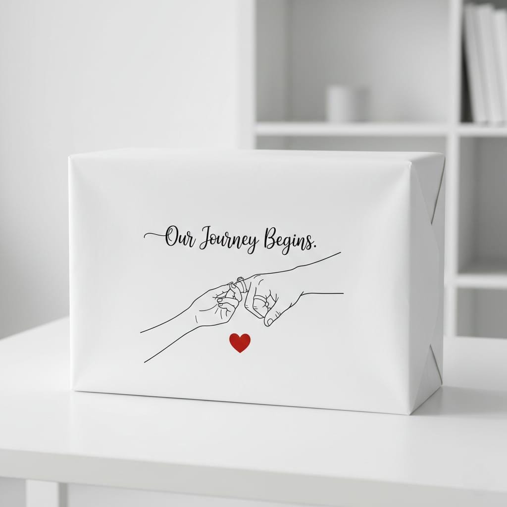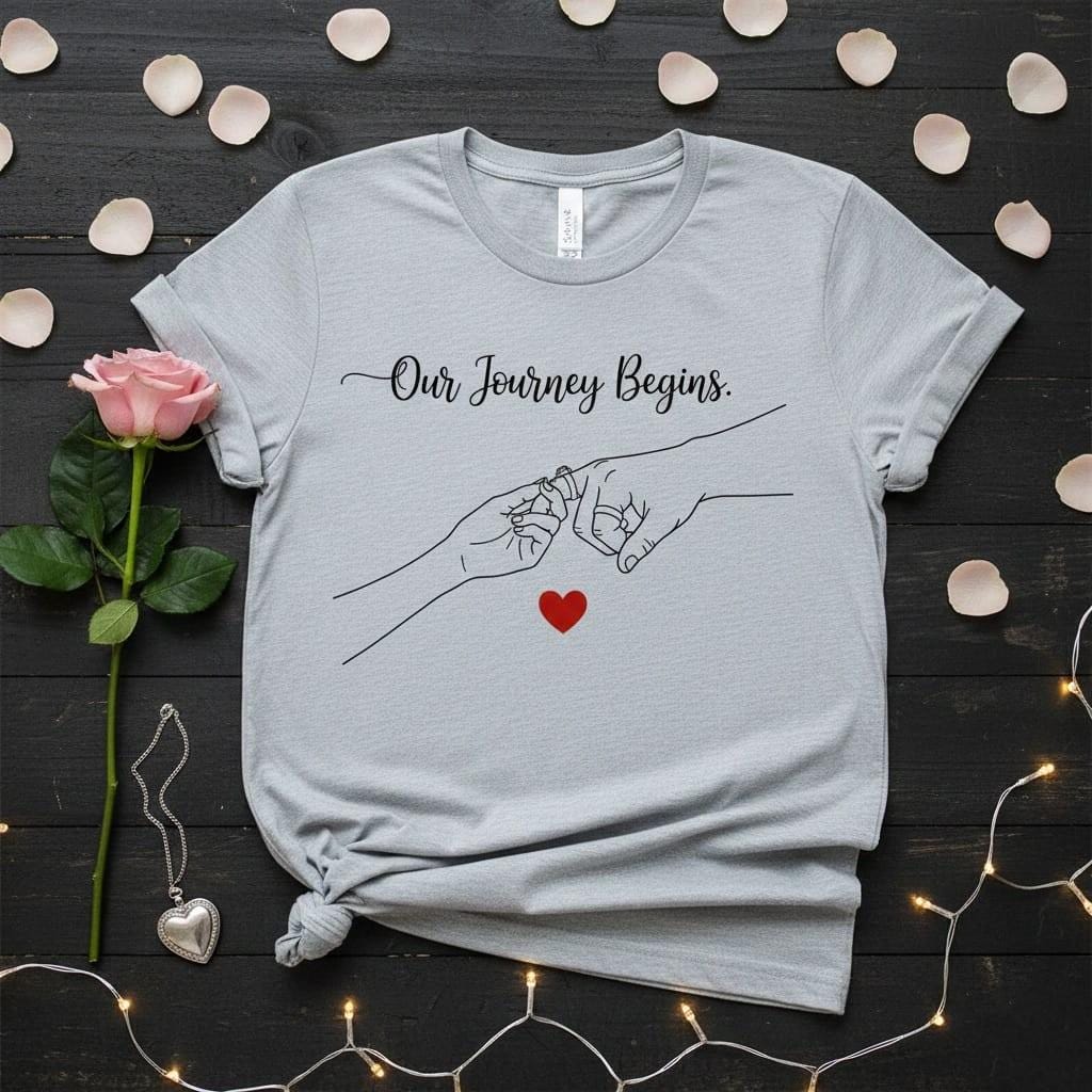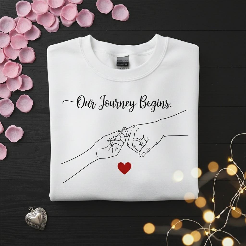 Celebrate the start of your forever with this "Our Journey Begins." elegant digital design; a sophisticated and deeply symbolic masterpiece featuring minimalist pinky swear line art with wedding rings and a vibrant red heart, crafted to be a sentimental engagement gift or a heartfelt wedding gift for newlyweds; the beautiful black cursive script sits gracefully above a delicate illustration of two hands making a sacred promise while wearing their rings, capturing the essence of marriage, unity, and the first step of a shared life; it is the perfect choice for those seeking a modern and artistic gift for a bride and groom that represents their new chapter; this high-resolution transparent PNG is ideal for premium sublimation on wedding-themed sweatshirts, minimalist home decor, personalized marriage announcement cards, and custom anniversary gifts; whether you are celebrating a proposal, a wedding day, or a first anniversary, this versatile line art design ensures a professional and high-end finish for all your DIY projects; its clean composition and trendy "wedding ring" motif make it a standout addition to any "bridal" or "minimalist aesthetic" collection; perfect for adding a touch of calligraphic charm and radiant love to your creative product line (digital product only; colors may vary slightly by screen and printer).