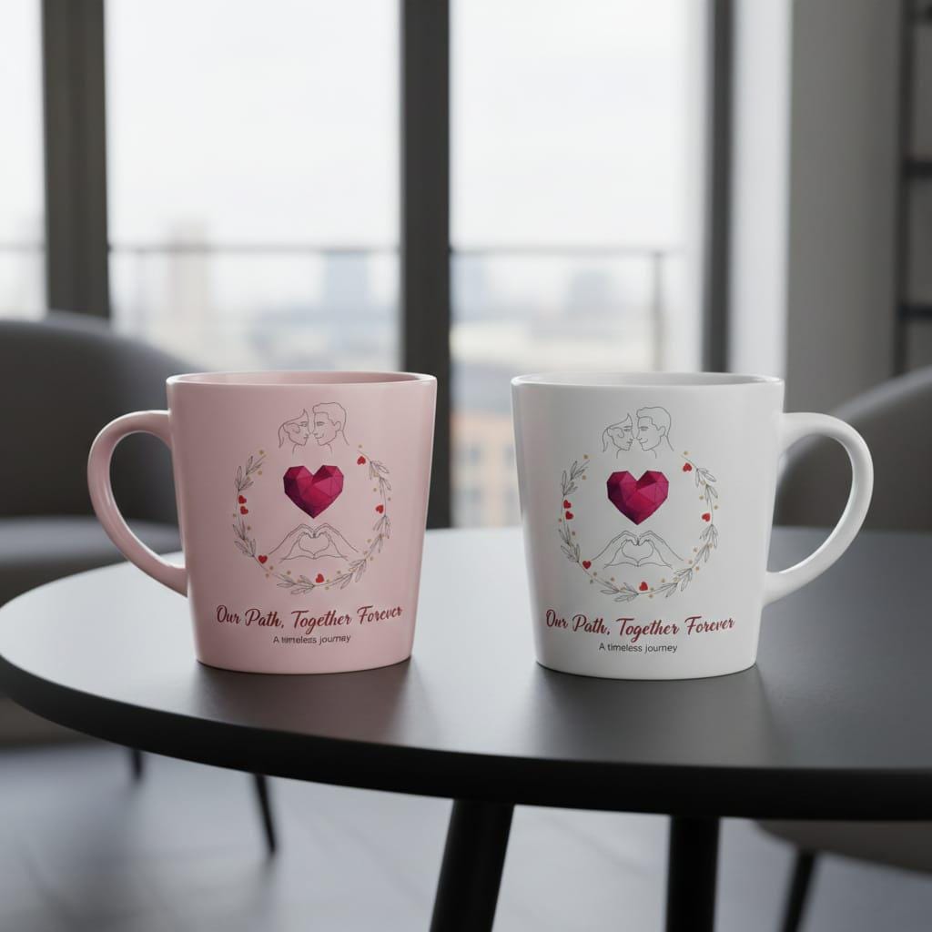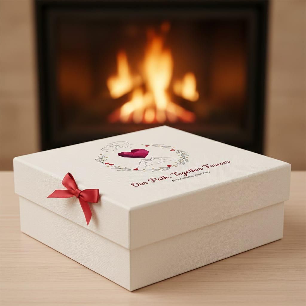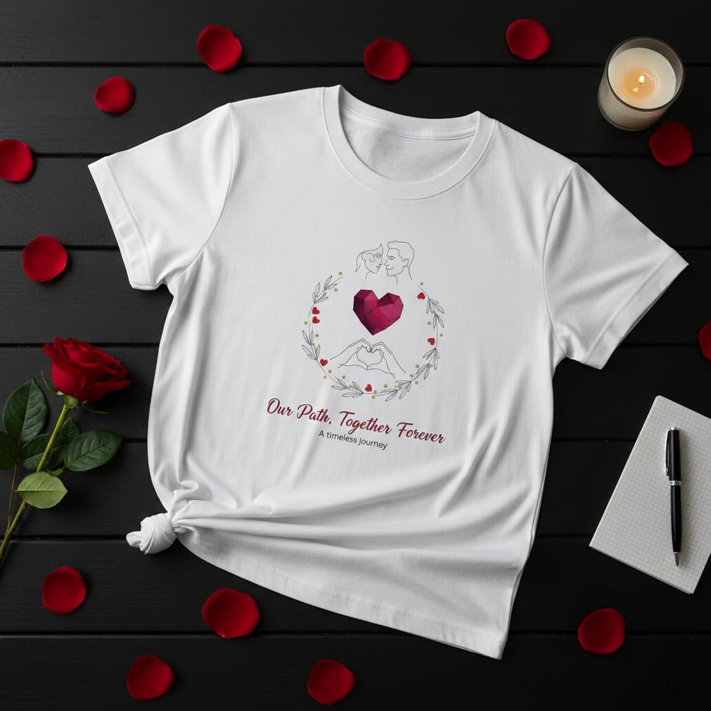 Celebrate the beautiful journey of love with this captivating Our Path, Together Forever digital design; featuring a minimalist line-art couple gazing at each other above a bold, red geometric heart, this artwork perfectly symbolizes a modern and enduring romance; the addition of the iconic "heart hands" gesture and a delicate leafy wreath adorned with gold glitter and red hearts adds a touch of magic and elegance; this high-resolution transparent PNG is expertly designed for sublimation on high-end products like anniversary hoodies, custom coffee mugs, romantic throw pillows, and personalized wedding cards; the soulful subtitle "A timeless journey" makes it an ideal choice for couples celebrating milestones, engagements, or Valentine's Day; the striking contrast of red, white, and gold ensures your creations will stand out with a professional and artistic flair; whether you are crafting a DIY gift for your soulmate or expanding your shop's romantic collection, this Together Forever piece tells a story that lasts a lifetime (digital product only).