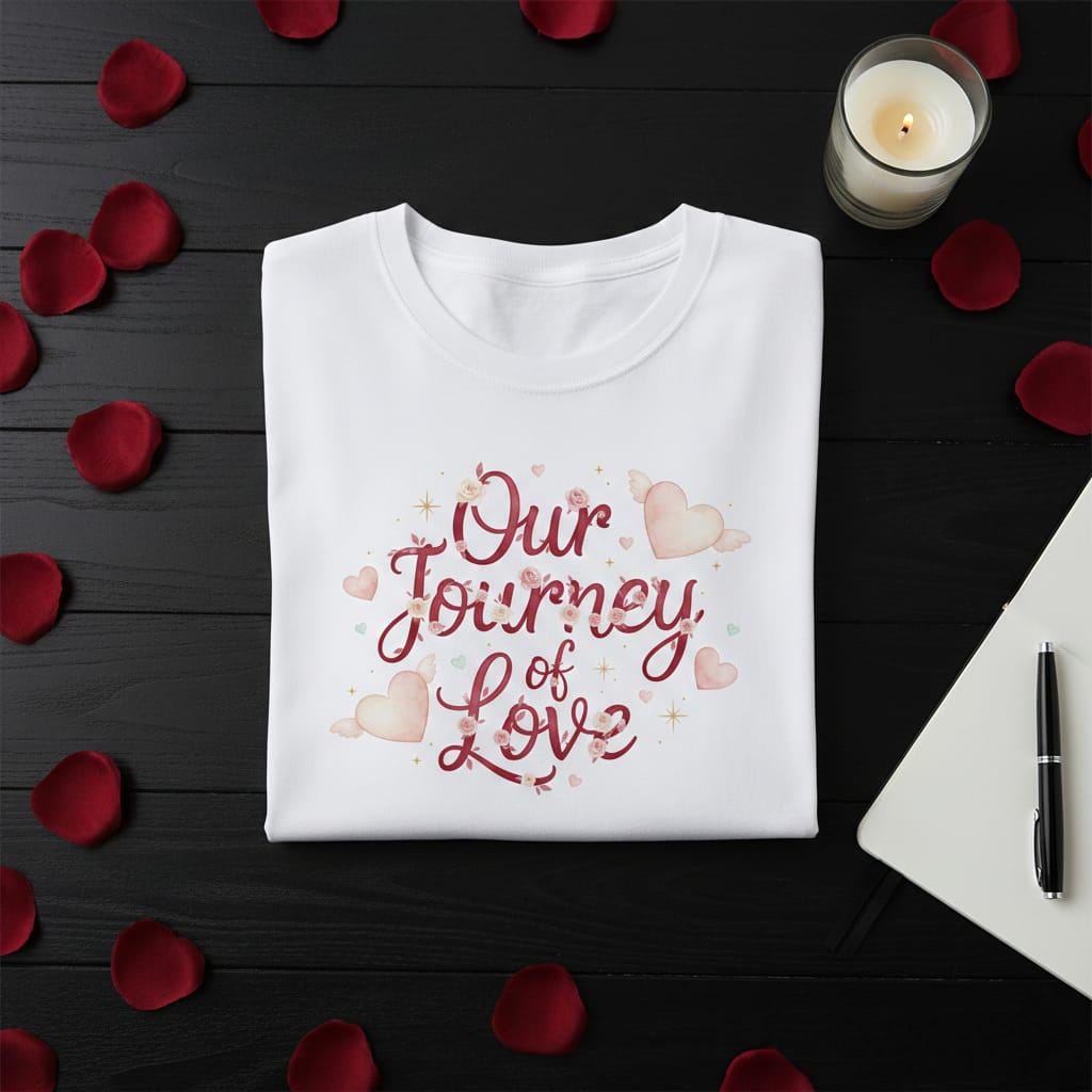 Celebrate your unique story with this breathtaking Our Journey of Love digital typography design; featuring elegant burgundy cursive lettering entwined with delicate hand-painted pink roses, this artwork is a masterpiece of romantic expression; the design is beautifully accented with whimsical winged hearts, floating petals, and shimmering gold sparkles that create a magical atmosphere; this high-resolution transparent PNG is perfectly optimized for premium sublimation projects such as anniversary tote bags, romantic throw pillows, personalized wedding stationery, and elegant wall decor; the sophisticated blend of floral elements and classic script makes it an ideal choice for Valentine's Day, bridal showers, or milestone anniversary gifts; whether you are creating a heartfelt keepsake for a loved one or adding a touch of vintage-inspired romance to your digital shop, this Floral Love Quote design offers a professional and artistic touch that speaks volumes; let your love take flight with a design as beautiful as your journey together (digital product only).