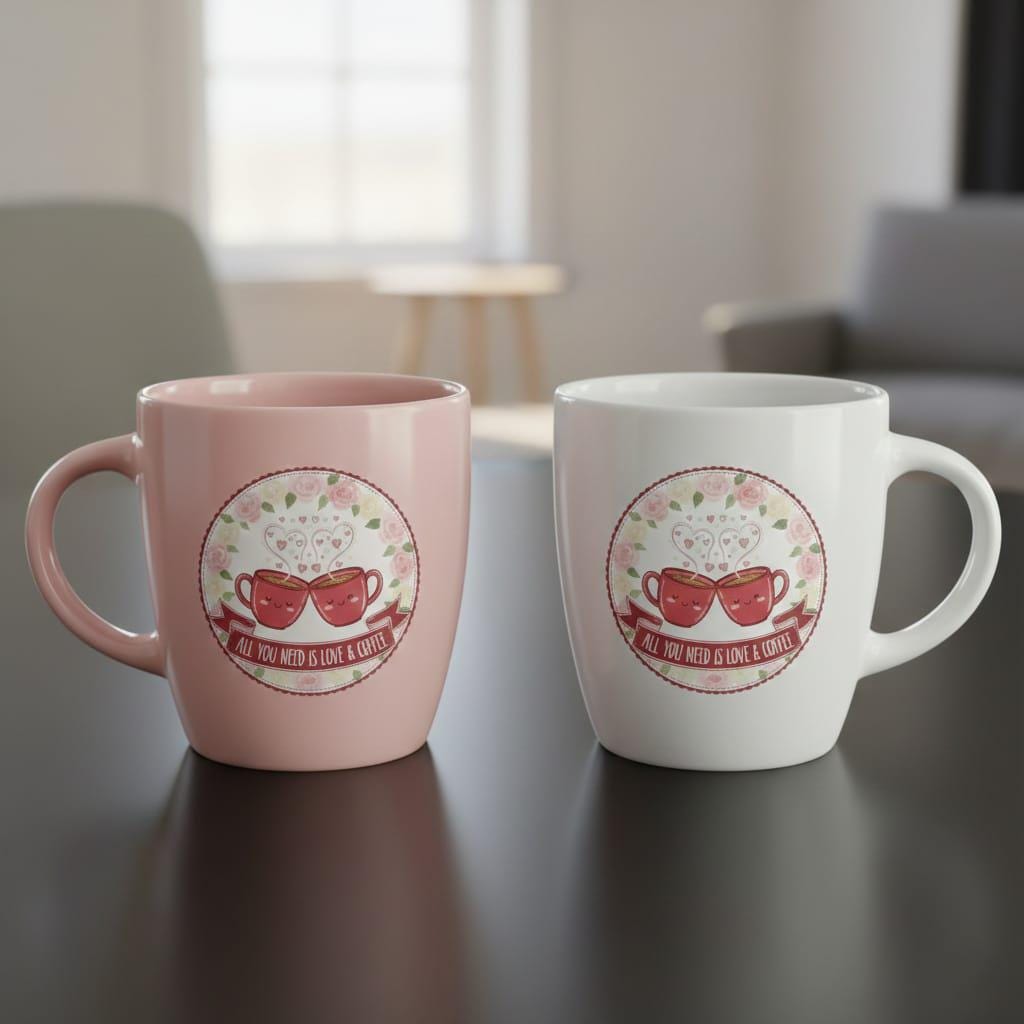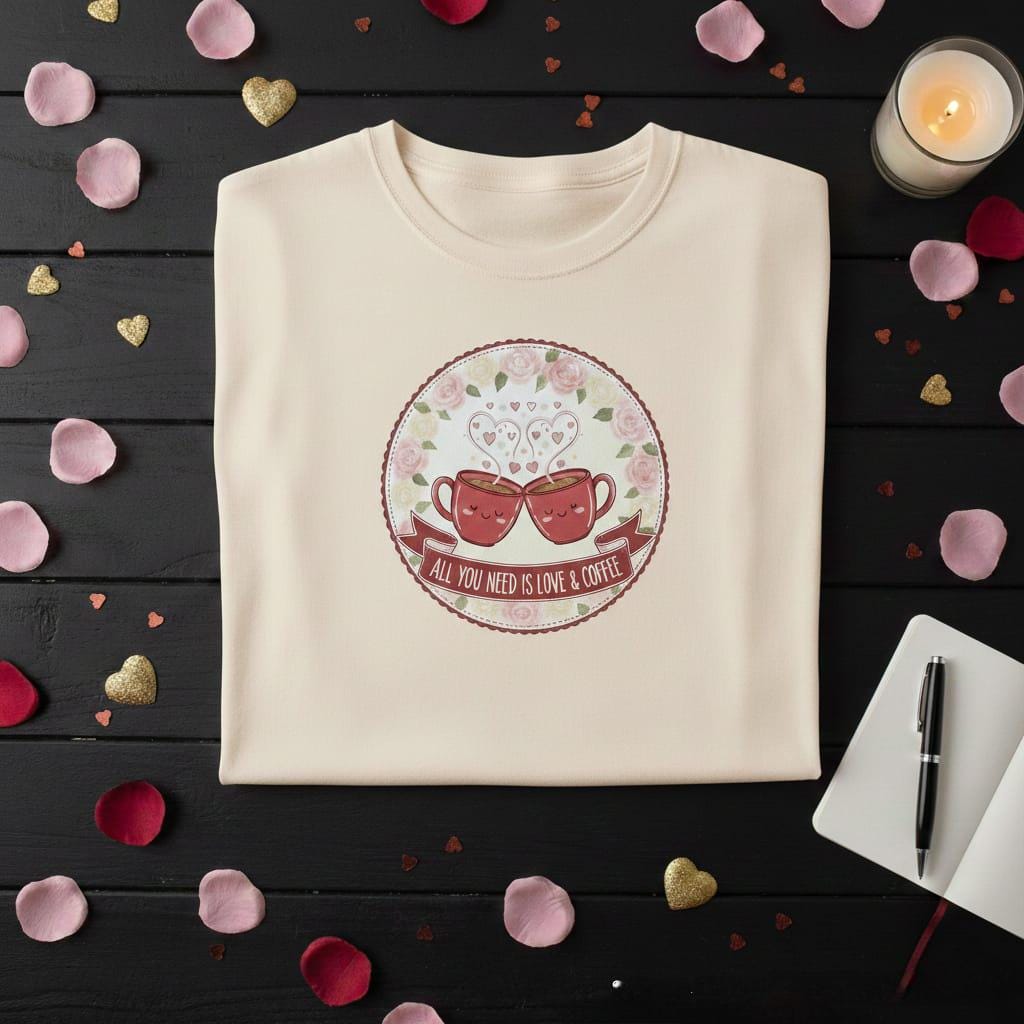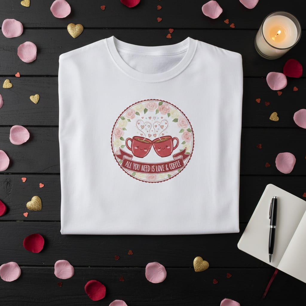 Warm up your creative projects with this adorable Love & Coffee digital design; featuring two charming, smiling coffee mugs clinking together in a joyful toast, this artwork perfectly captures the cozy essence of a coffee date; the mugs emit whimsical heart-shaped steam, symbolizing a bond that is as strong and comforting as a fresh brew; the entire scene is beautifully framed by a lush circular wreath of soft pink and white watercolor roses, adding a touch of classic romance to the playful "Kawaii" style; a graceful burgundy banner at the base features the popular quote "All You Need Is Love & Coffee" in a clean, modern font; this high-resolution transparent PNG is an ideal choice for a wide range of sublimation products, especially personalized coffee mugs, decorative kitchen towels, stylish aprons, and "Galentine's Day" greeting cards; the gentle pastel palette and heartwarming theme make it a versatile piece for Valentine's Day, anniversaries, or simply as a treat for the coffee enthusiast in your life; whether you are designing for a cozy cafe aesthetic or a heartfelt personal gift, this Floral Coffee Mugs design brings a smile and a sense of warmth to every application (digital product only).