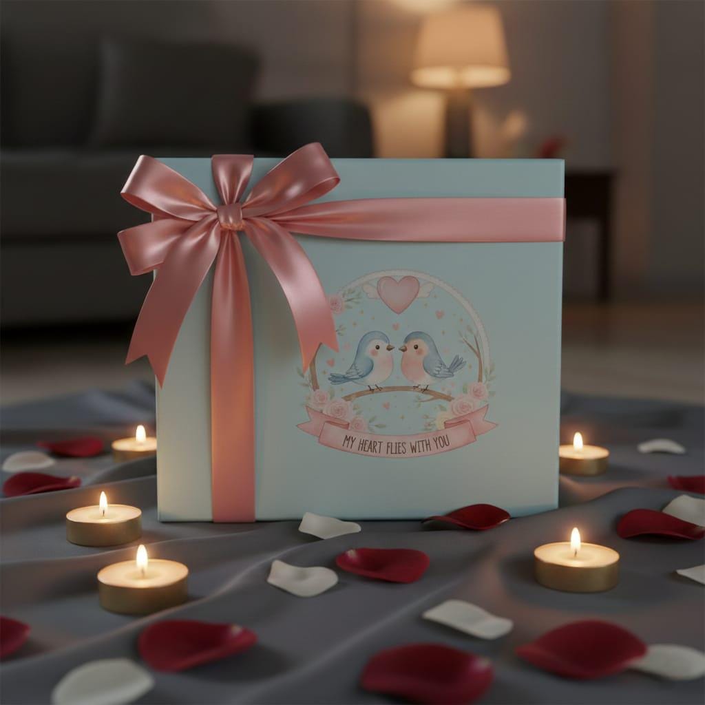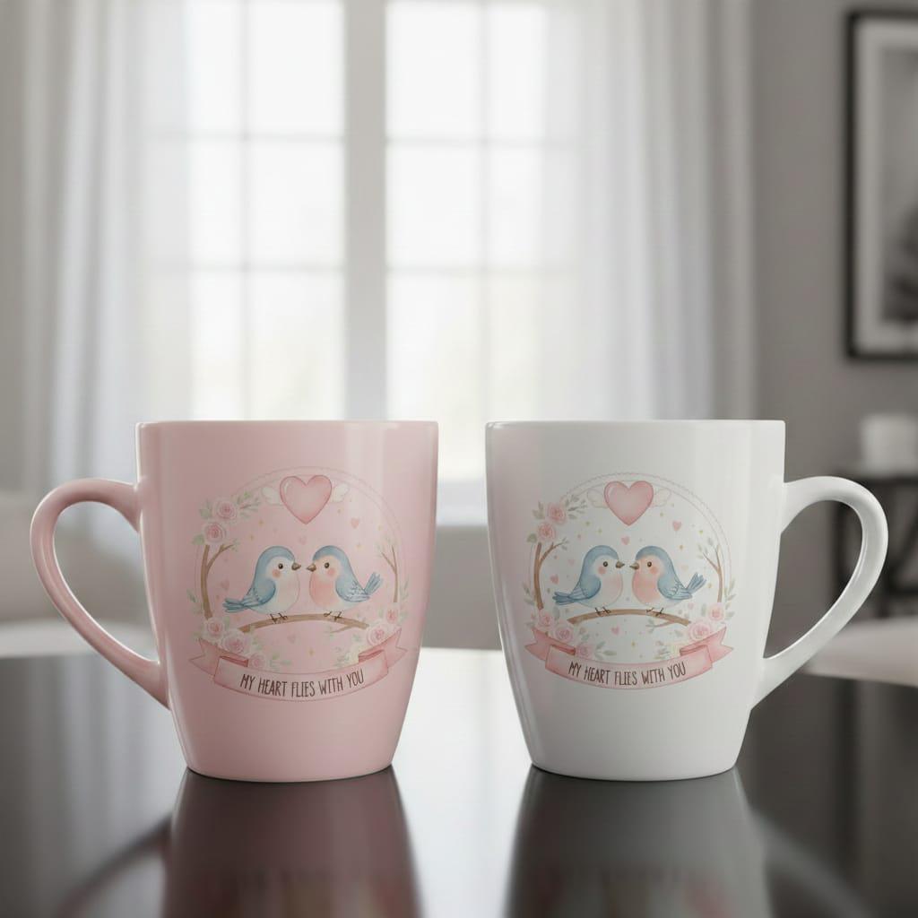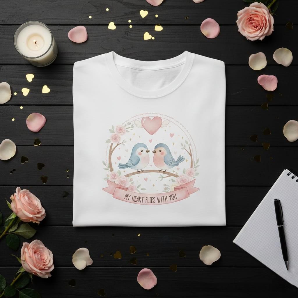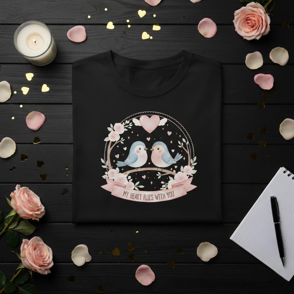 Let your love take flight with this enchanting My Heart Flies With You digital design; featuring two sweet watercolor bluebirds perched together on a rustic branch, this artwork is a beautiful celebration of companionship and devotion; above the pair, a soft pink heart with delicate wings symbolizes a love that transcends boundaries, while a trail of golden stars and tiny hearts adds a touch of celestial magic; the entire scene is framed by a dainty, lace-edged circular border entwined with lush pink roses and botanical greenery; the elegant pink ribbon at the base carries the poetic sentiment "My Heart Flies With You", making it a perfect choice for long-distance relationship gifts, wedding anniversaries, or heartfelt Valentine's Day surprises; this high-resolution transparent PNG is expertly crafted for premium sublimation on "cottagecore" style apparel, decorative throw pillows, personalized ceramic mugs, and bespoke wedding stationery; the soft pastel color palette of sky blue and dusty rose offers a timeless, whimsical aesthetic that fits perfectly into modern romantic decor; whether you are creating a "thinking of you" card or a special gift for your soulmate, this Whimsical Lovebirds design brings a sense of peace and wonder to every project (digital product only).