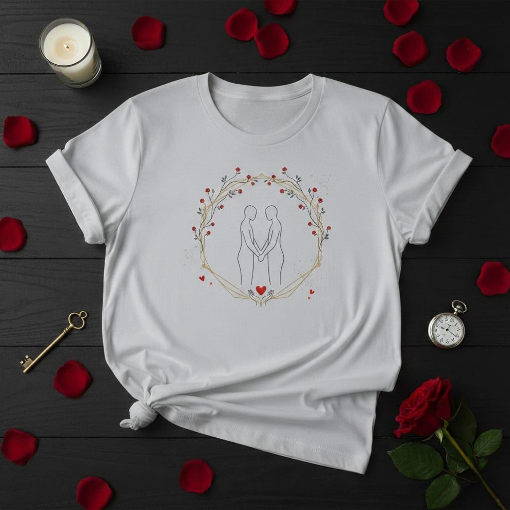 Celebrate a soul-deep connection with this stunning Soulmate Unity digital design; featuring two minimalist line-art silhouettes holding hands within a sophisticated multi-layered gold geometric frame, this artwork symbolizes the strength and beauty of a shared journey; the frame is delicately entwined with vibrant red watercolor roses and accented by shimmering gold dust, creating a perfect balance between modern minimalism and classic romance; at the base, a pair of hands gently cradles a bright red heart, grounding the design in a message of care and devotion; this high-resolution transparent PNG is ideal for premium sublimation projects such as custom wedding invitations, "soulmate" themed apparel, minimalist bedroom wall decor, and personalized anniversary mugs; the clean white outlines against a dark background (or vice versa) provide a professional and high-contrast finish that suits any contemporary product line; whether you are designing for a modern wedding or a heartfelt Valentine's Day gift, this Geometric Rose Couple design offers a refined and artistic way to celebrate love (digital product only).