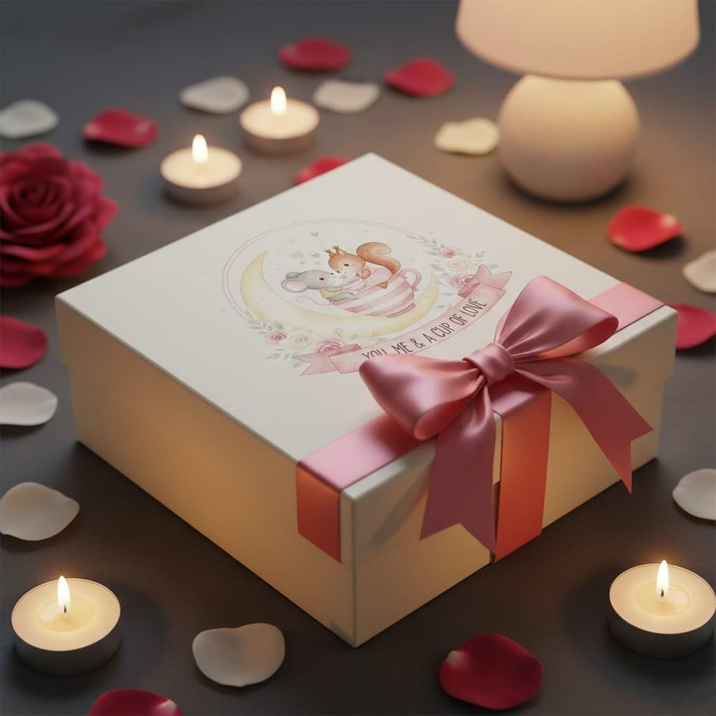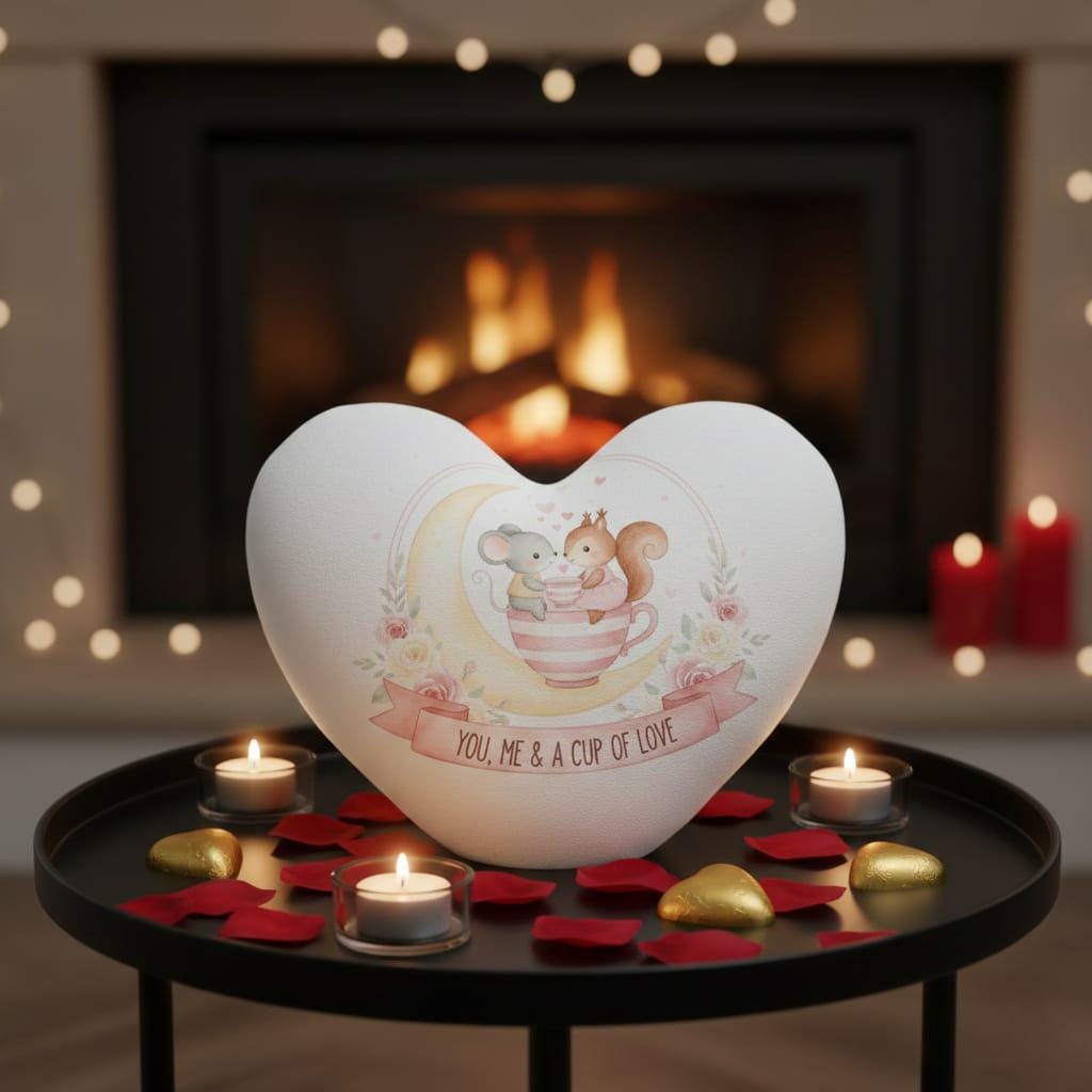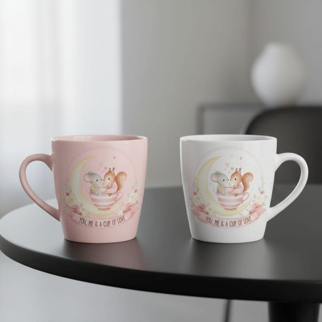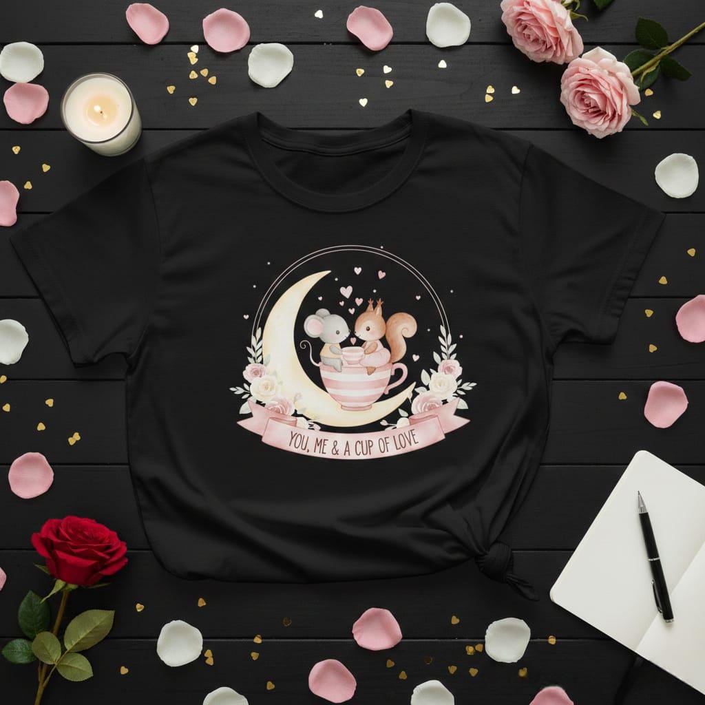 Sip on the sweetness of love with this whimsical Cup of Love digital design; featuring a tiny mouse and a charming squirrel sharing a cozy moment inside a striped teacup perched upon a glowing crescent moon, this artwork is the definition of "dreamy romance"; the scene is filled with floating pink hearts and delicate golden sparkles, creating a magical atmosphere that feels like a page from a classic fairy tale; the composition is elegantly framed by a semi-circular wreath of soft pink and ivory watercolor roses, adding a vintage floral charm; the graceful pink banner at the base carries the heartwarming sentiment "You, Me & A Cup of Love", making it a perfect tribute to quiet moments shared with a soulmate; this high-resolution transparent PNG is ideal for premium sublimation on tea-themed kitchenware, cozy loungewear, personalized anniversary journals, and "shabby chic" home decor; the soft pastel color palette and enchanting celestial theme offer a unique aesthetic that appeals to tea lovers, nature enthusiasts, and dreamers alike; whether you are designing a gift for a "tea-riffic" partner or creating nursery wall art for a little one's room, this Moon & Teacup design adds a touch of poetic wonder to every project (digital product only).