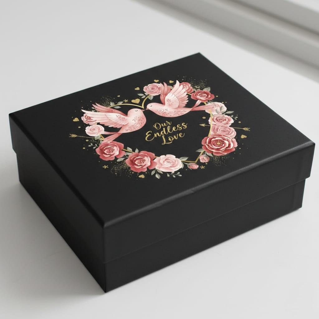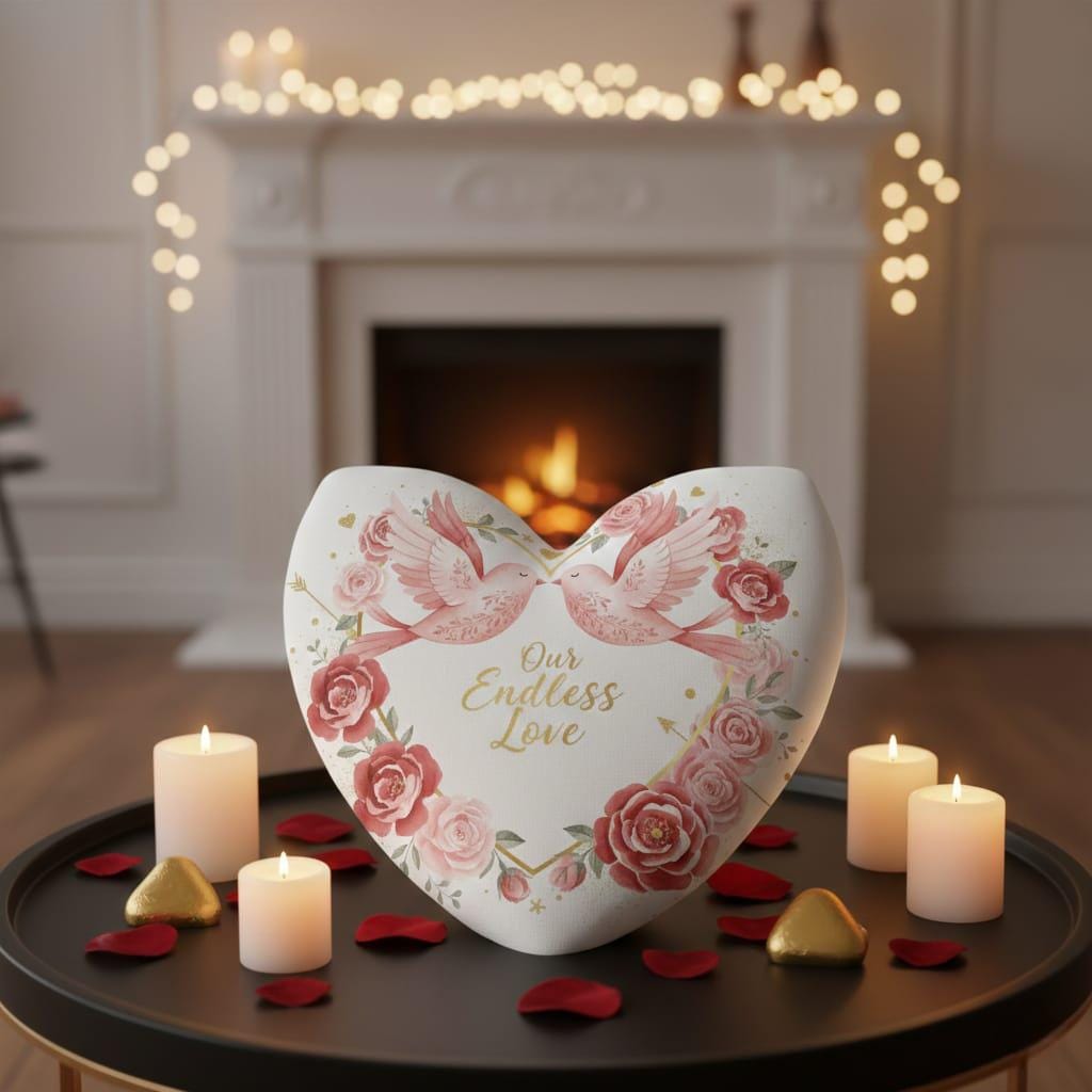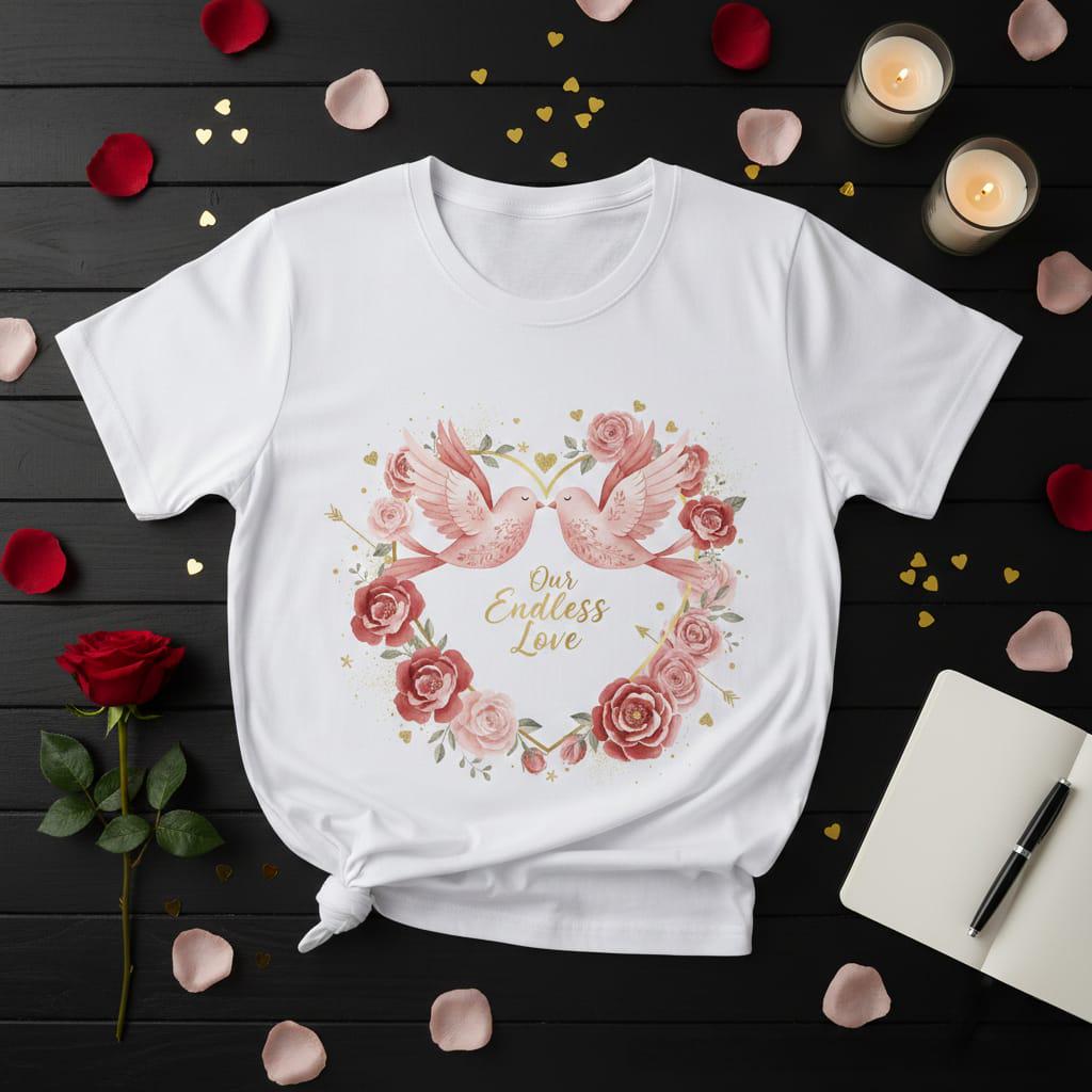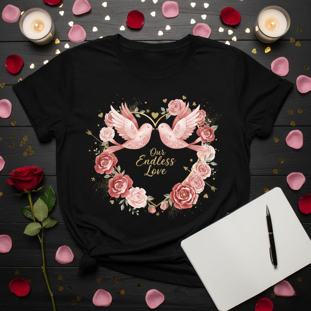 Soar into a world of eternal romance with this breathtaking Our Endless Love digital design; featuring two graceful pink birds perched atop a shimmering golden heart-shaped frame, this artwork is a poetic celebration of companionship and devotion; the heart is lushly adorned with a magnificent wreath of watercolor roses in deep crimson and soft blush tones, creating a vibrant and textured floral border; the composition is sprinkled with magical gold glitter accents, including floating hearts, twinkling stars, and Cupid’s arrows that pierce through the blooms, symbolizing a love that is both fated and protected; the elegant gold script typography at the center carries the timeless message "Our Endless Love", making it an exquisite choice for wedding anniversaries, bridal showers, or heartfelt Valentine's Day surprises; this high-resolution transparent PNG is perfectly suited for premium sublimation on "boho-chic" apparel, decorative throw pillows, personalized wedding stationery, and bespoke wall gallery prints; the rich, warm color palette and intricate "fairytale" aesthetic offer a high-end look that resonates with couples seeking a unique and sentimental gift; whether you are creating a custom keepsake for a soulmate or adding a touch of whimsical elegance to your shop, this Lovebirds & Roses design brings a sense of wonder and lasting beauty to every creative project (digital product only).