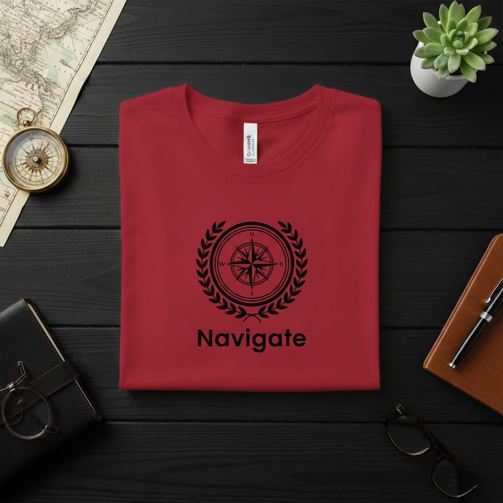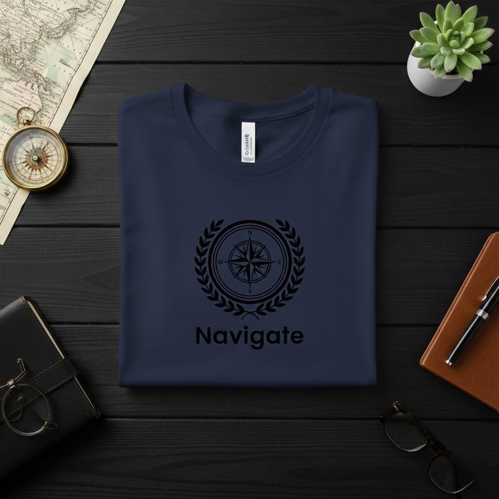 Chart your course with the precision and honor of this Navigate Compass digital design; a masterfully balanced emblem that speaks to the heart of every explorer and leader; this illustration features a highly detailed nautical windrose with crisp cardinal directions (N, S, E, W), elegantly enclosed within a multi-layered circular frame and a classic white laurel wreath; the bold "Navigate" typography at the base serves as a powerful call to action, symbolizing purpose, direction, and the courage to find one's own path; the clean, high-contrast white line art on a black background offers a sophisticated "modern maritime" aesthetic that is perfect for professional branding or personal motivation; this high-resolution transparent PNG is expertly optimized for premium sublimation on dark travel gear, rugged hoodies, metallic water bottles, and minimalist office wall decor; the geometric symmetry of the compass combined with the organic curves of the wreath makes it a versatile asset for those who value both logic and achievement; whether you are designing for a world traveler, a business leader, or someone embarking on a new life chapter, this Explorer’s Guidance design brings a sense of prestigious clarity and adventurous spirit to every project (digital product only).