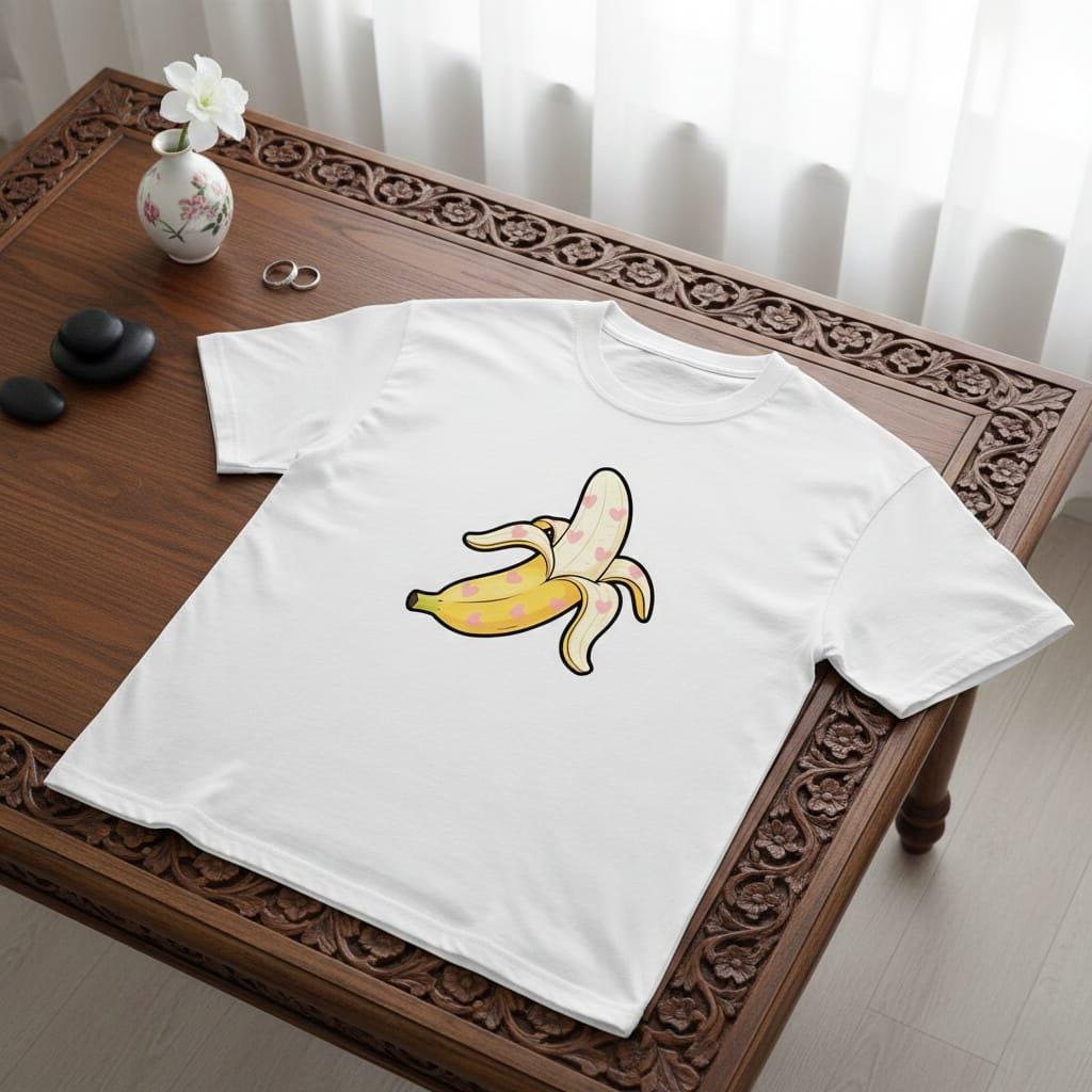 - Features a unique heart banana motif combining kawaii food art with fresh summer energy