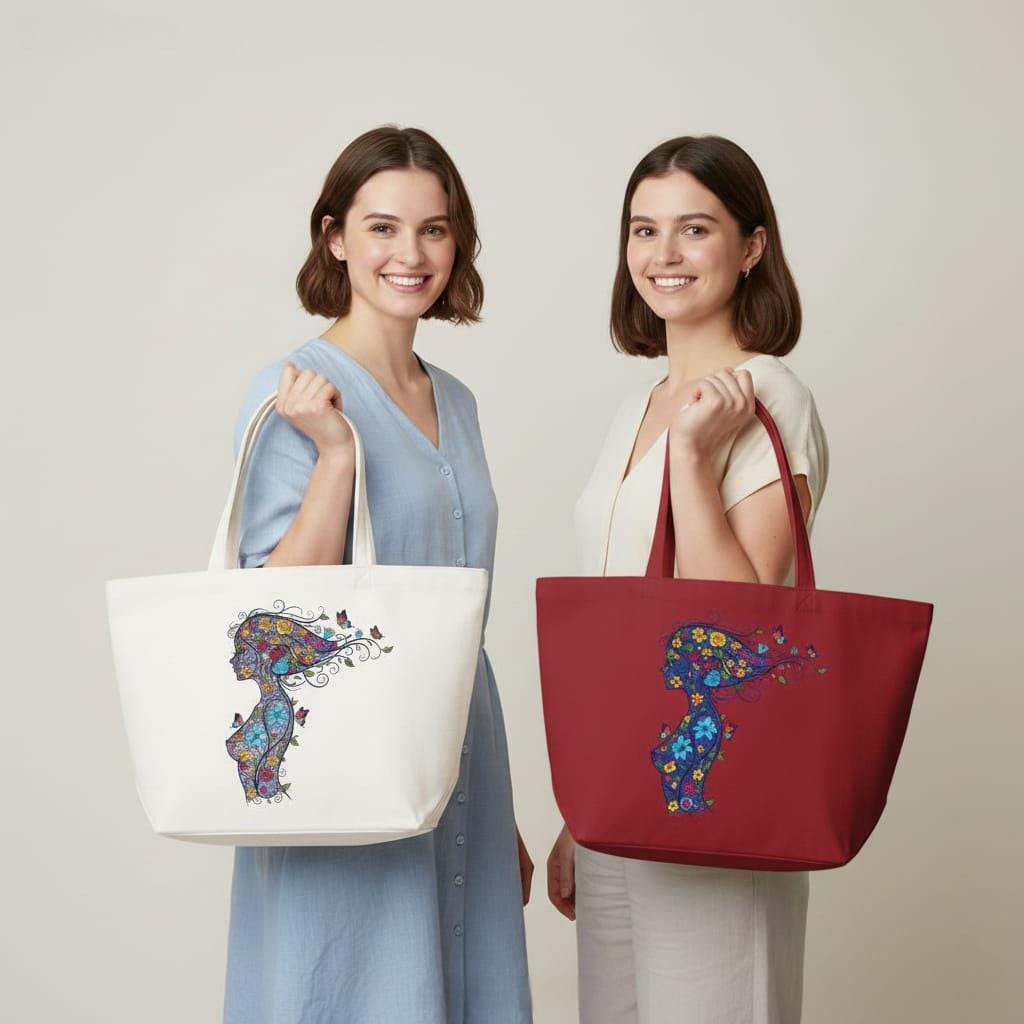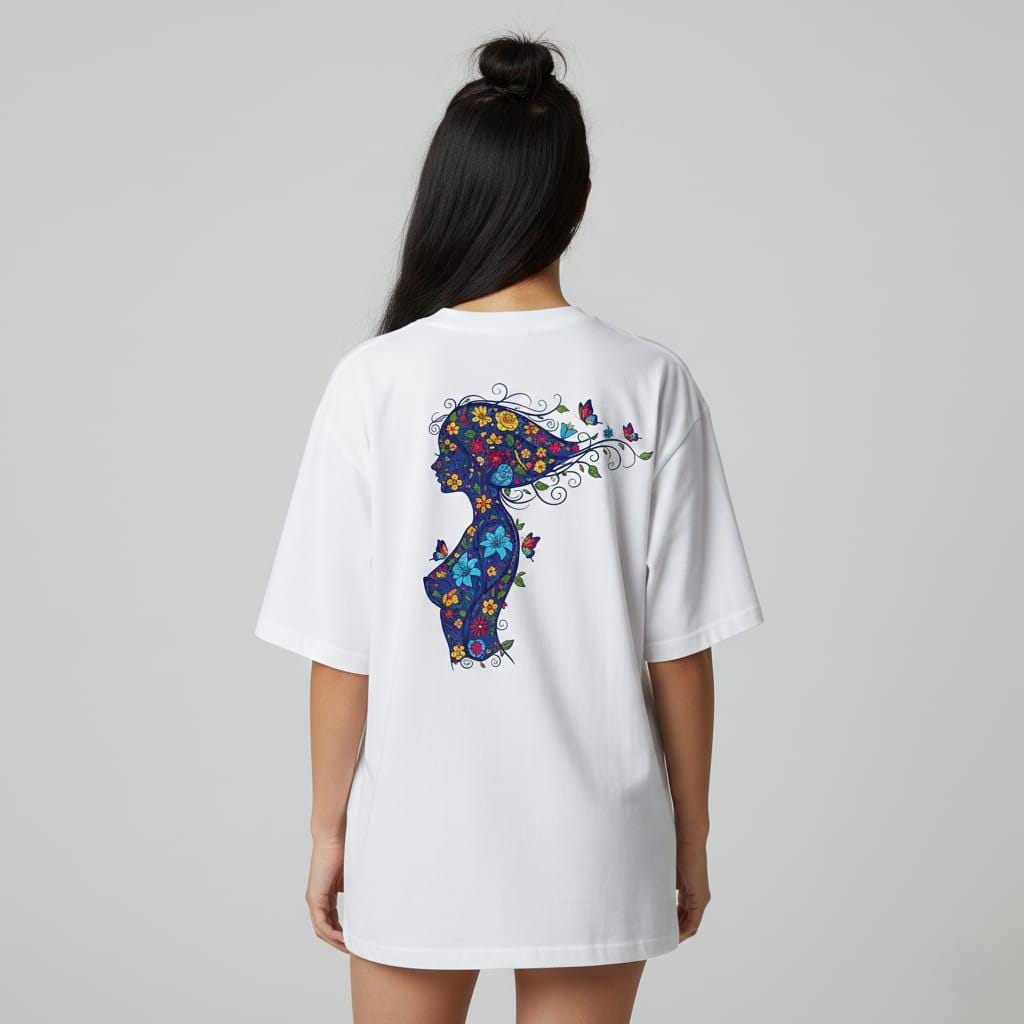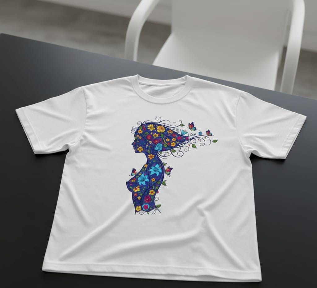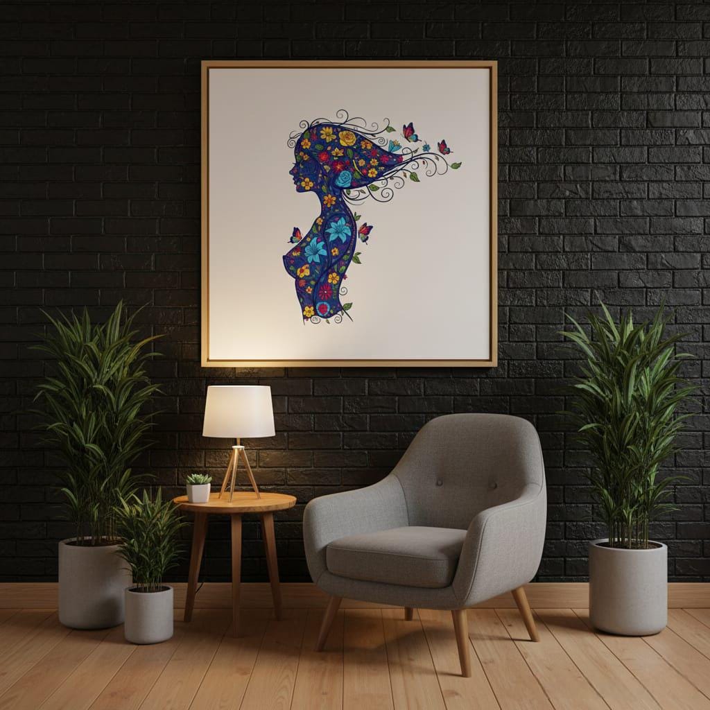 - Features a graceful woman silhouette filled with sunflowers, roses, lilies, and playful butterflies in royal blue, sunny yellow, and vivid red