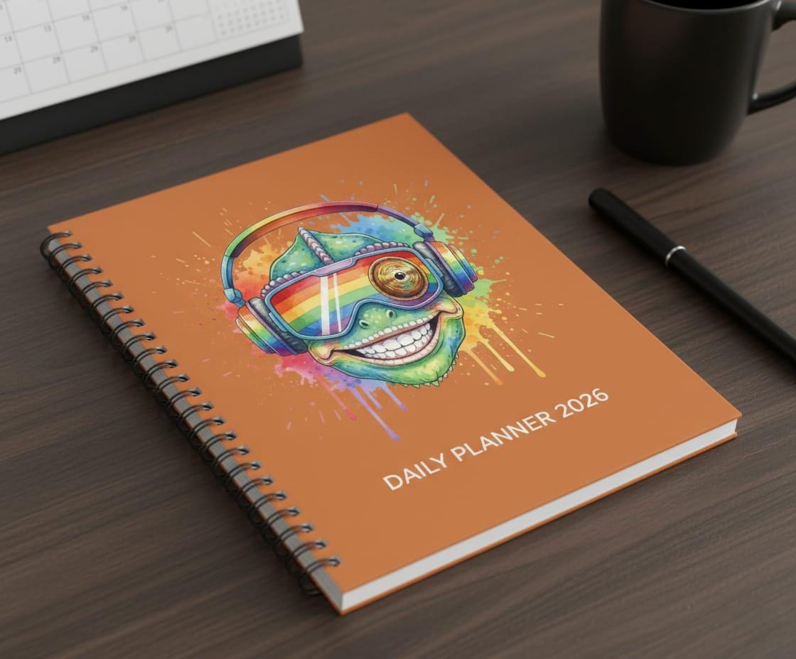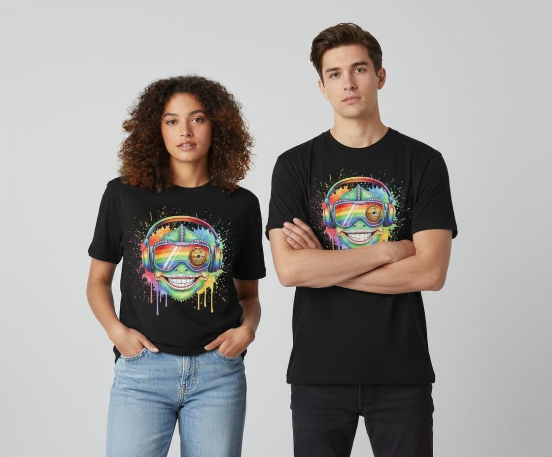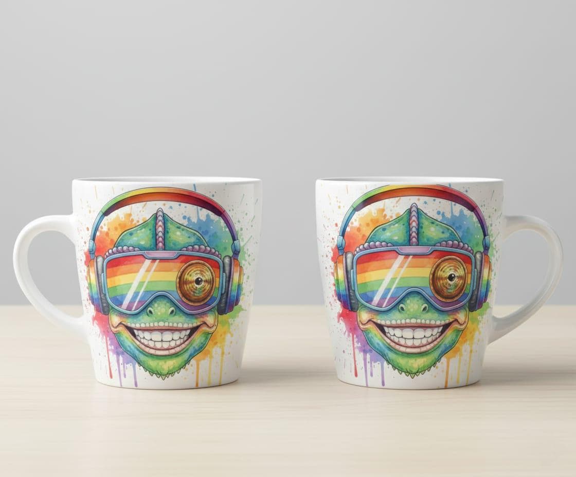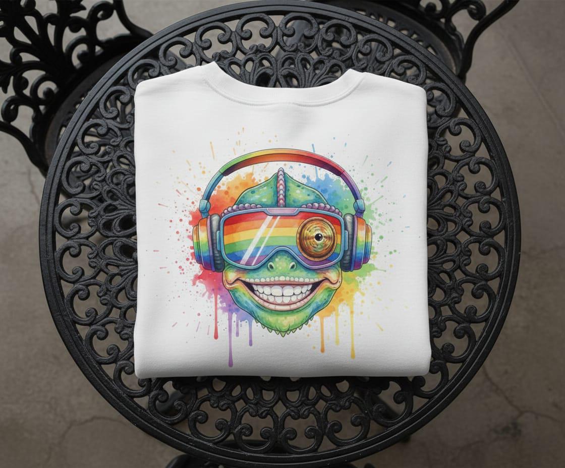 - ✅ Features a green chameleon wearing rainbow-colored headphones and psychedelic goggles with hypnotic swirling eyes