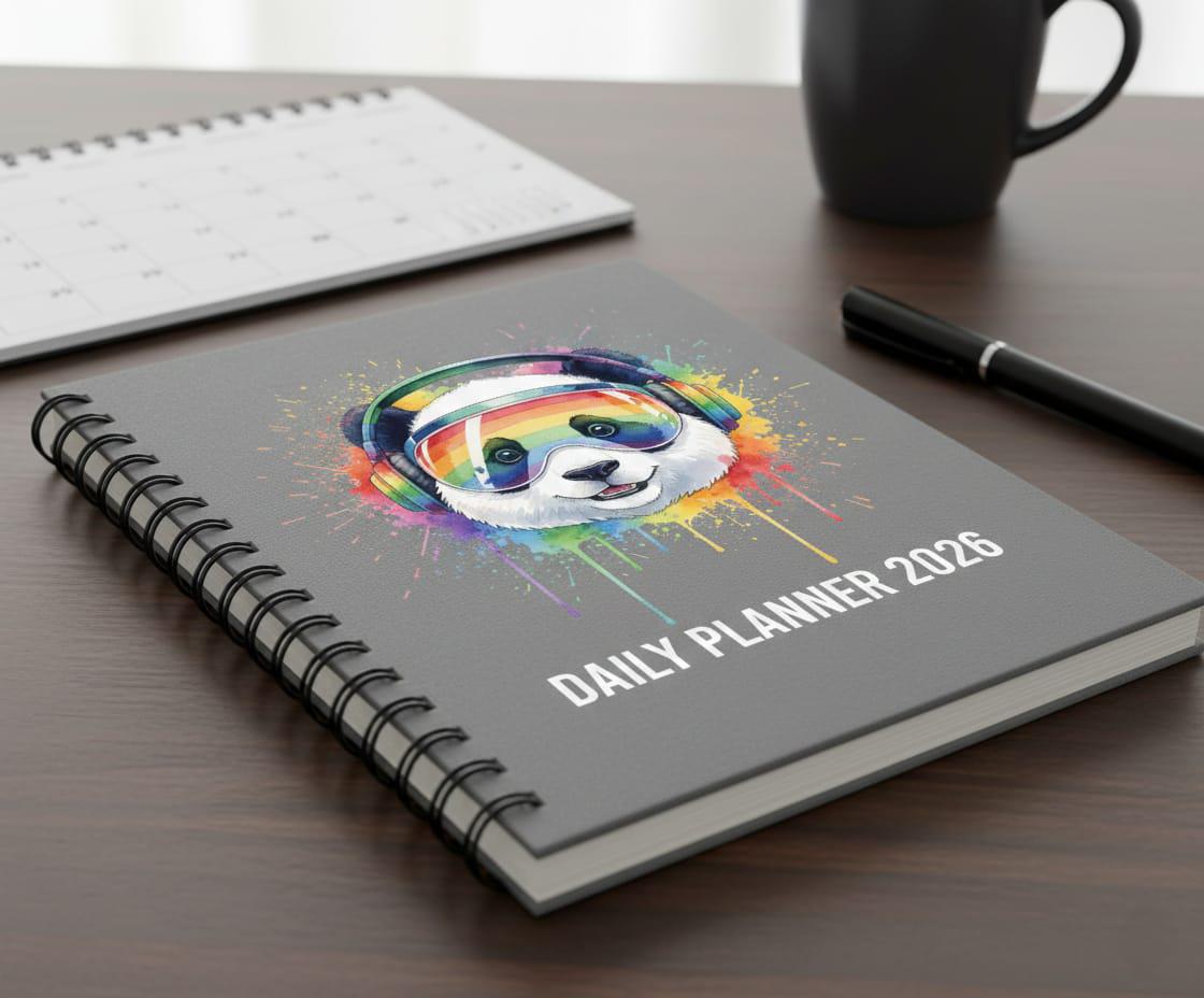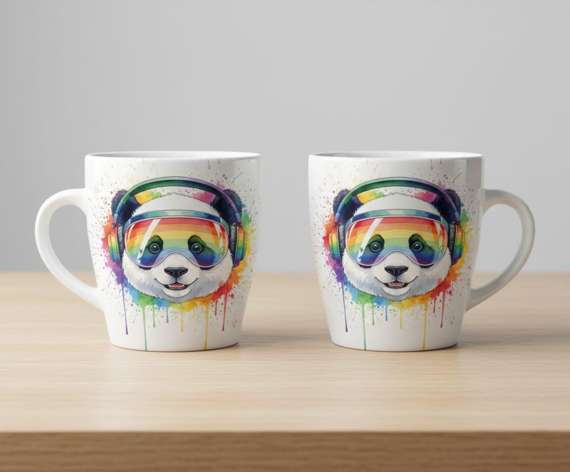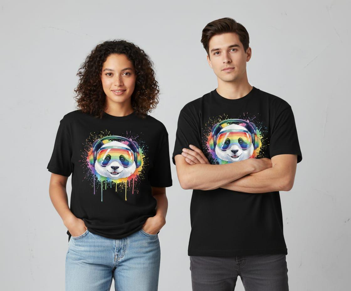 - ✅ Features a smiling panda with rainbow headphones and watercolor drip effects