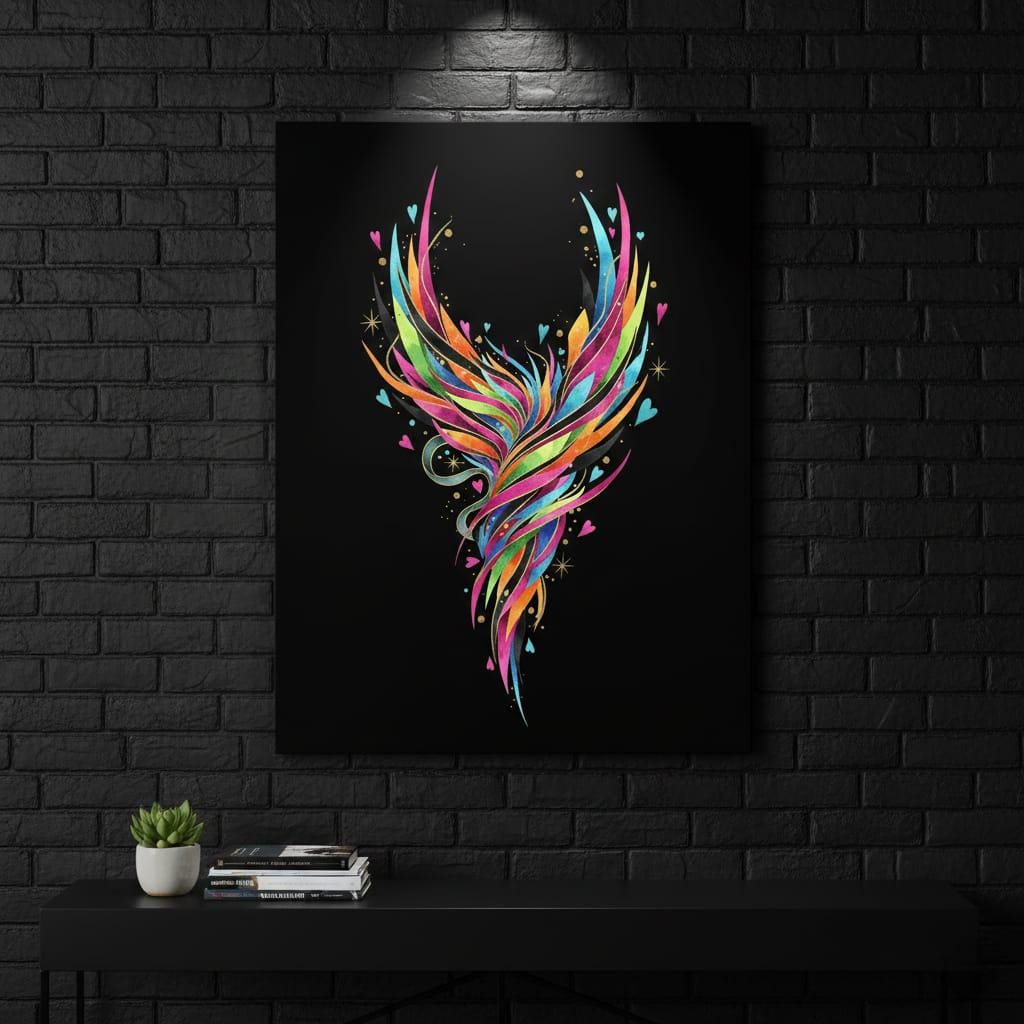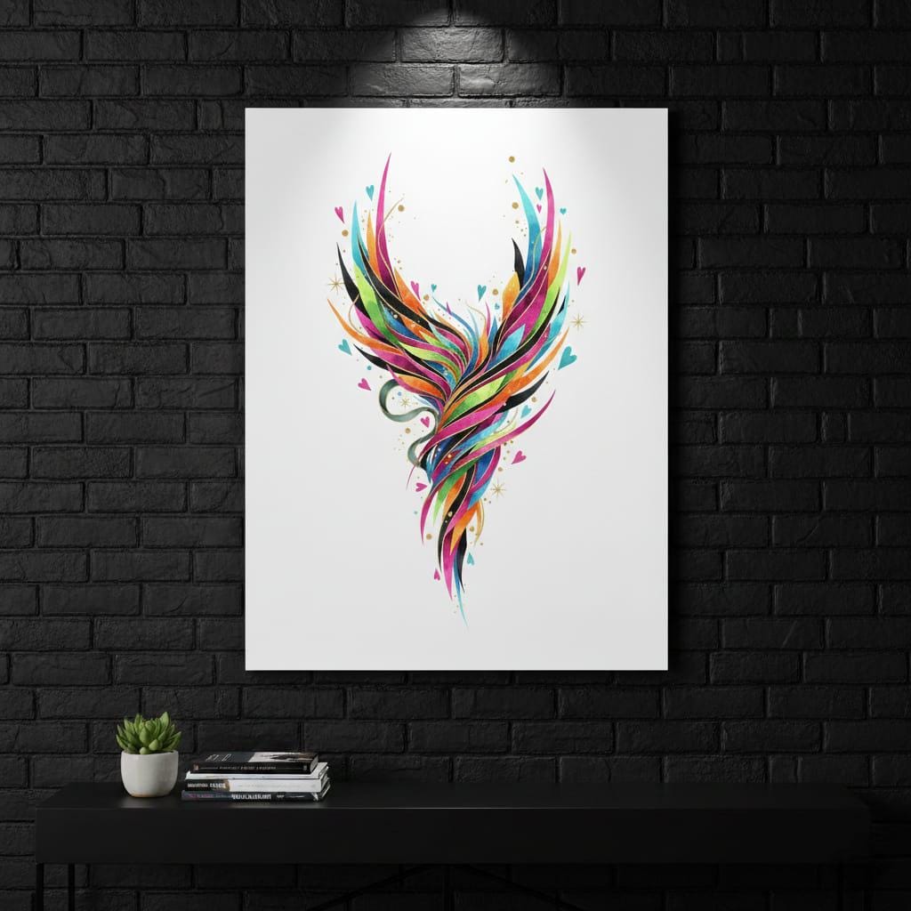 - ✅ Features a dynamic phoenix illustration with magenta, turquoise, and sun-kissed orange watercolor strokes