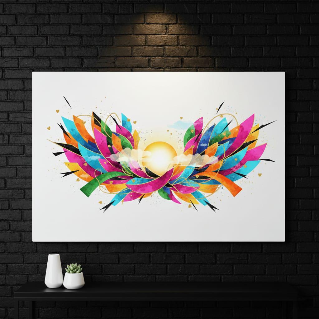 Immerse yourself in the uplifting energy of this vibrant sun PNG, where abstract wings and gold heart art come together to create a captivating celestial decor piece. Inspired by the colorful horizon at sunrise, this design blends magenta, turquoise, and sun-kissed orange hues for a boho sun art that radiates warmth and joy. Perfect for adding summer vibes and radiant wall art to your creative projects, this digital download invites you to celebrate new beginnings with every use.