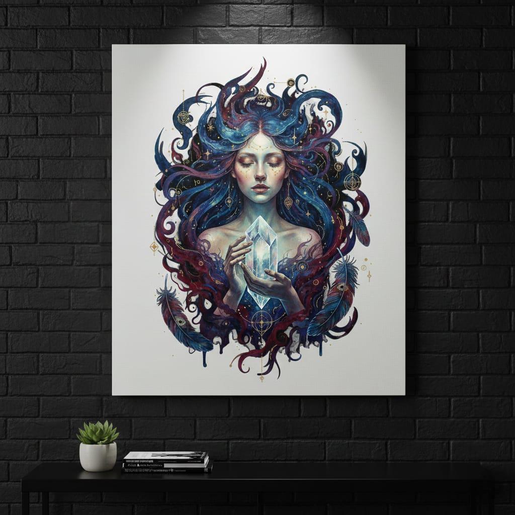 Immerse yourself in the serene energy of this mystical woman, captured in a celestial art piece that radiates spiritual depth and cosmic wonder. Inspired by divine feminine power, this digital download features a goddess cradling a glowing crystal, surrounded by sacred geometry and shimmering stars. Whether you seek a captivating oracle art or a unique sublimation design, this artwork invites you to connect with higher consciousness and manifest your inner magic.